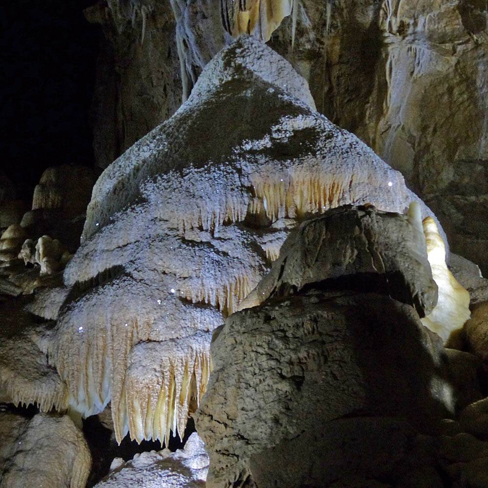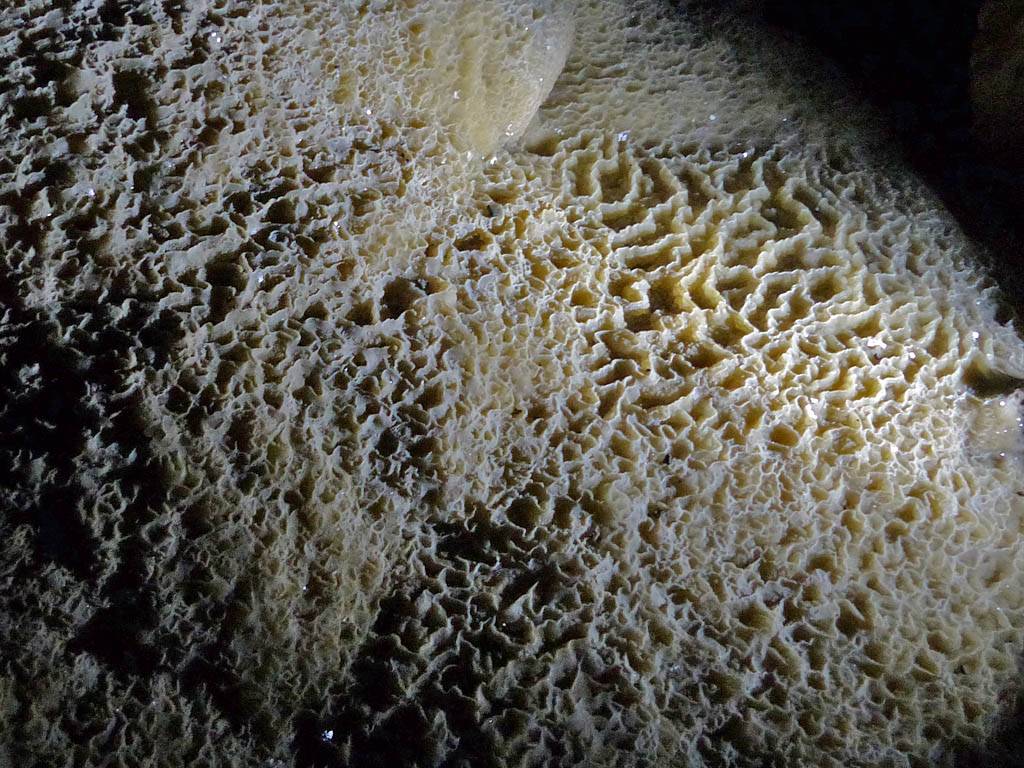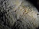 Sparkly formations with a hint of a face and ones that look like beehives. | This section of cave is low and has a whole forest of stalactites and stalagmites. | Some rocks have taken on delicate and intricate coral like formations. |