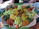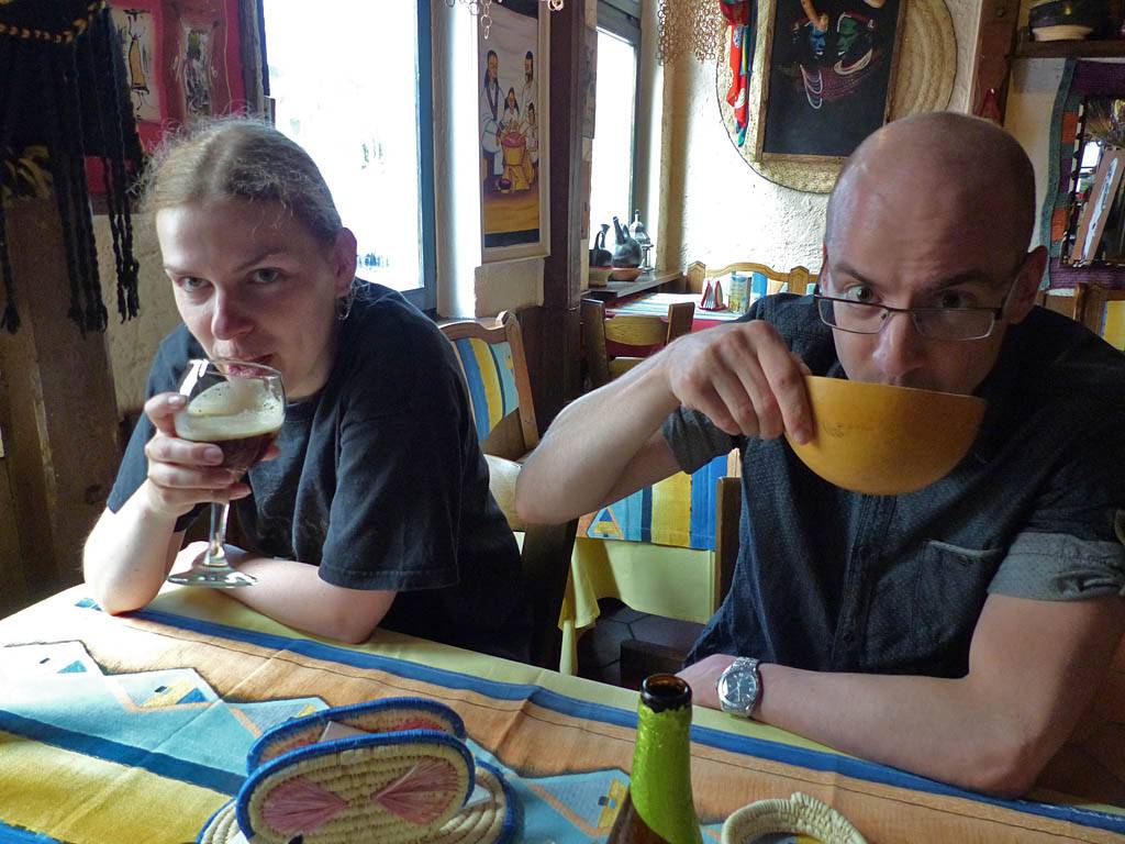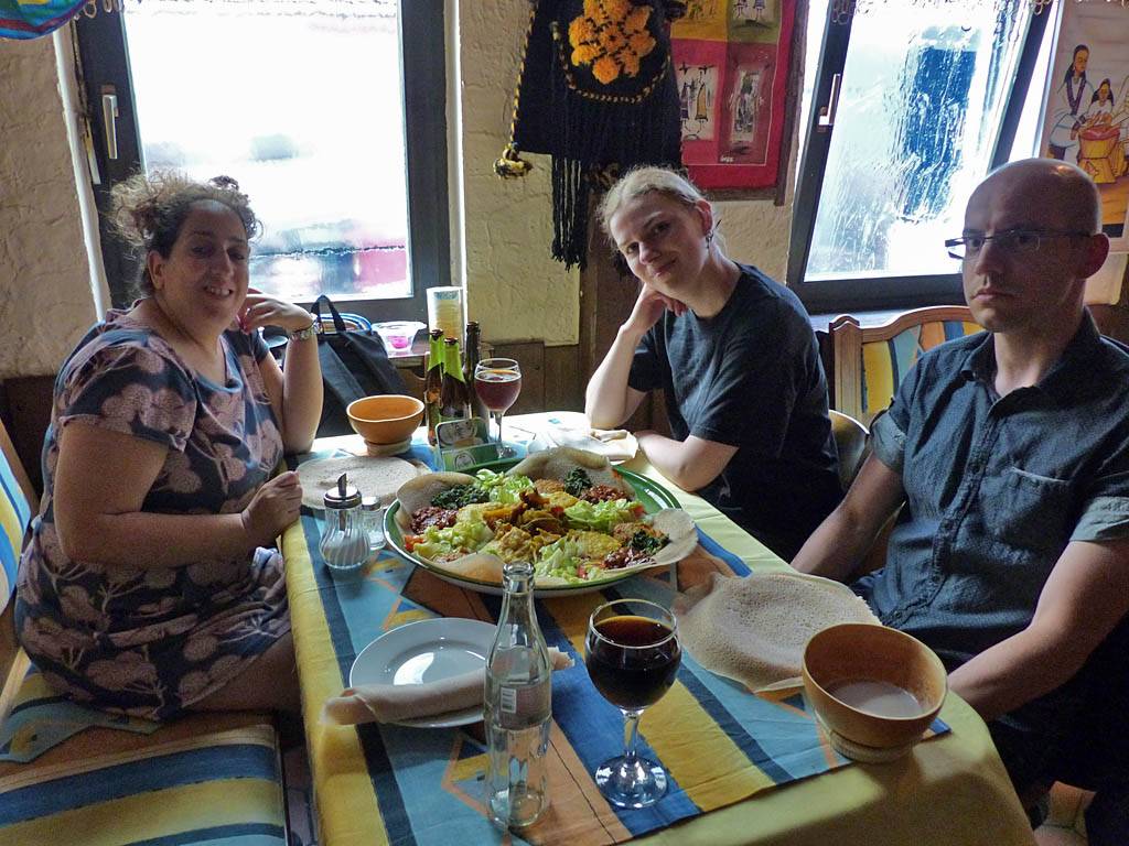 We left at 5PM for the station and caught the 17:09 train to Giessen, arriving at 5:37PM. We walked to the Mama of Africa restaurant, getting there at 5:55PM. We were glad that conditions were refreshingly cooler than last time we came to Giessen. Mathis arrived after a minute by bicycle and we went in together. Inside was rather nice decor that gave us the African / Ethiopian feel alright. Based on Dagmar's recommendation we all went for the 'Mama of Africa Maadi' dish. It was an all you can eat vegan dish where we had chickpeas, lentils, aubergine and spinach dishes with potatoes and salad served on a flat bread. We used the bread as our cutlery to scoop up the dishes and eat them. It was very tasty although the bread wasn't to my taste. When we had our fill (only one refill needed) we ate the bread plate. We were full by 7PM when the dish was cleared. After paying up (Renée kindly bought to treat us and say thanks) we left at 7:20PM.