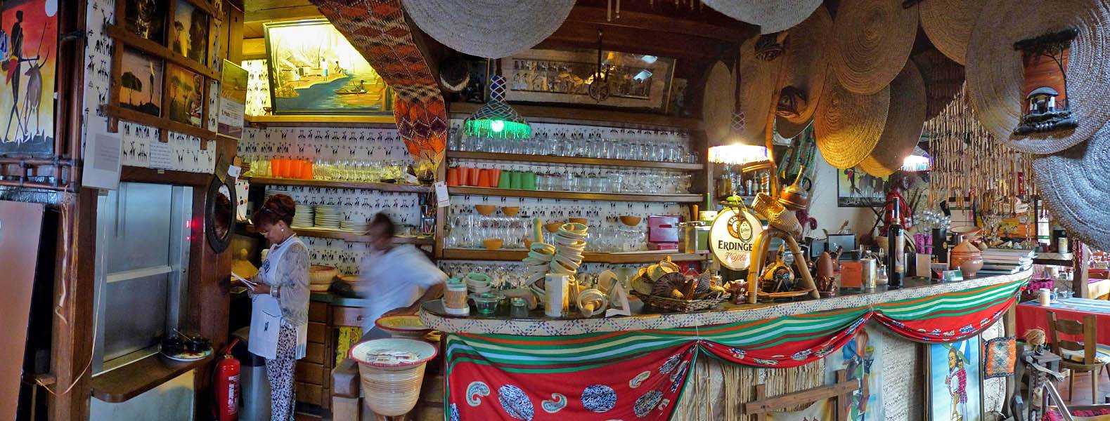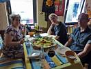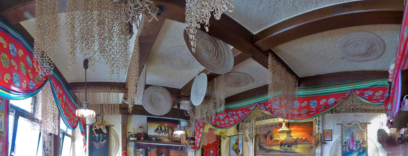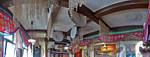 A view of the restaurant decor. | Food is served! | Renée, Dagmar and Mathis preparing to tuck in. | A quick panorama inside the entrance before we depart after the meal. |