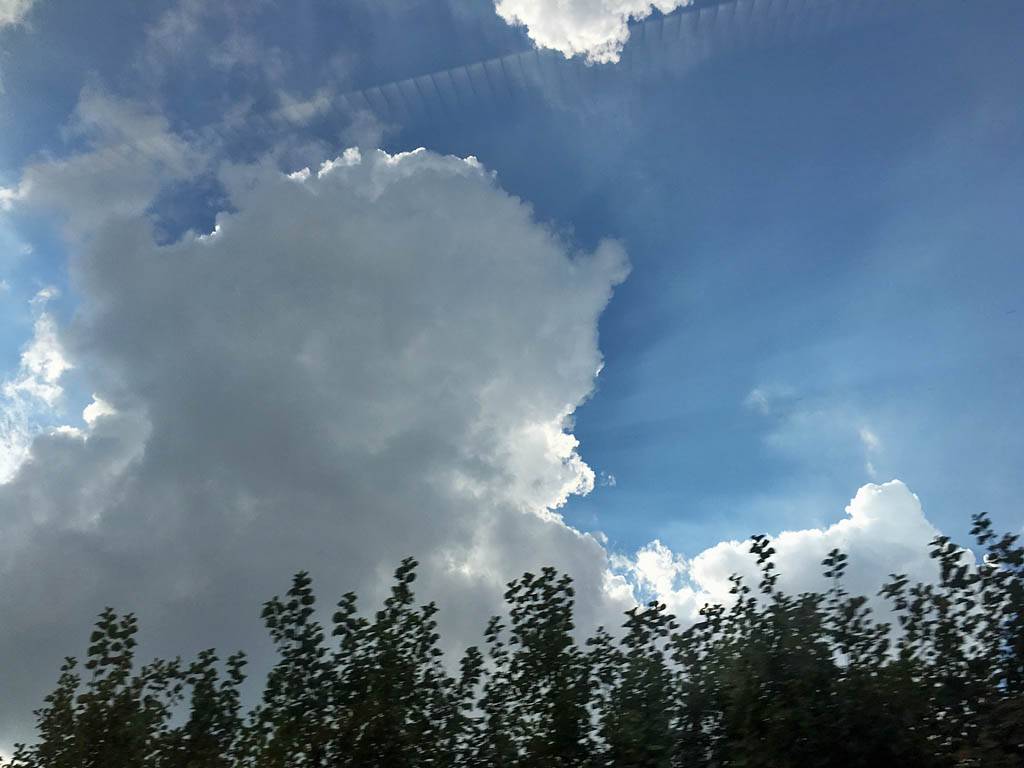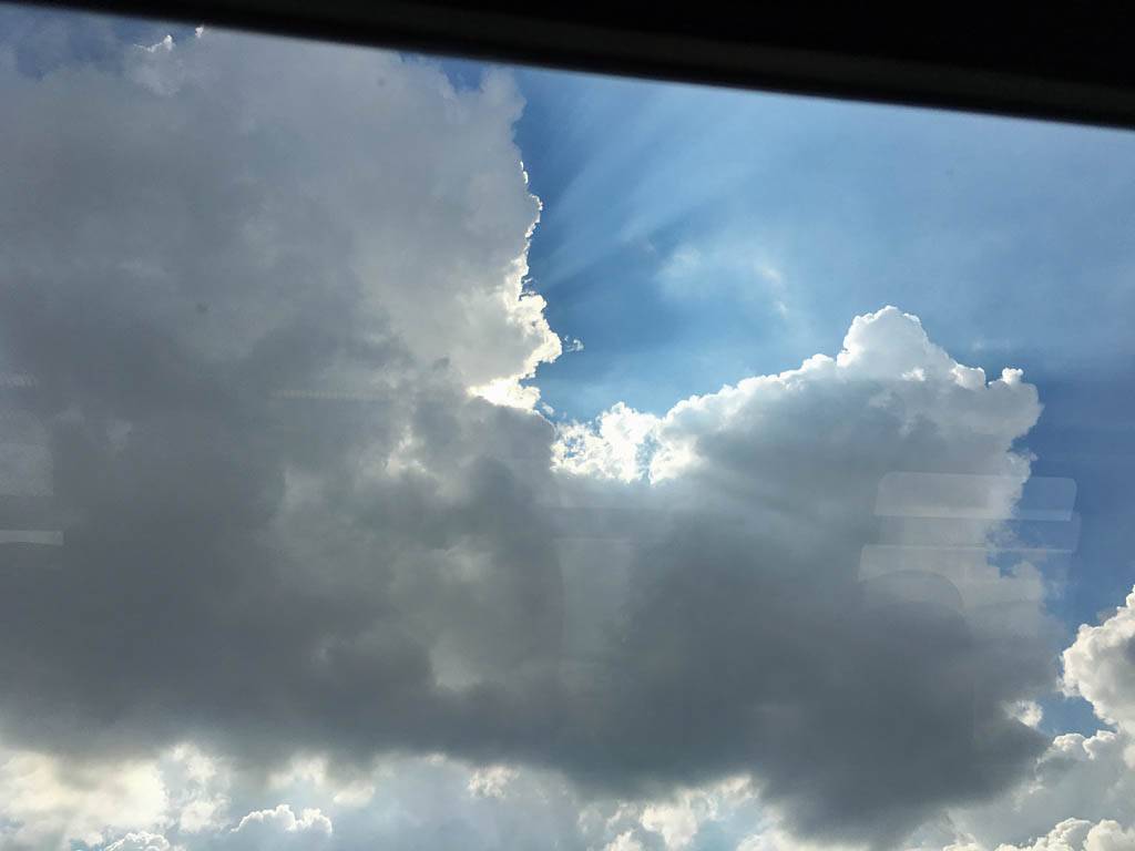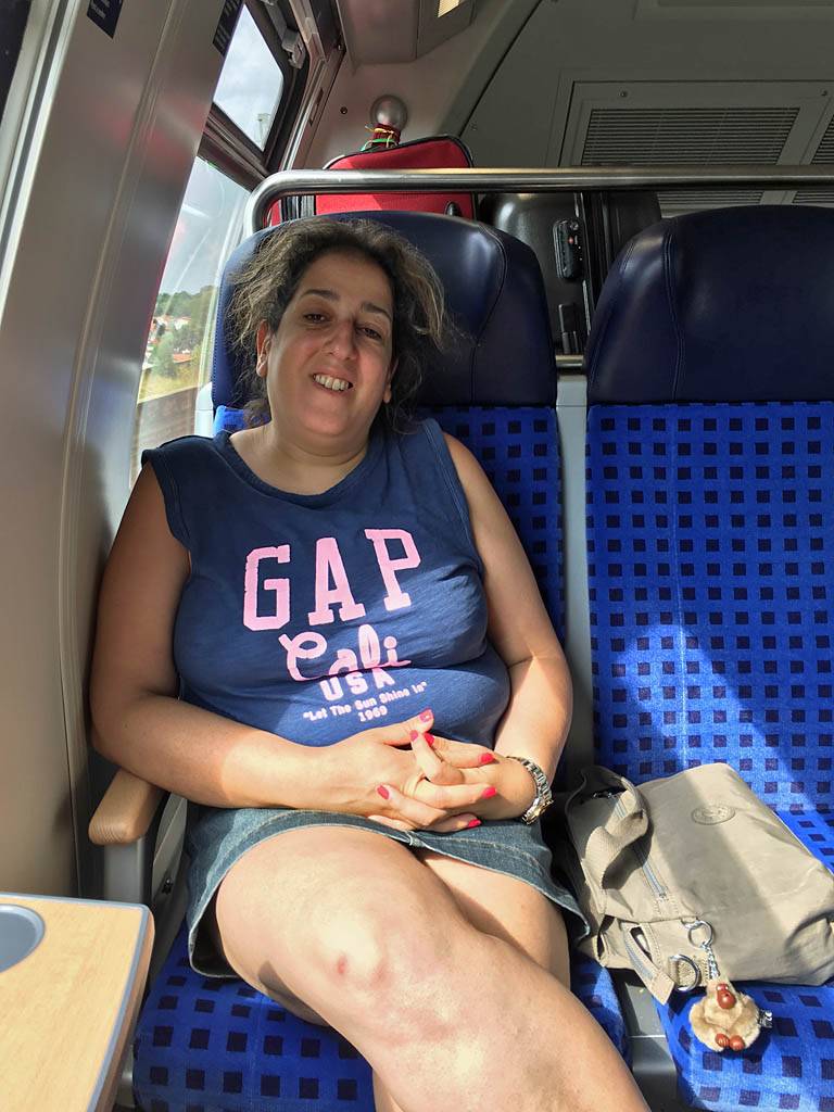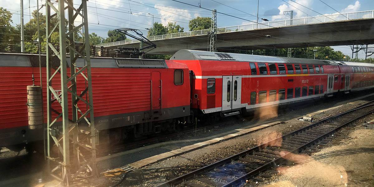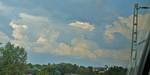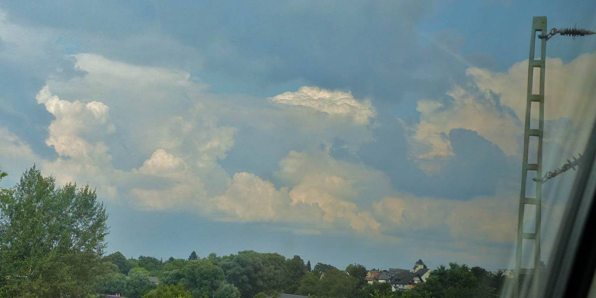 One of the double decker trains. Our one looked identical to this one. | Spectacular cloudscapes on the journey to Frankfurt. | Renée enjoying the double decker train journey to Frankfurt. | Behind us big thunderstorms were brewing. |