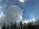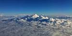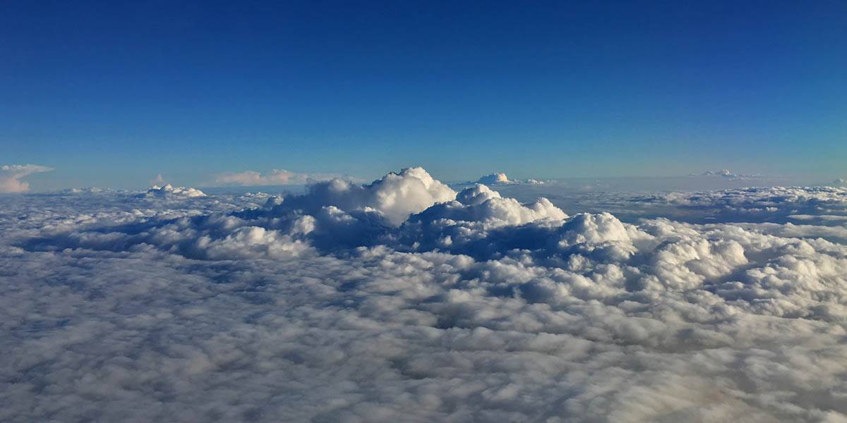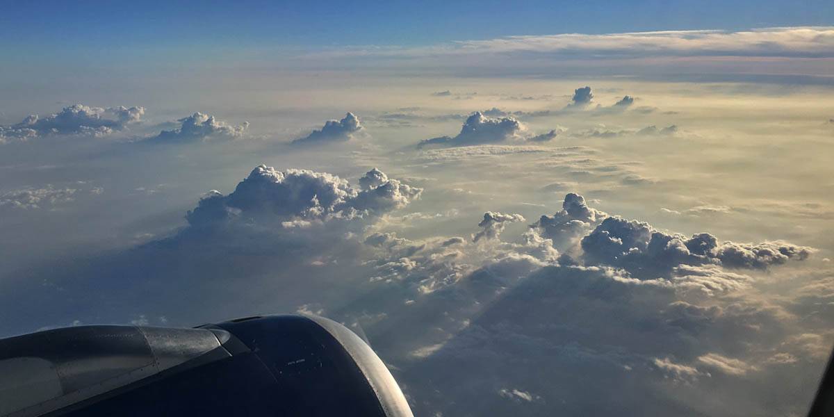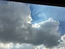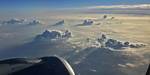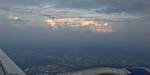 Building thunderstorms behind another British Airways jet. | The view of one of the thunderstorms as we take off from a hazy Frankfurt. | Between cloud layers. | The view above the upper cloud layer with shower clouds punching their way through the top is outstanding. |