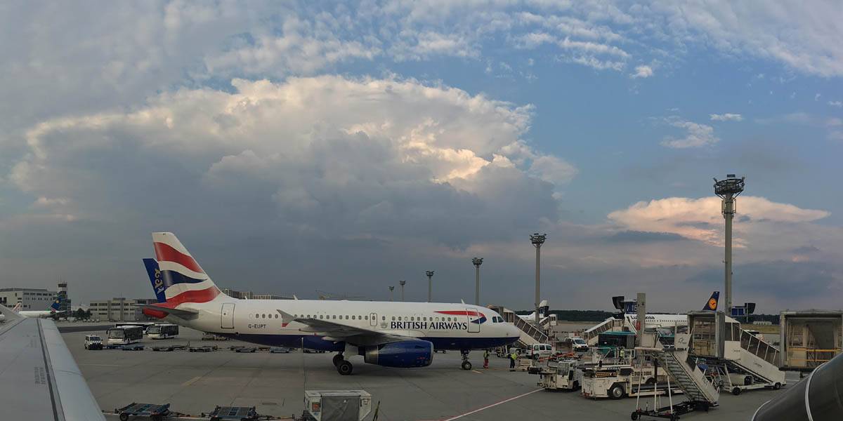 Once off the train at the airport it was a simple case of following the signs for Terminal 2 which led us through Terminal 1 and up several escalators to a monorail. This whisked us to Terminal 2 and to an almost empty British Airways checkin desk. We soon dropped off our bags and went through passport control. The shops were rubbish and food selection limited but we ended up at a Japanese restaurant called MoschMosch which was just like Wagamama. Then we went through another layer of security to the gate. Before long at 7PM it was time to board. A quick bus ride took us to the stand where the aeroplane was. Boarding was smooth and despite the checkin staff suggesting the plane was 10 minutes late, we actually appeared to complete boarding 5 minutes early. Meanwhile I was watching spectacular cumulonimbus clouds out of the window before we set off.