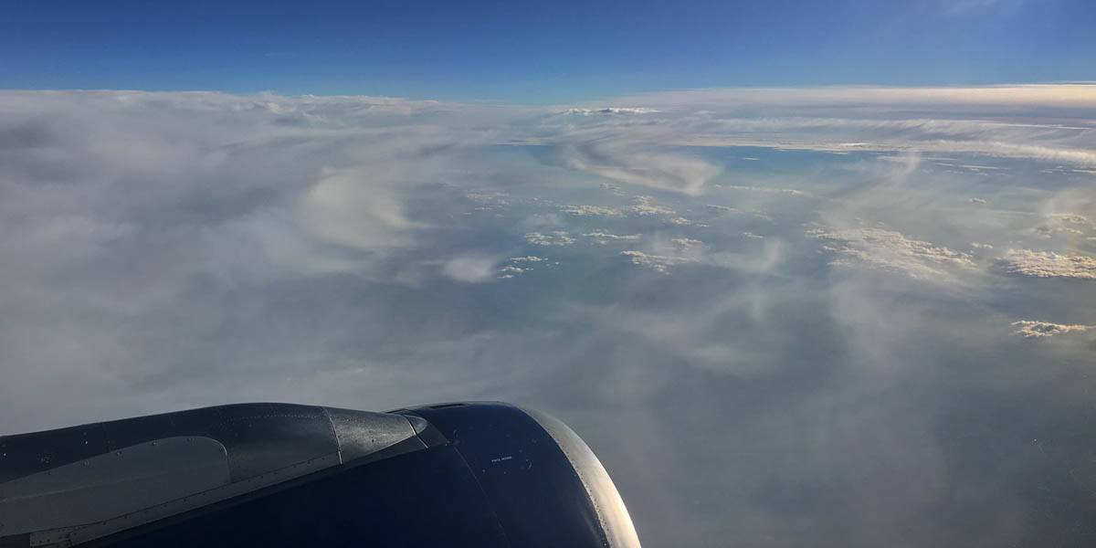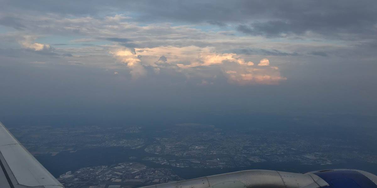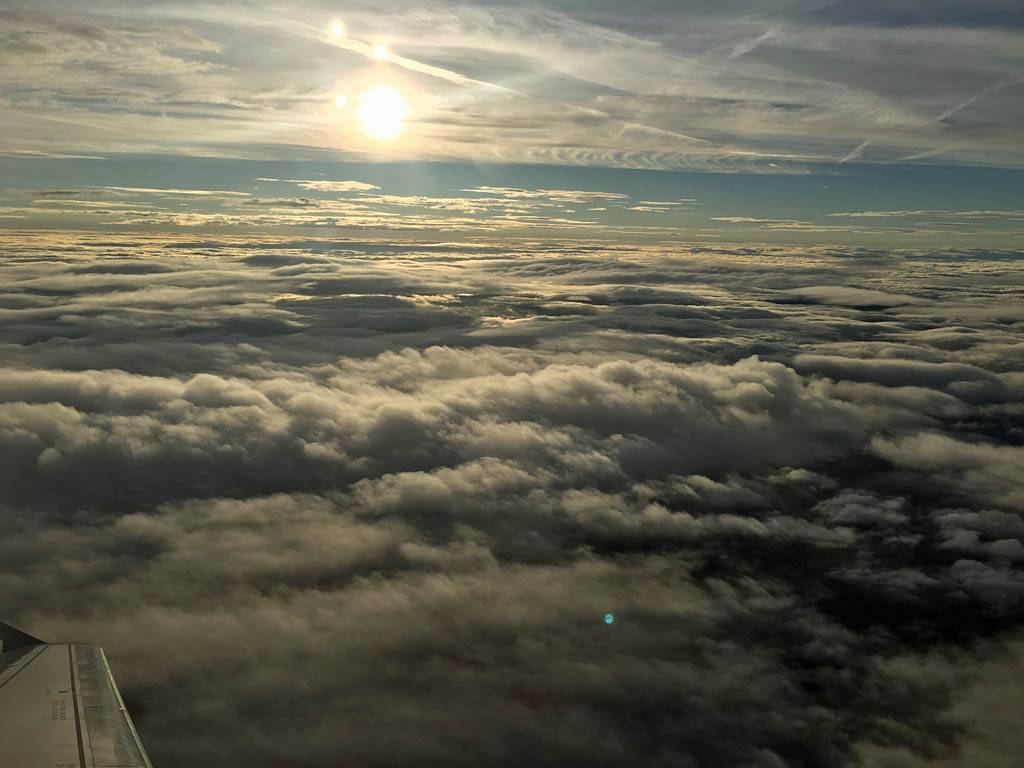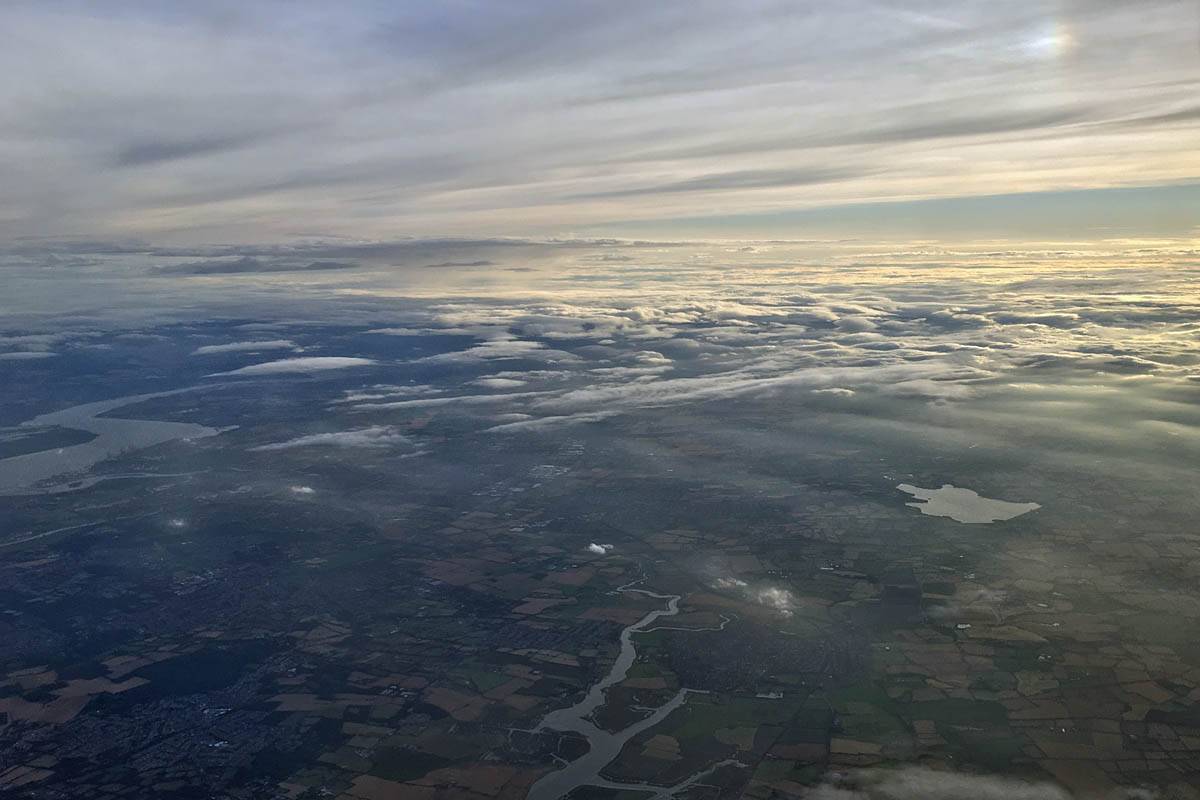 The cloudscapes en route were stunningly beautiful as we went past German hazy showers and then over Belgium in cirrus cloud there were nice optical effects, including a bright sundog and a complete parhelic circle. Out past Brussels and Bruge and over a calm North Sea the sky was clearer as we started to descend. Once we got to London there was thick cloud cover below but on top of it were lovely wavey clouds which again were epic to watch as we flew past and eventually down into before we landed 15 minutes early.