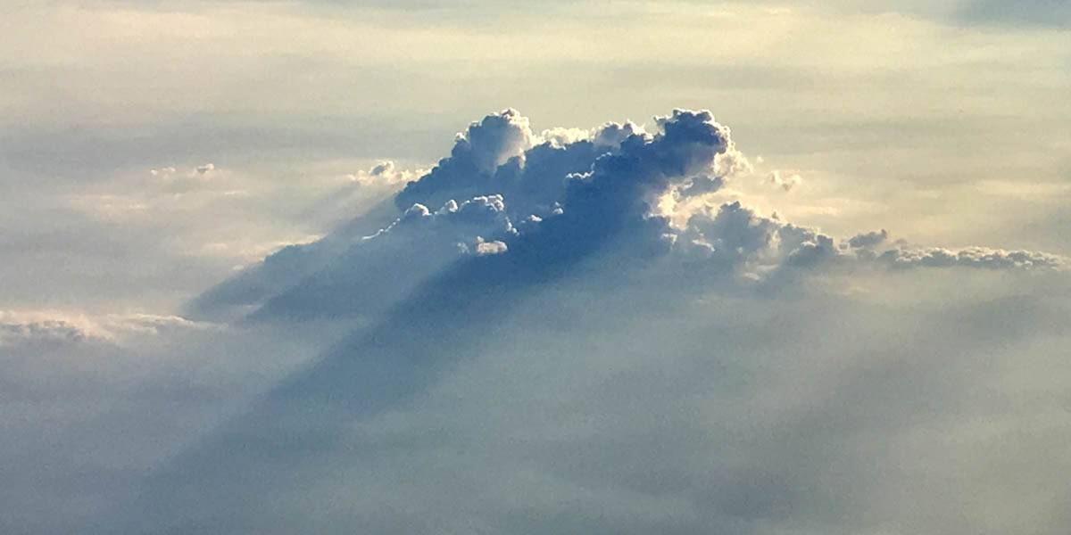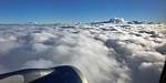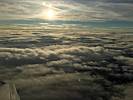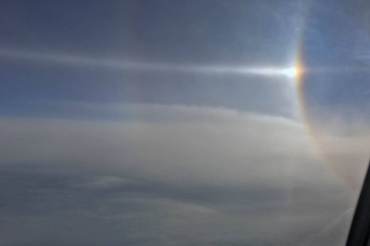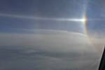 Higher up the haze and cloud towers and low sun makes for a very dreamy sight. | Flying through thin cirrus, a sun dog, 22 degree halo, a complete parhelic circle and a faint 46 degree halo are revealed. | Flying above virgae somewhere over Belgium. |
