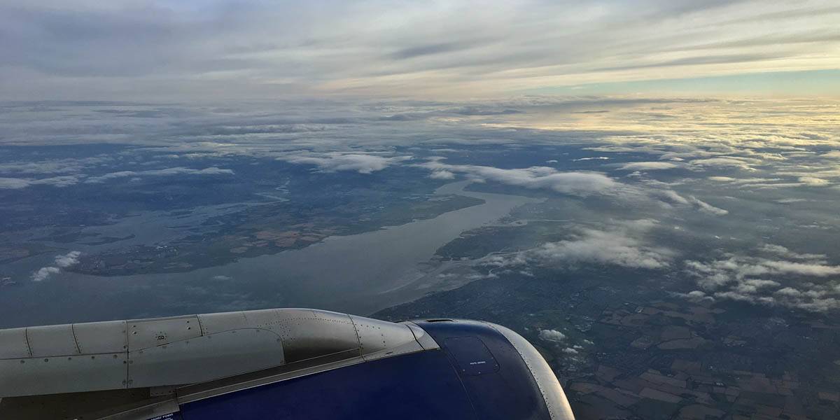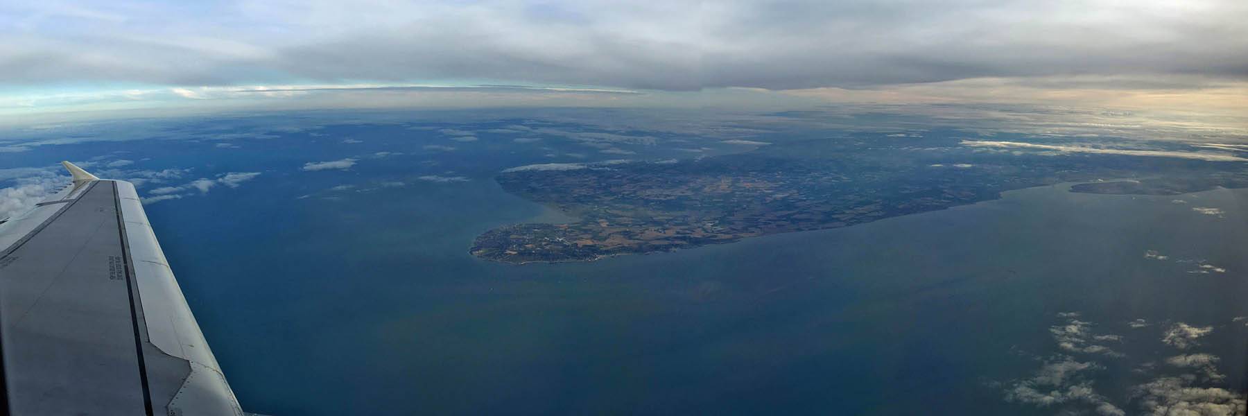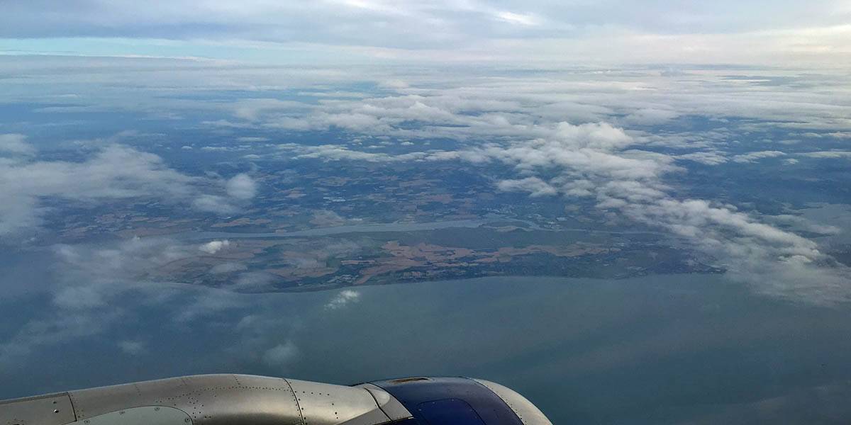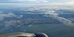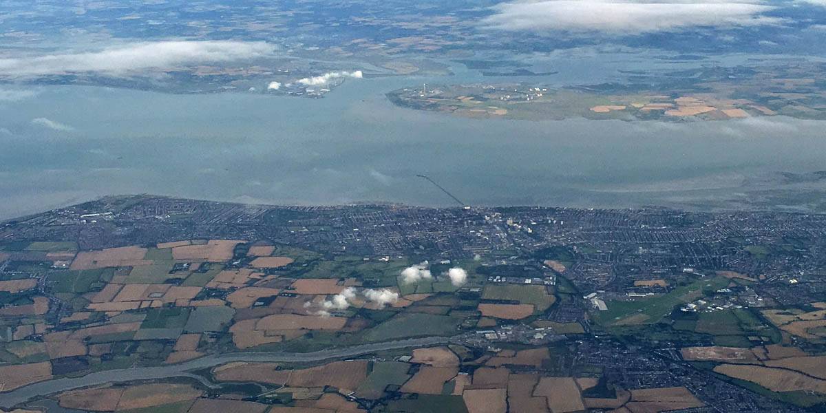 The sky clears dramatically as we approach and cross the Belgian Coast (Ostend is just in front of the engine). | Northeast Kent with Margate near the tip as seen from the Northeast. | The Isle of Sheppey from the Northeast. | The Isle of Grain, River Medway and Thames Estuary as seen from over Suffolk. | In the foreground is the River Crouch. Thames Estuary far left. Hanningfield Reservoir to the right. Looking Westwards towards a spectacular cloudscape. |