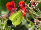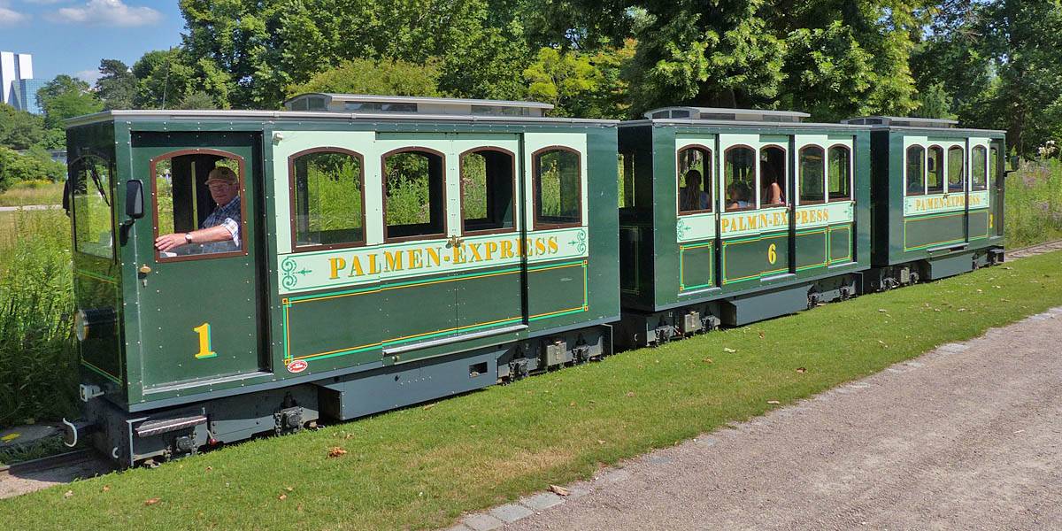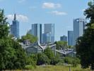 Walking around the Playing Field towards Haus Leonhardsbrunn at the North end of the garden. | A Male Brimstone butterfly. | A nice framed view of the Frankfurt skyscrapers. | A passing Palmen-Express train. | A tree with bright red bark. |