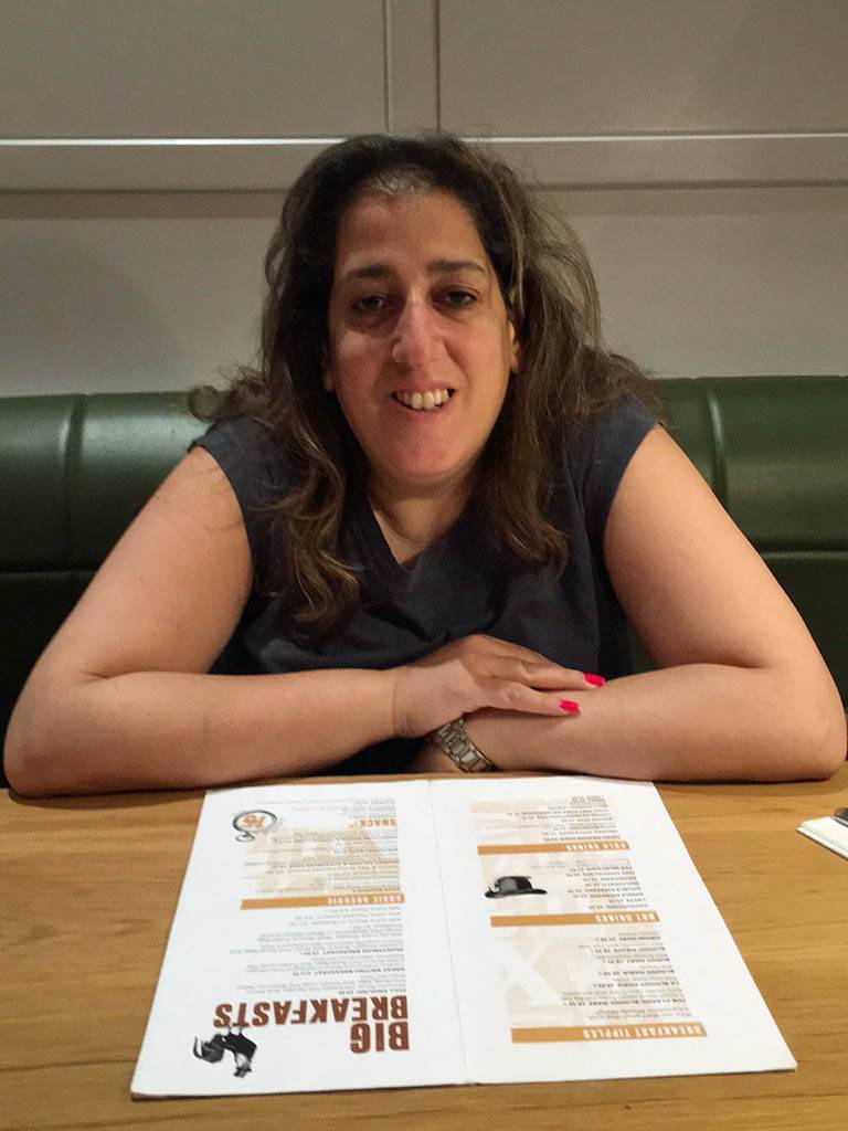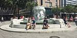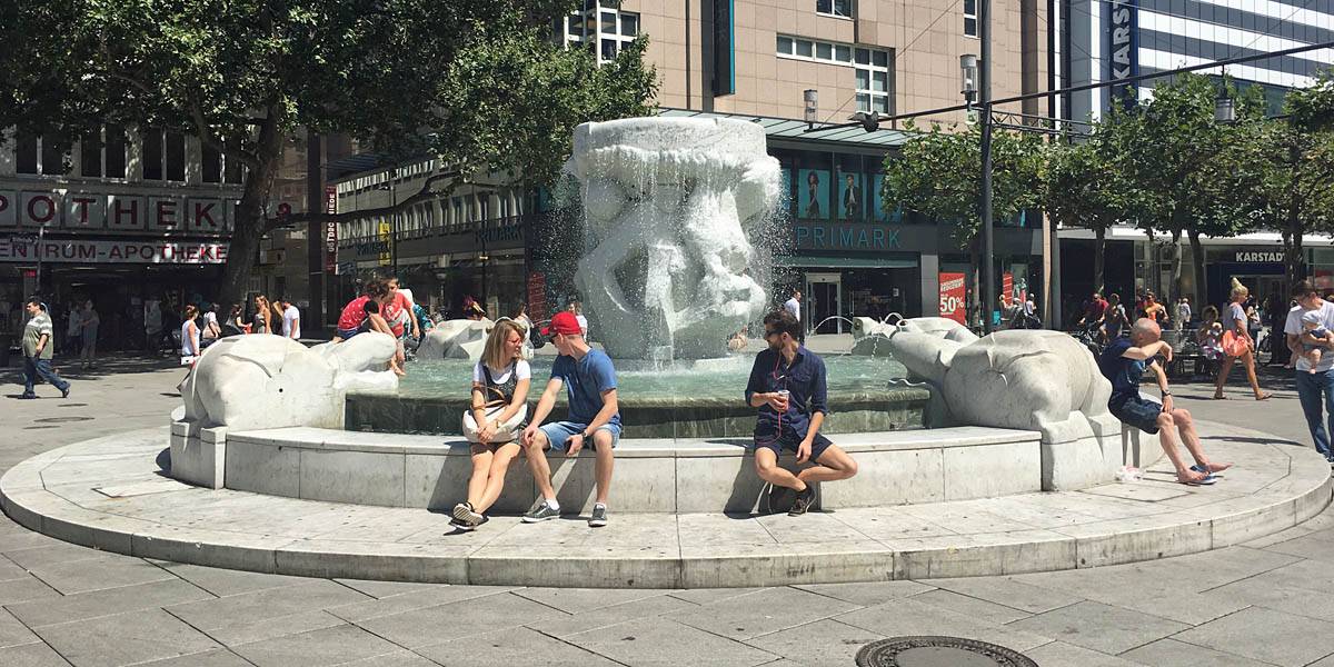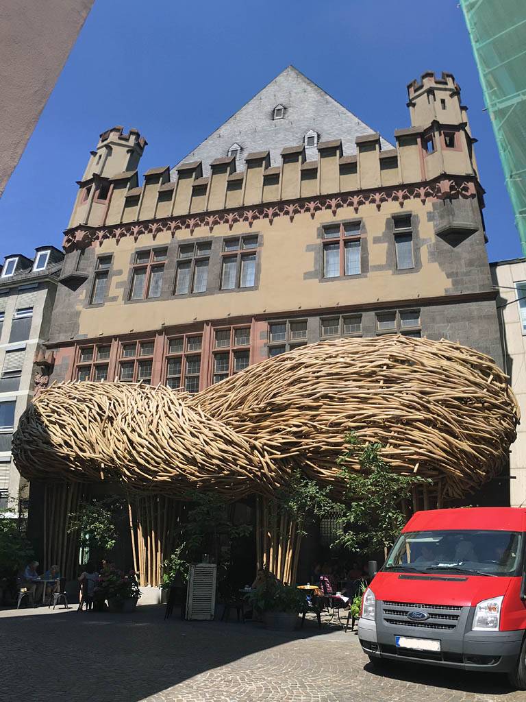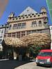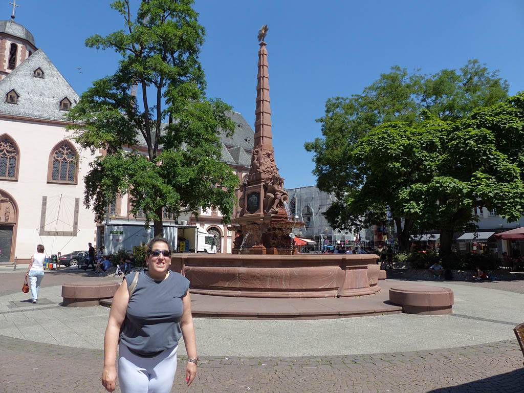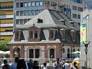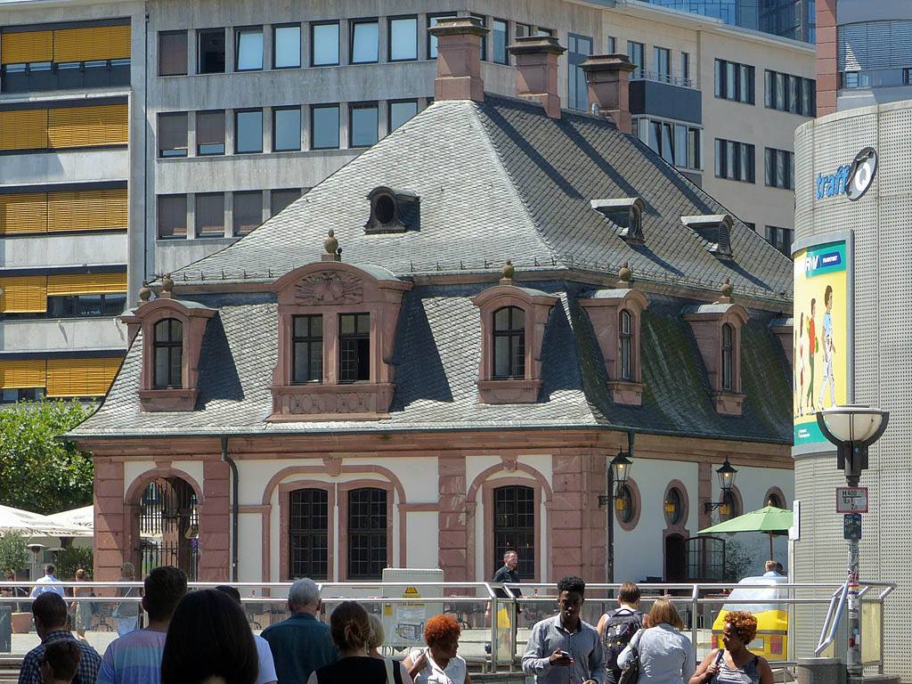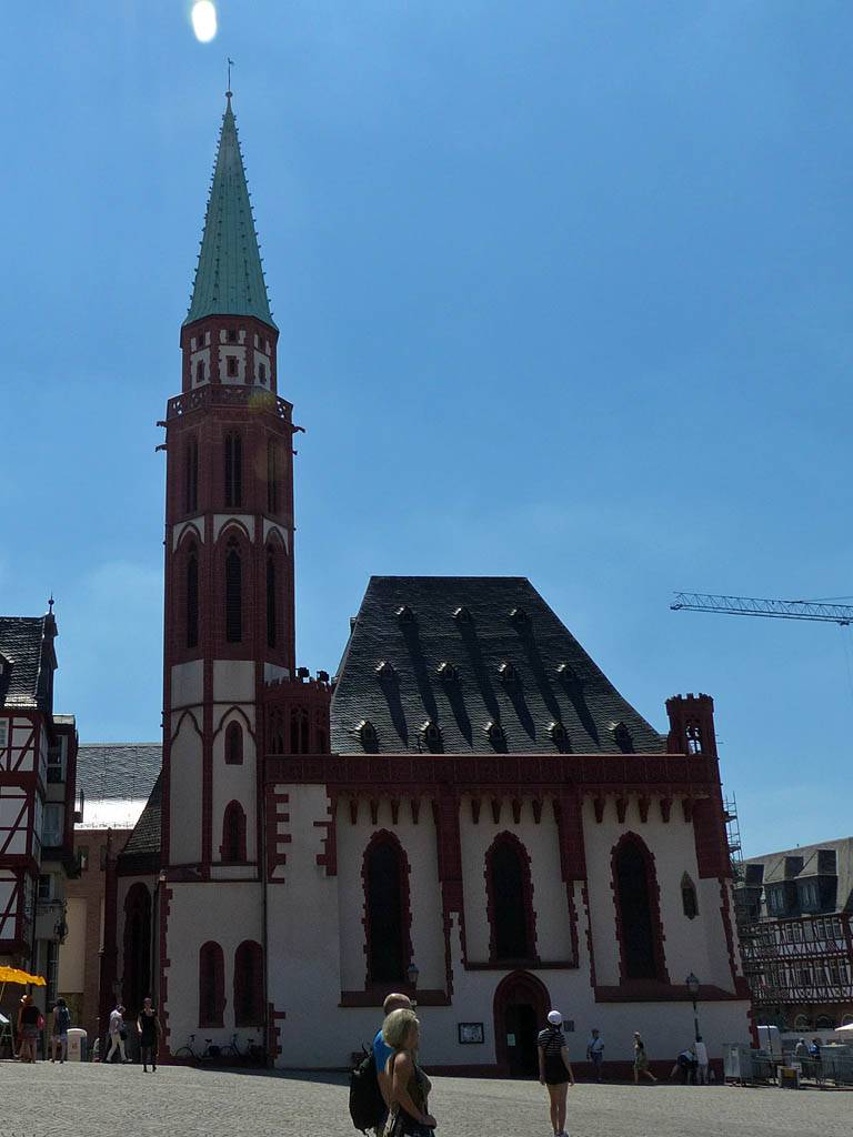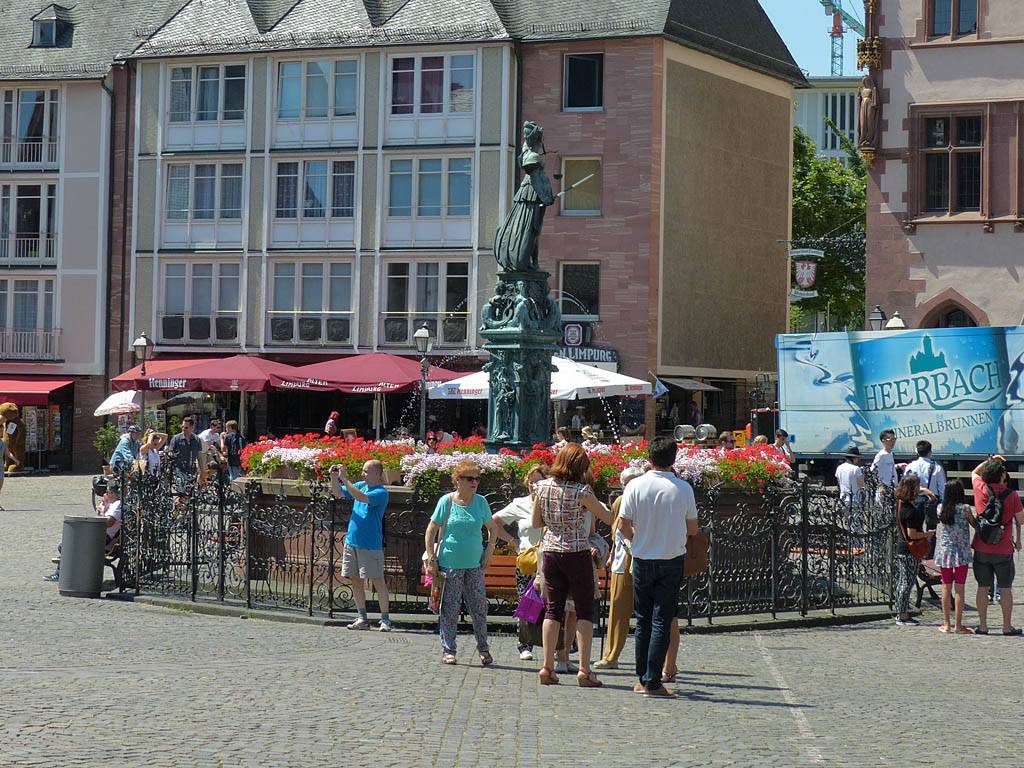 Renée on a U6 subway train from Westend to Konstablerwache. | Walking along the North side of the square at Konstablerwache. The shade of the trees was handy in the hot sunshine. | The fountain at the junction of Zeil and Hasengasse / Stiftstrasse. | South of the fountain several blocks was Frankfurt Cathedral. | A curious looking cafe / restaurant just East of Römerberg. |