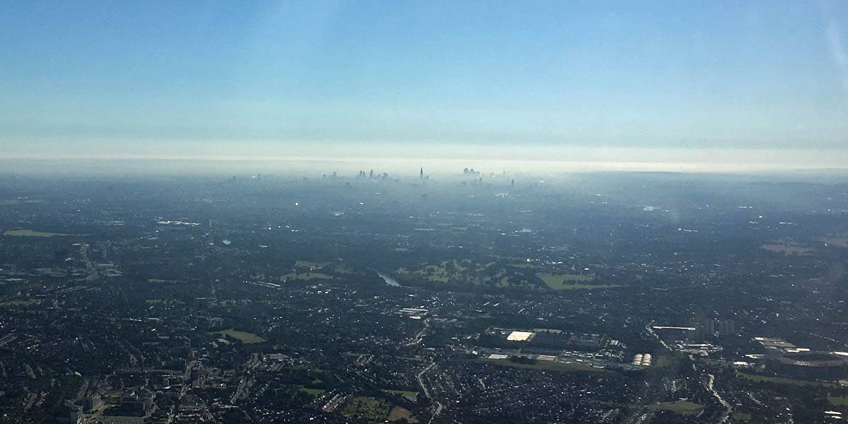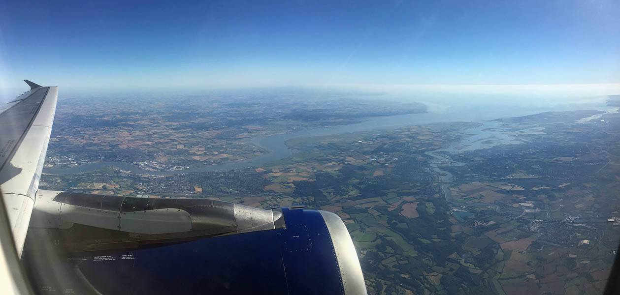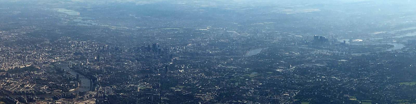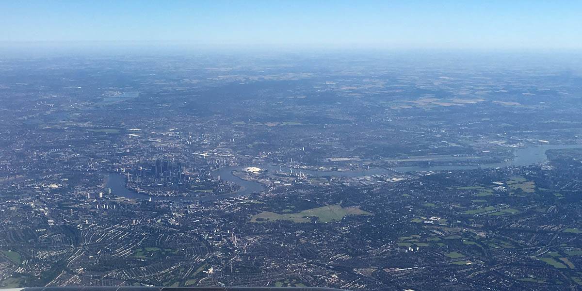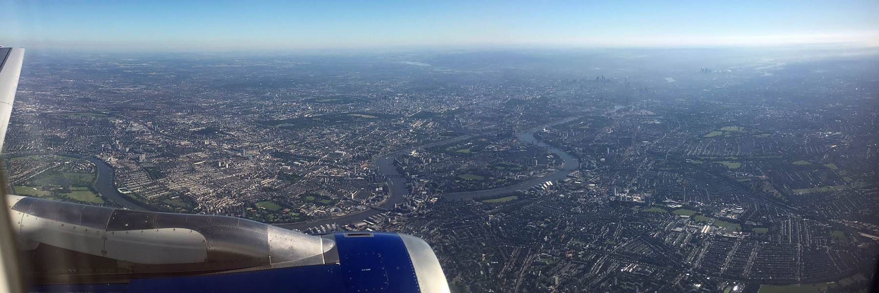 Passing Central London. I only just noticed the stitching error in the first panorama. The other two is much better with the London Eye and the Docklands visible. | Pushing my iPhone 6S+ camera to its limits with a closer view of the Docklands to the Thames Barrier and beyond. |