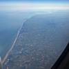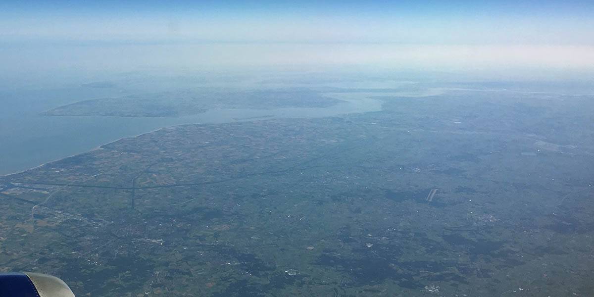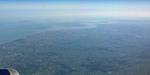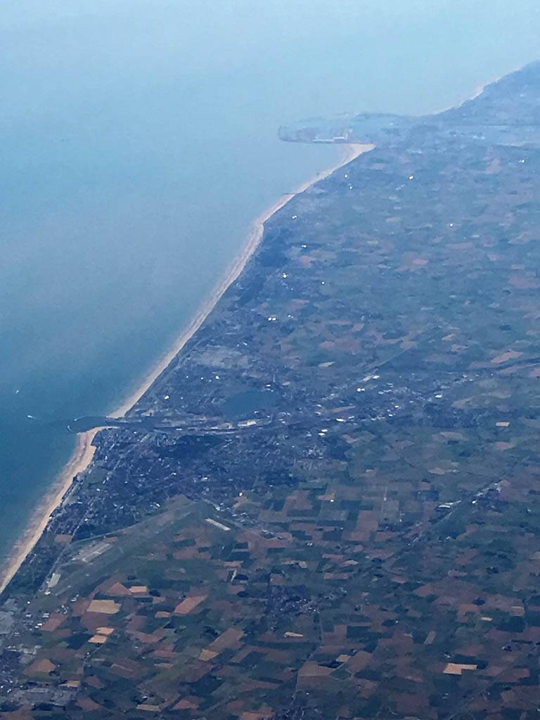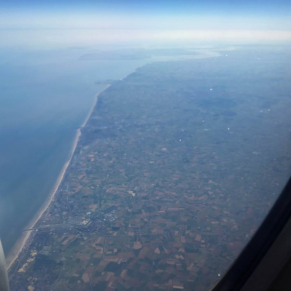 Looking further along the Thames Estuary towards the North sea as the plane leaves England via Kent. | The Belgian Coastline looking Northeastwards. Nieuwpoort in the foreground, then Ostend then Zebrugge. The distant islands are into the Netherlands. | Ostend and Zebrugge. | Northern Belgium from Bruges into the Southern Netherlands. | Brussels from the Southwest. | The only clouds I saw all flight, somewhere near the Belgian German border. |