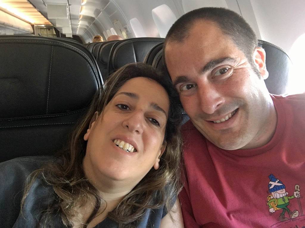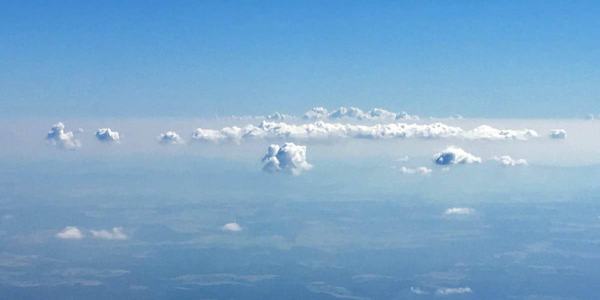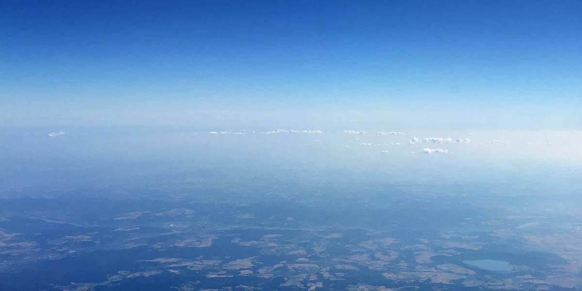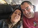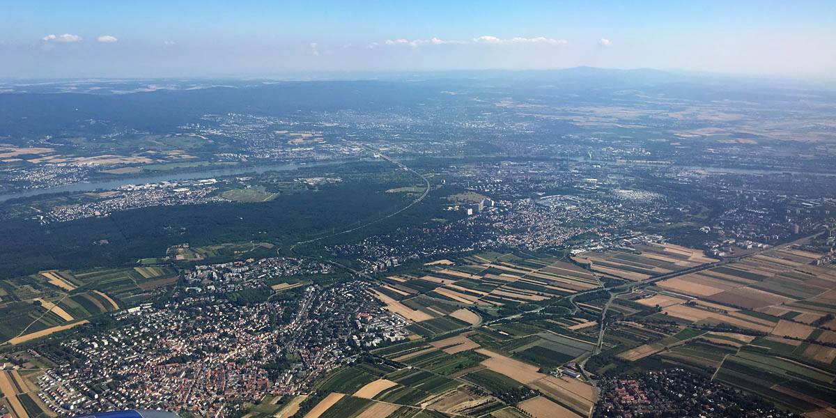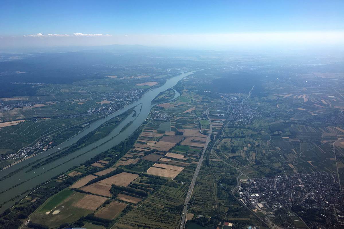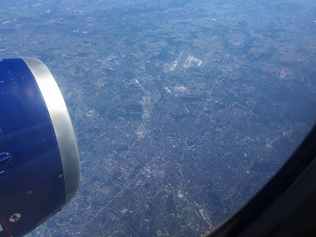 Renée and I couldn't resist a quick aeroplane selfie. | A closer look at the clouds. | Flying over the Rhine river just West of Mainz and Wiesbaden (West of Frankfurt). | Mainz and Wiesbaden from the South as we approach Frankfurt. | Flying low over the River Main just before landing at Frankfurt Airport from the West. |