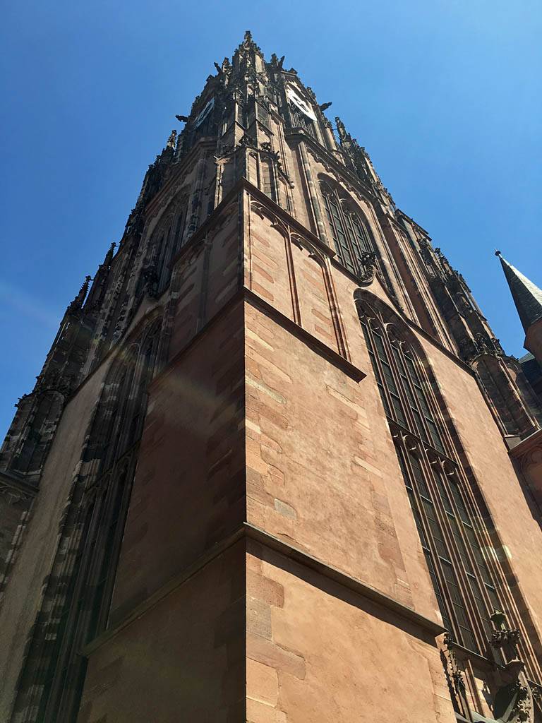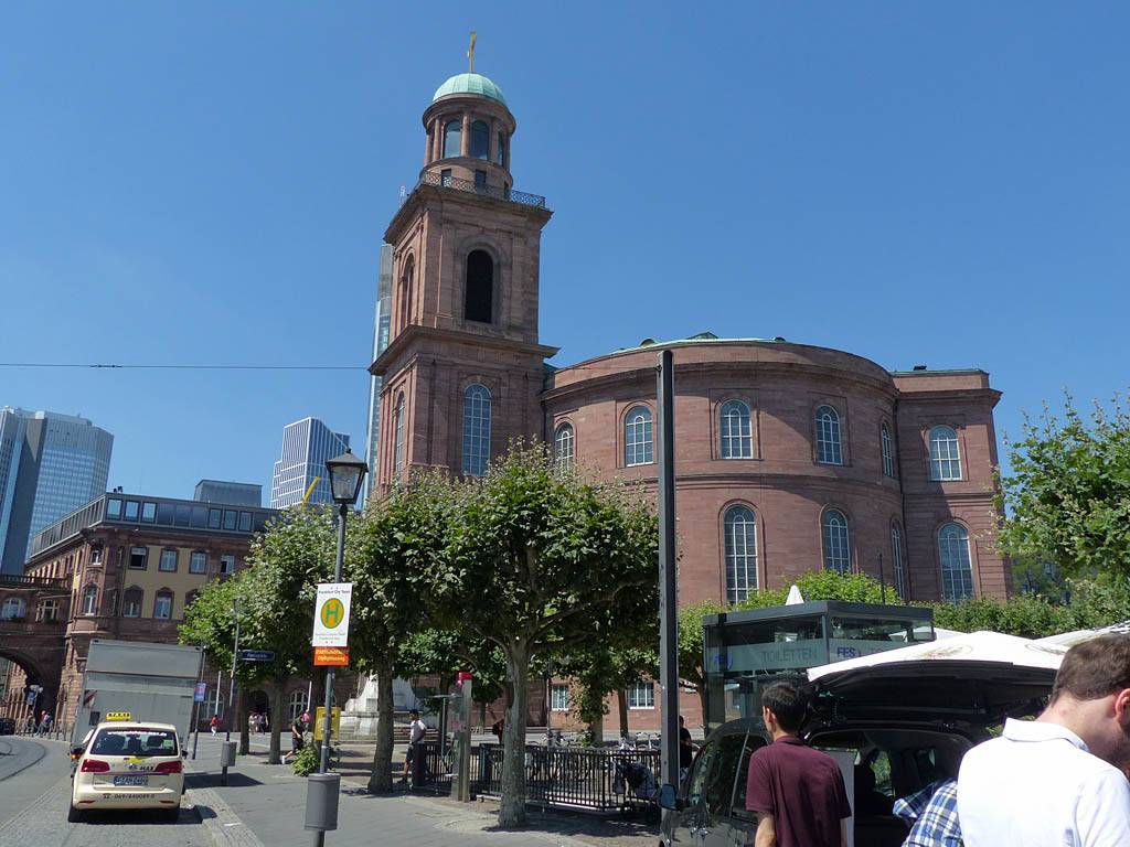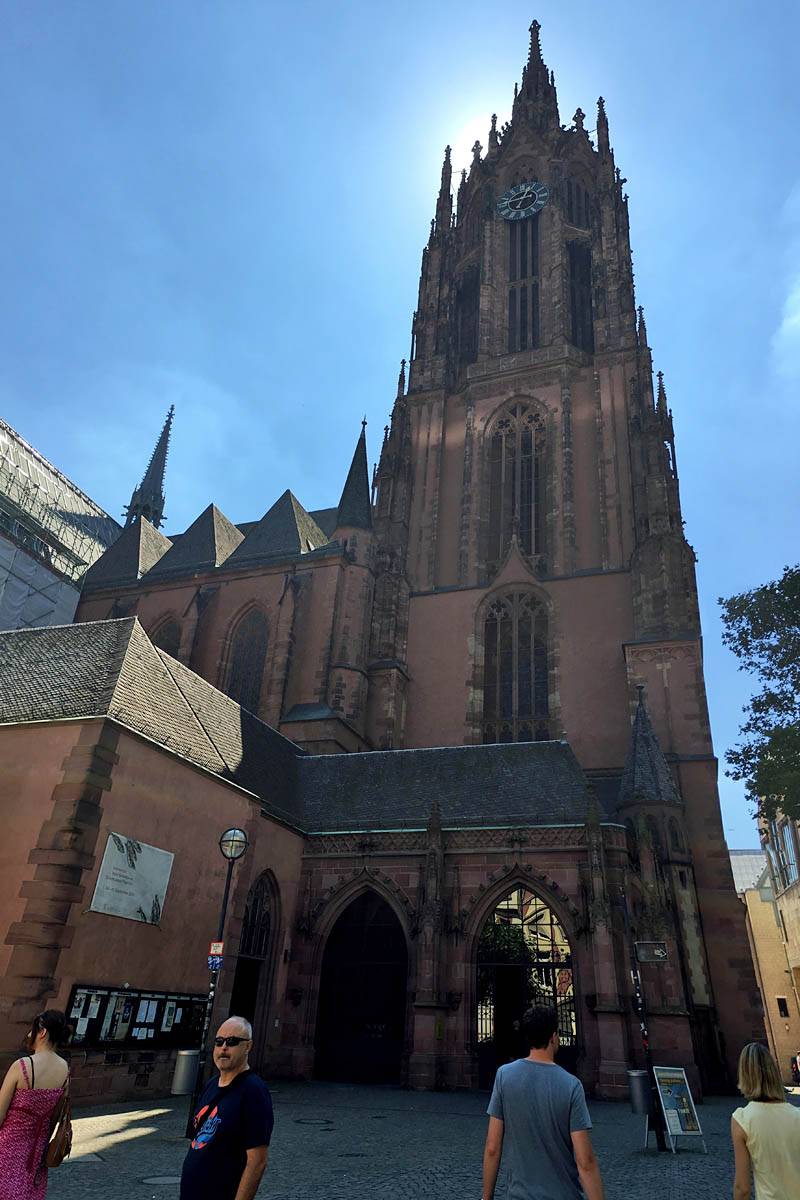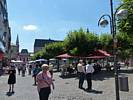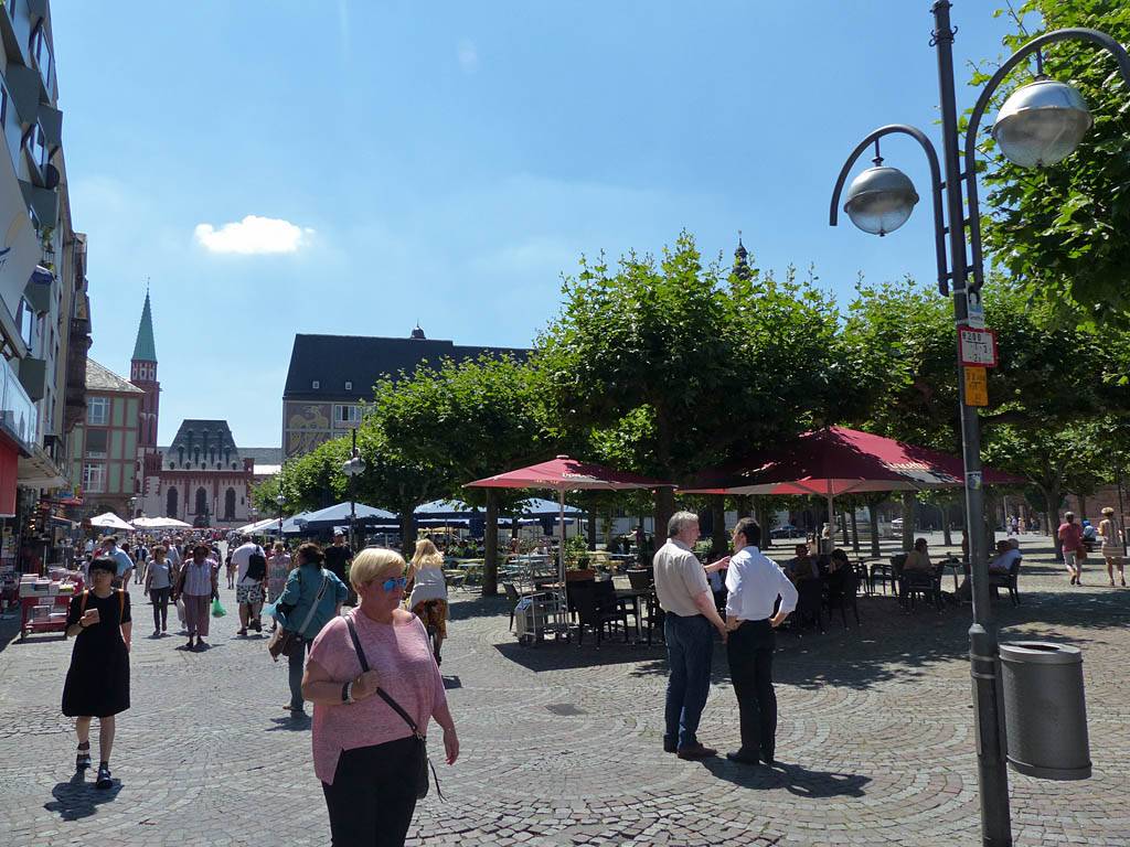 Dagmar and her brother Stephan were a little late due to traffic but we didn't have too long to wait and they arrived around 11:30AM. We went to their Renault Twingo and they drove us to the botanic gardens car park. It was hot, maybe 30C. I got suntan lotion out which everyone used. Then we went down into the subway at Westend station and too a U6 train 2 stops to Konstablerwache and the city centre where we had a wander. As well as some modern skyscrapers there were some really nice old buildings and squares too. It was baking hot but grids of plain trees provided shady areas to walk under. We looked in some shops (Renée helped Dagmar find some new shoes!) and inside the cathedral. Eventually we returned to the subway at 2PM to return to Westend on a U7 train which was a bit nicer than the U6.