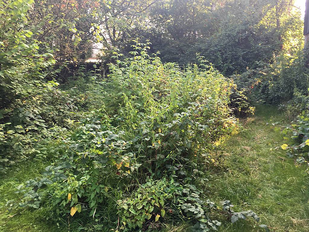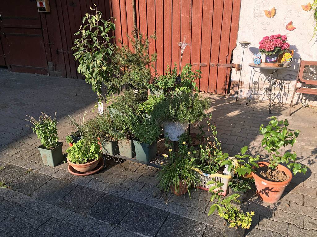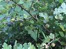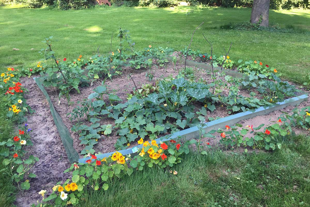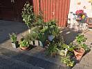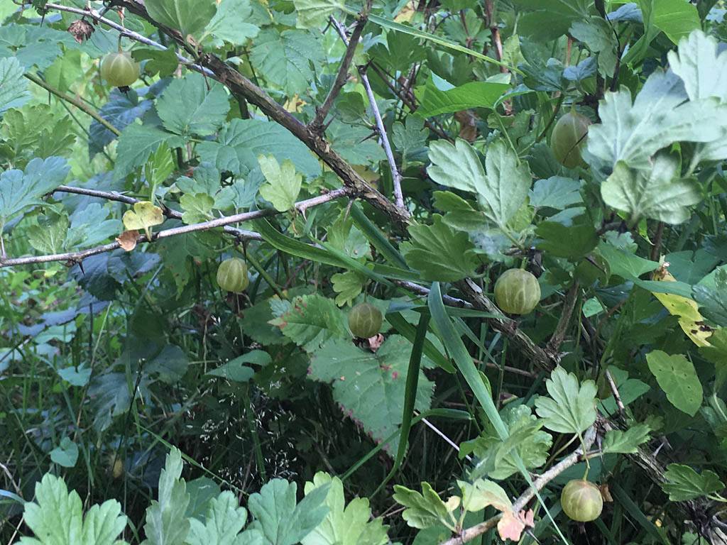 Renée Taking a look at Dagmar's place. | An iPhone panoramic view at the entrance to Dagmar's place. | The famous vegetable plot. | Gooseberries. | The berry garden. | Other potted plants. |
