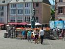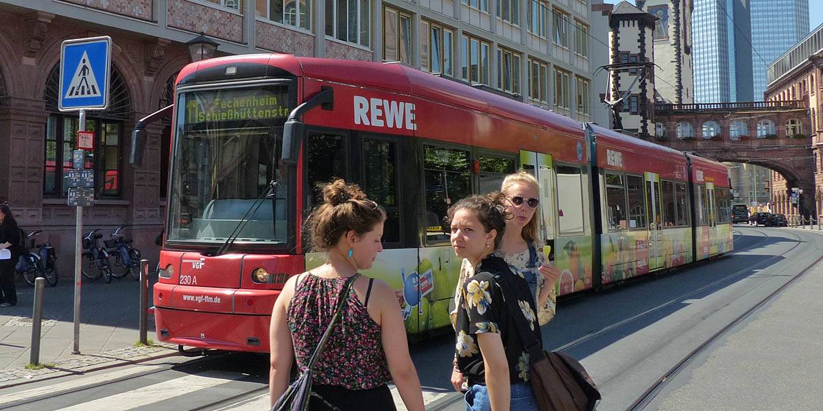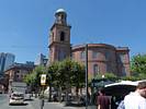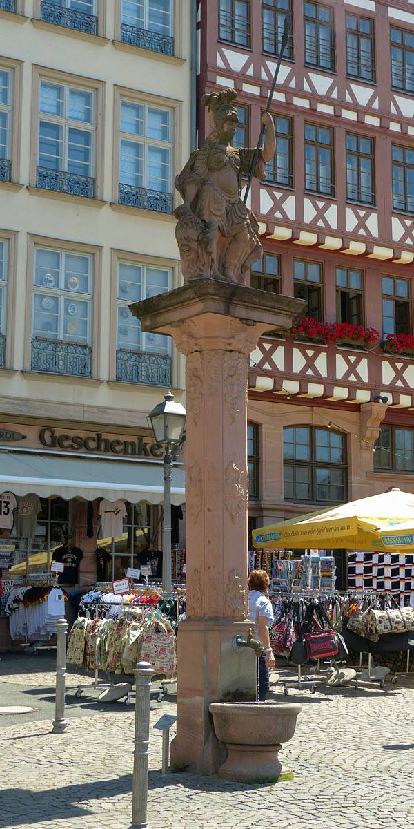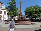 A typical Frankfurt tram on the North side of Römerberg. | Paulskirche, or St. Paul's Church. | Looking South back to Römerberg from Berliner St. Paulsplatz in the foreground. | Renée at a fountain at Liebfrauenberg. | The Galleria mall on the North side of Zeil where we emerge West of our start point. |