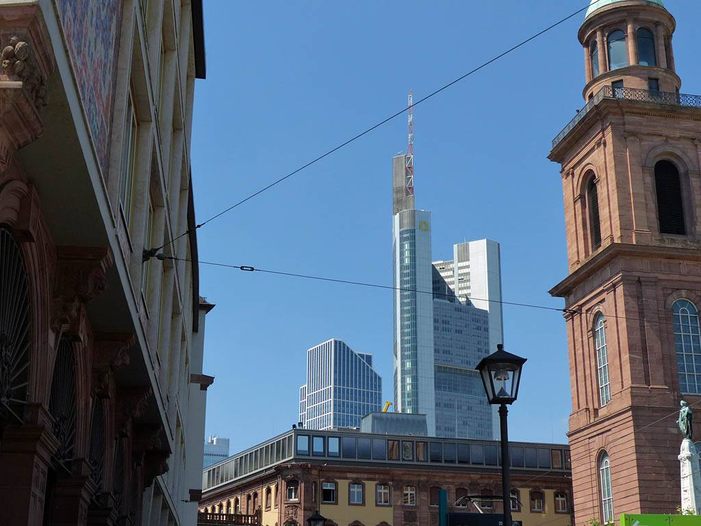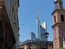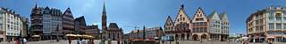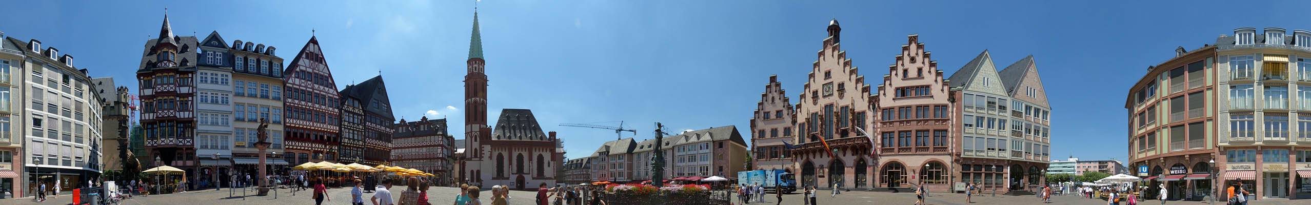 Looking around Römerberg square. | 360 degree panorama of Römerberg. | From Römerberg modern skyscrapers can be seen, new and old. |