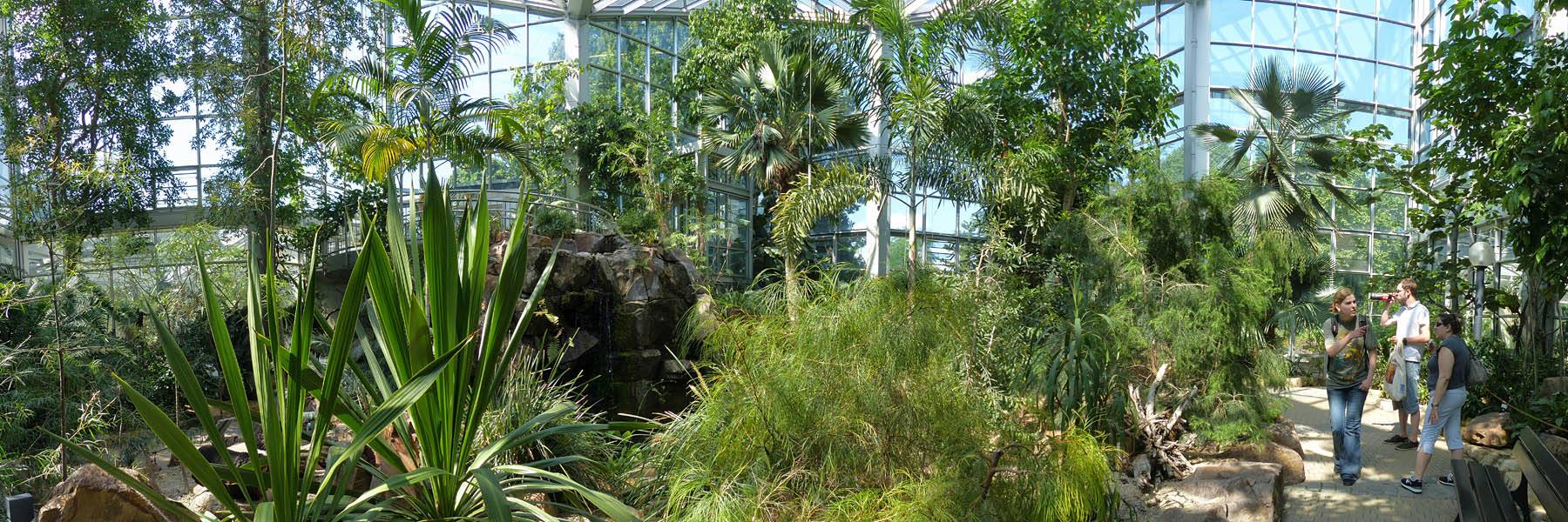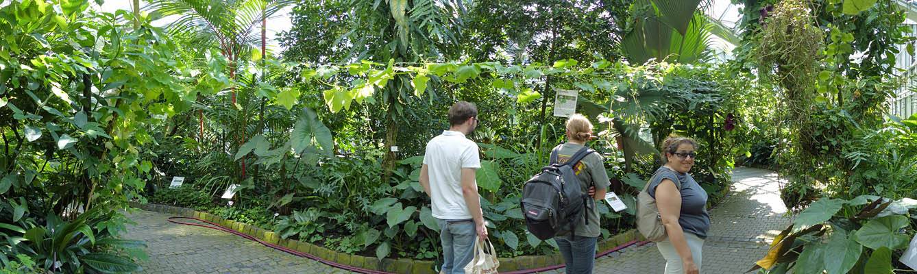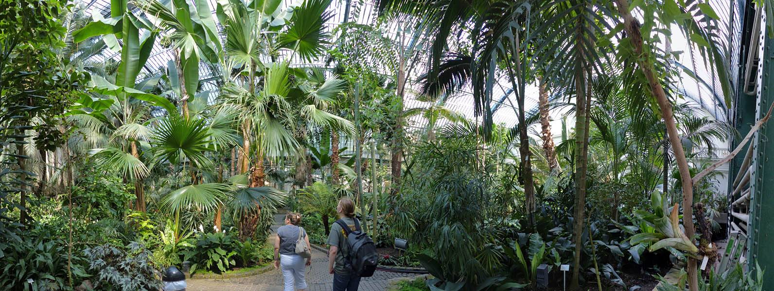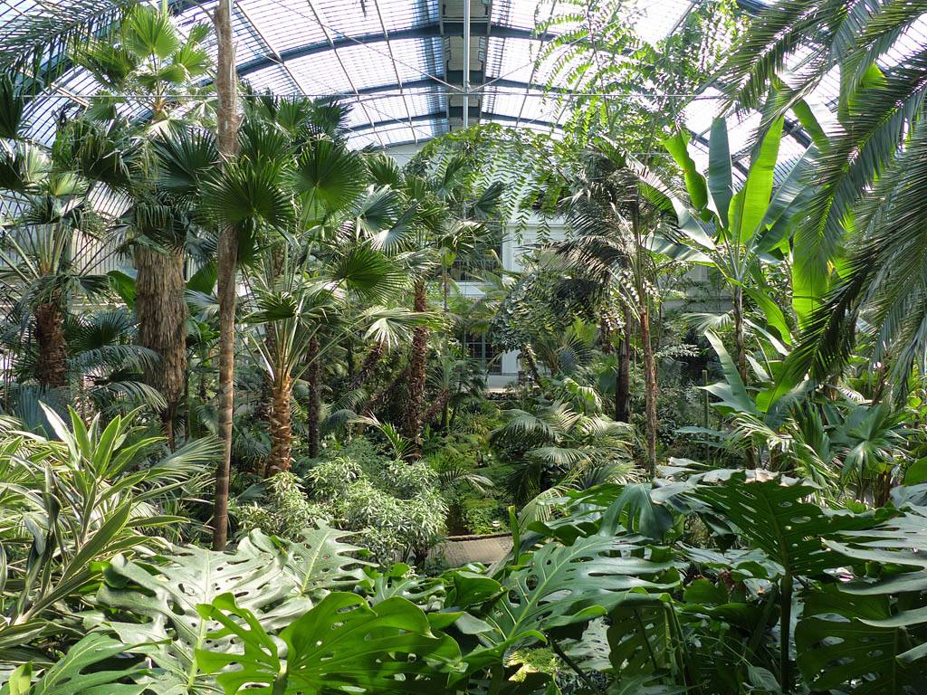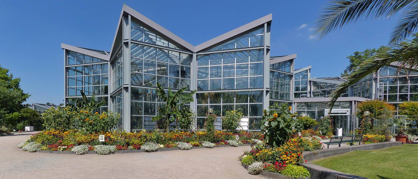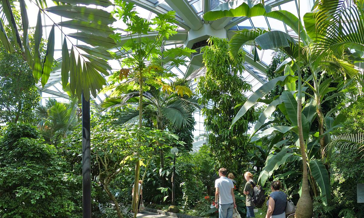 The botanical garden East entrance. | Inside the entrance greenhouse. | Looking West to the Roase Garden just inside the entrance. | The arid tropics tropicarium greenhouses. | The Oktogonbrunnen fountain. |
