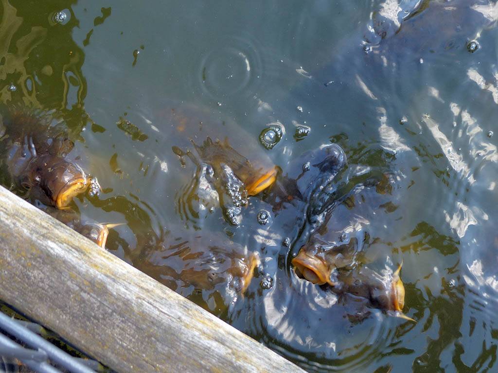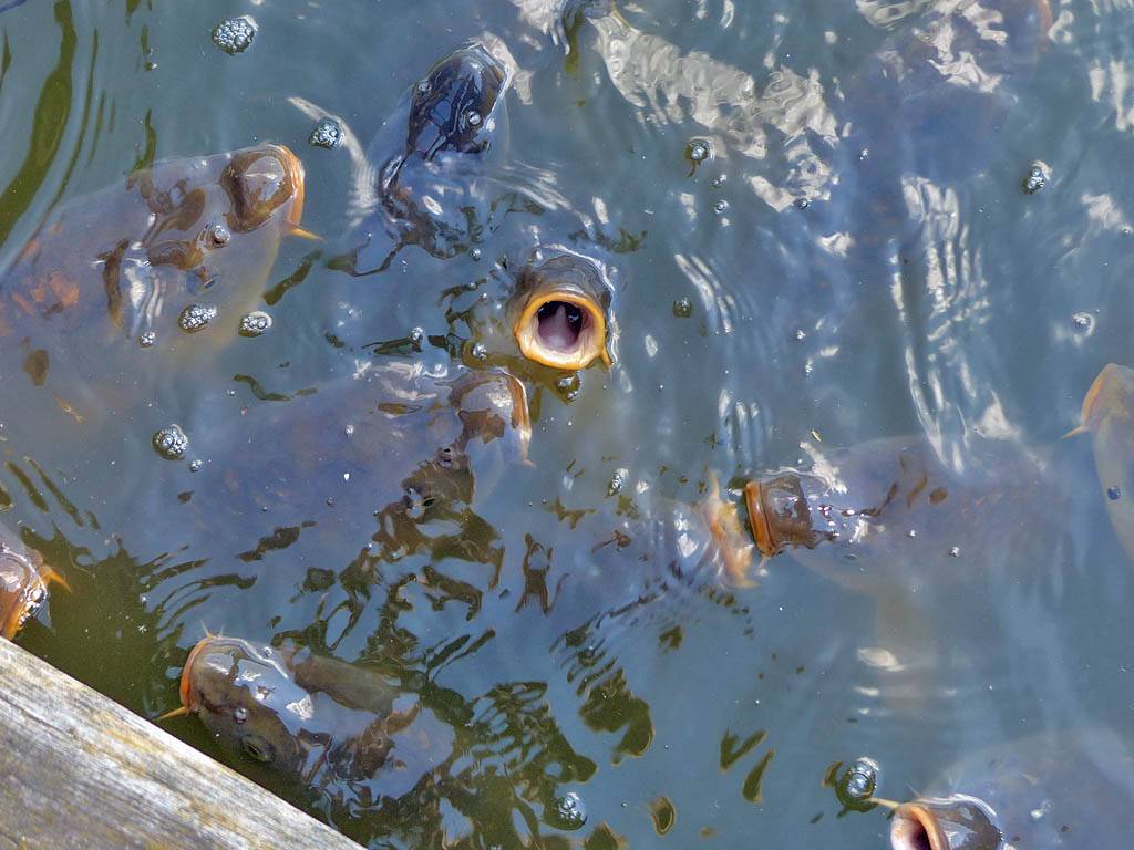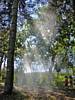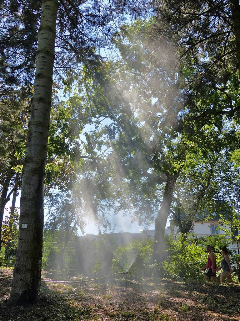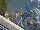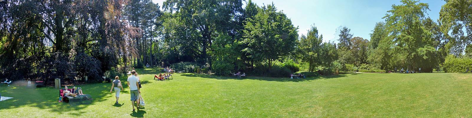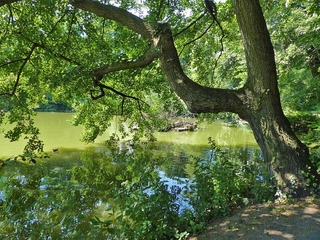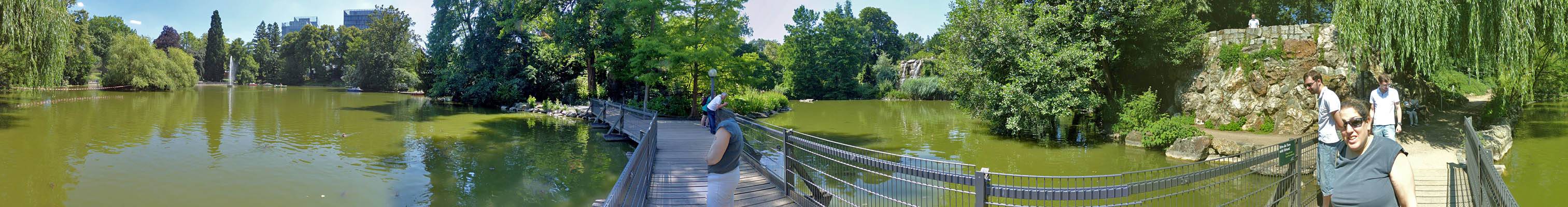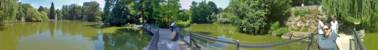 360 degree panorama on the lake bridge as Renée walks past (which the software struggled to handle lol). | This is what Stephan spotted. Lots of hungry carp think it's feeding time every time we look over at them. | Artificial crepuscular rays as a water spray lights up the rays of sun shining through the trees. |