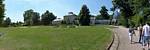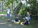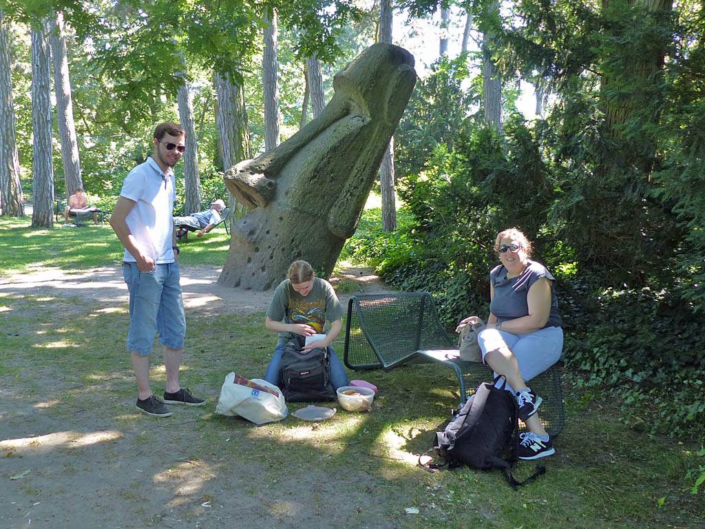 Walking over the Green Rest Area looking for a picnic spot. It's busy here. | The initial picnic stop by a giant head. | But then 3 loungers became available in a much nicer spot in the shade but brighter. So we moved. | The Egyptian geese soon became interested in our food. | Picnic time! |