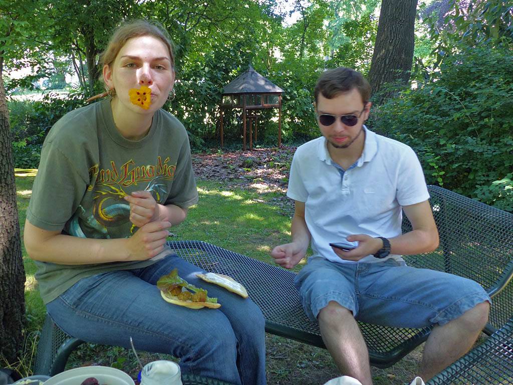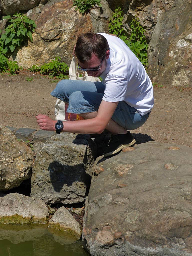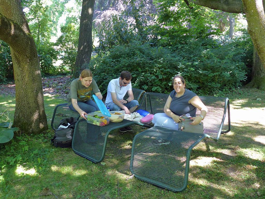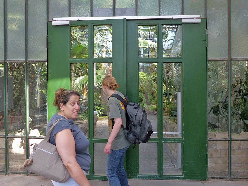 Back at Westend we entered the botanical garden (click here for a map in English) and walked to a nearby lake where we found some metal loungers to sit on in the shade and have a picnic. Dagmar had brought salad and falafel which was tasty. The bread was nice too and a family of Egyptian geese were keen on helping us eat it, with the adults even eating pieces out of my hand. Then we went for a walk around the garden and looked inside the glass houses. It was hot hot hot in there and my pocket fan came in useful. After more wandering we came to a kids' play area where water from a drinking fountain was useful for cooling down a bit. Then at 4:30PM we returned to the car.