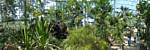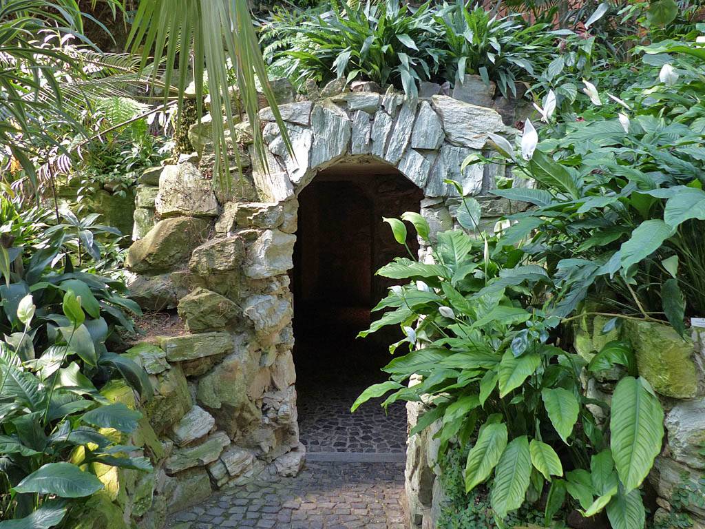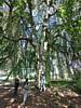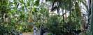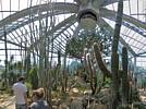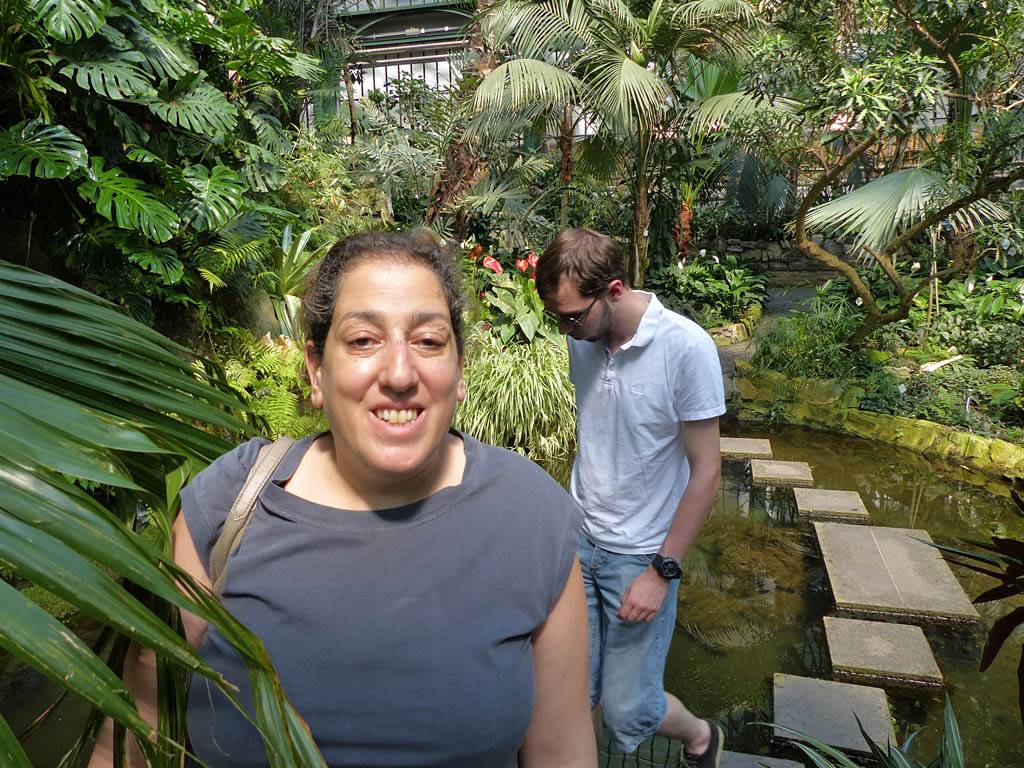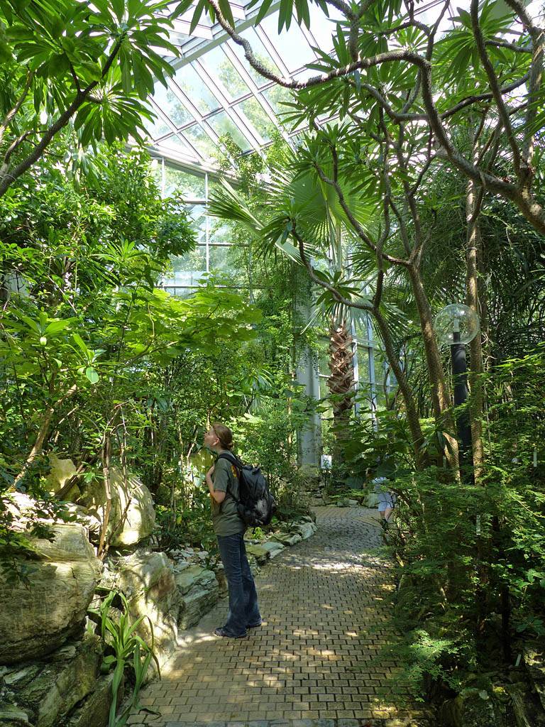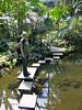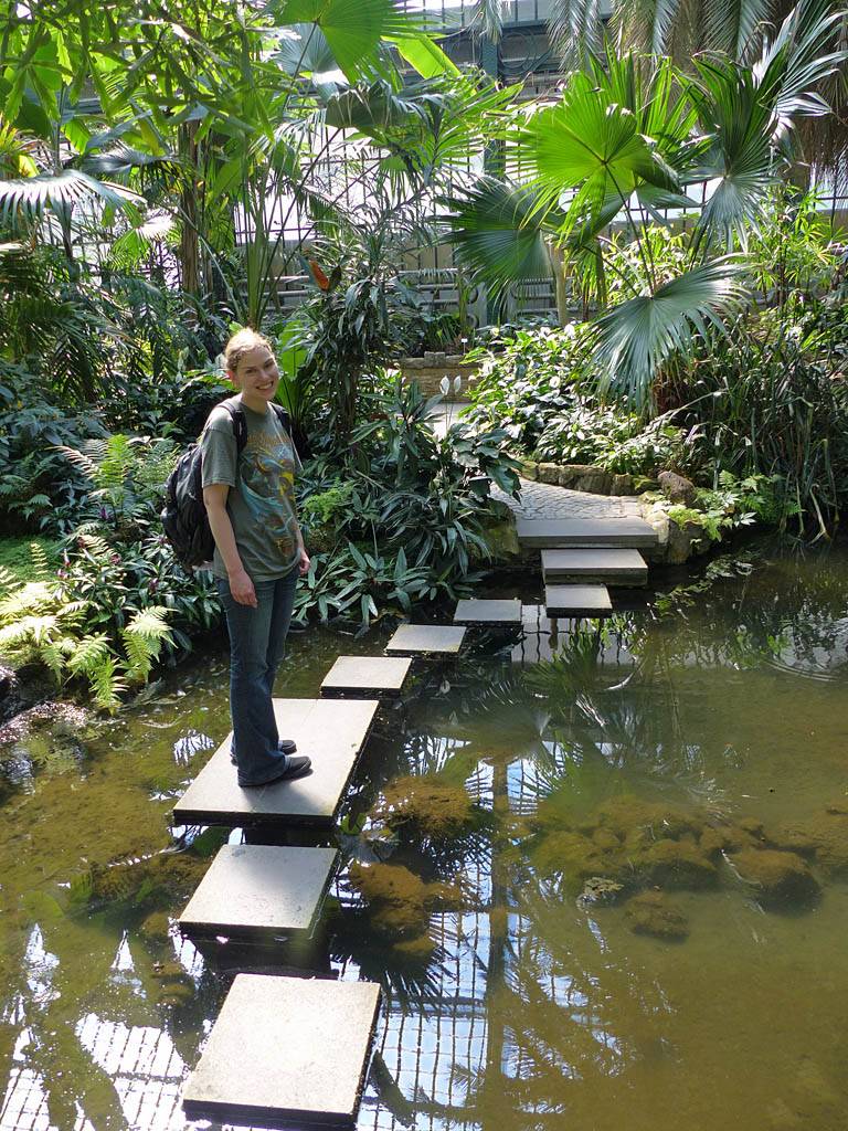 Underneath the bows of a large tree. The shade welcome as it is about 30C now. | Tree sculpture. | Entering the palm house (Southern end of the garden). | The palm house. | Bananas growing. | Dagmar posing on some Stepping stones. |