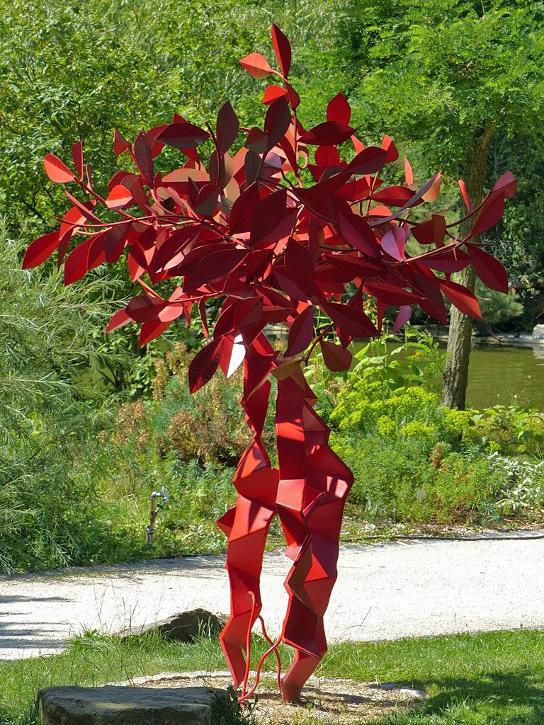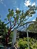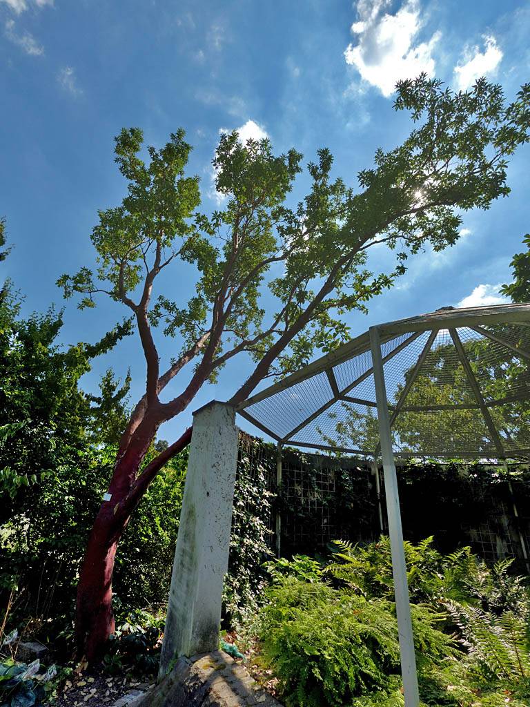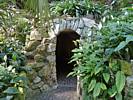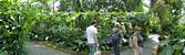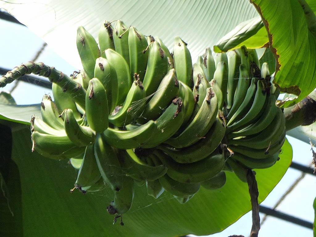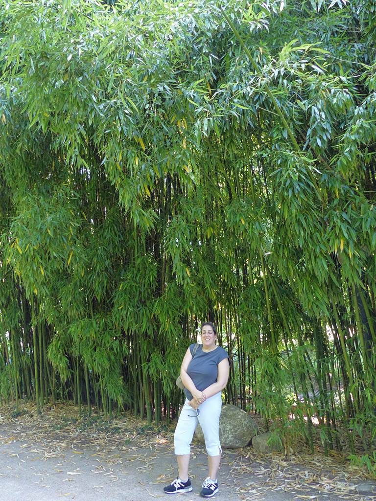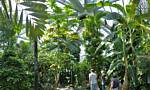 Underneath the bows of a large tree. The shade welcome as it is about 30C now. | Tree sculpture. | Entering the palm house (Southern end of the garden). | The palm house. | Bananas growing. | Dagmar posing on some Stepping stones. |