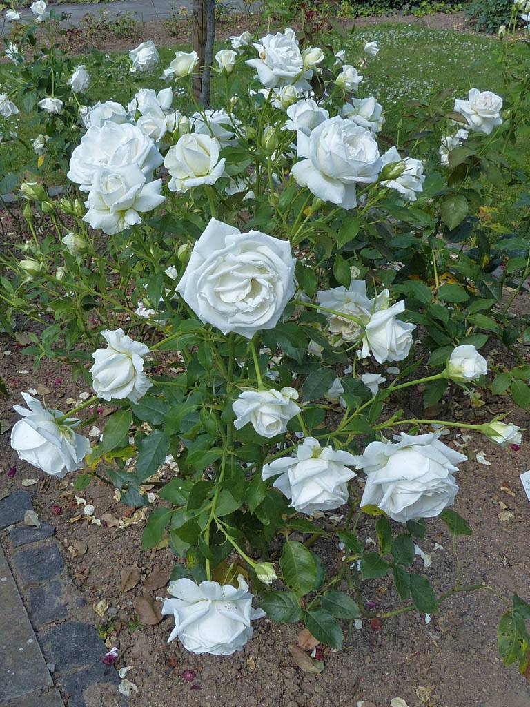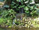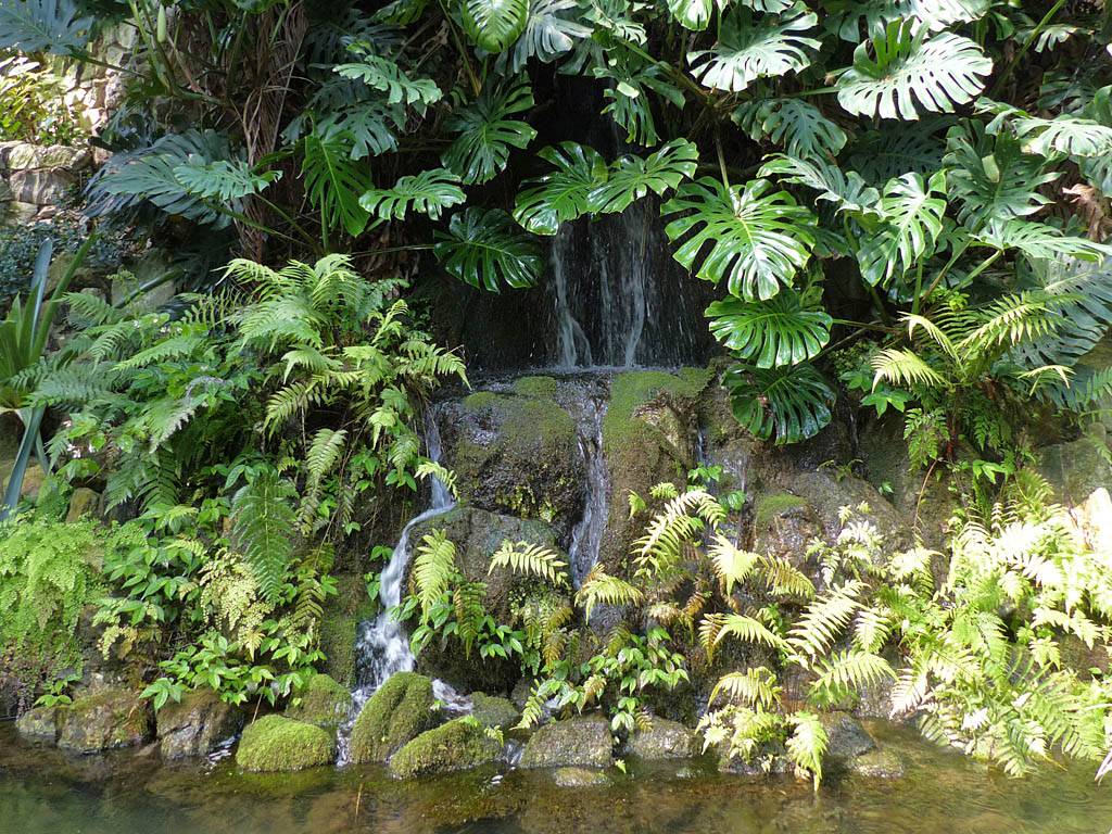 Waterfall. | Renée and Stephan and the stepping stones. | Tropical plants. | An archway leading to a small aquarium. | Another view across the palm house from above the aquarium. | Back outside in the Rose garden. Many of the roses had shrivelled in the heat but these white ones were looking good. |