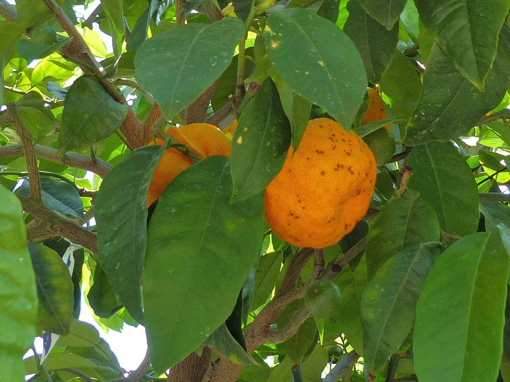 Exploring another tropicarium zone with huge palm tree leaves. | Back outside there were these Bitter Orange trees. | A pond lilly. | Lovely purple flowers that look a bit like lavendar from a distance. |