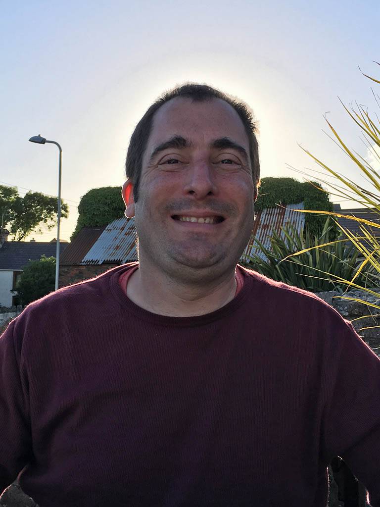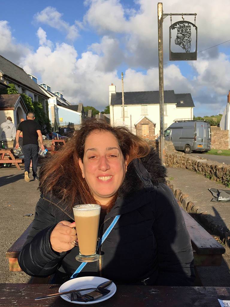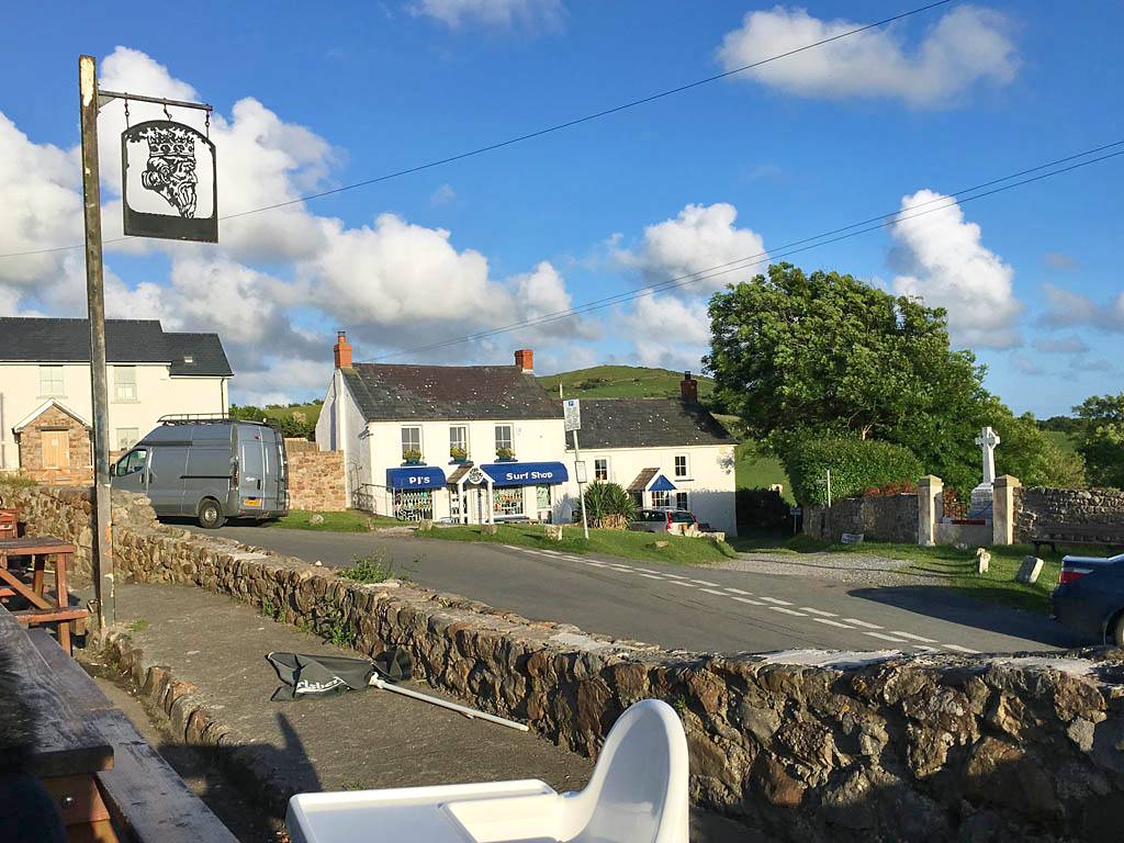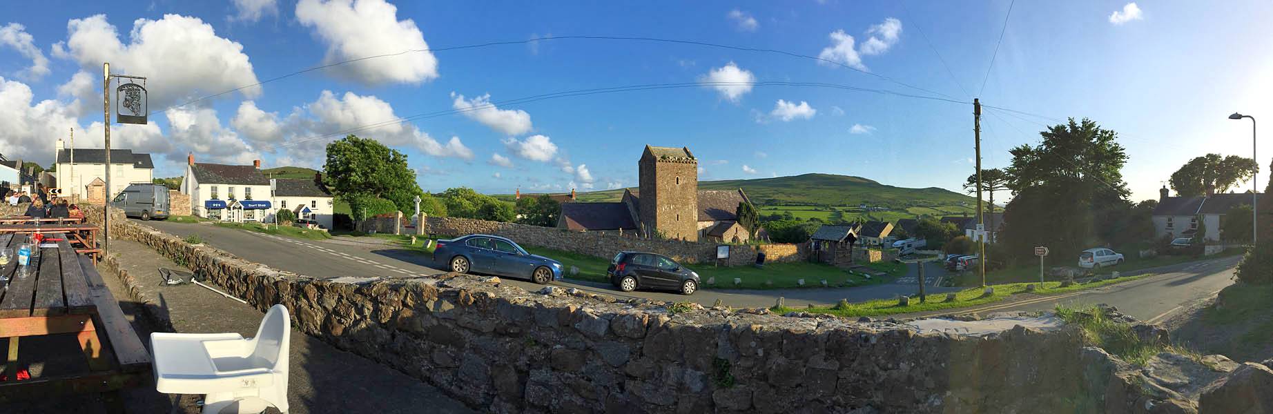 The King's Head. | Views of Llangenith from the beer garden. | Renée enjoying an Irish Coffee. | Another view of Llangenith. | The sun forming a halo around Mike's head. | A cloud that looks like an elephant jumping over a building. |