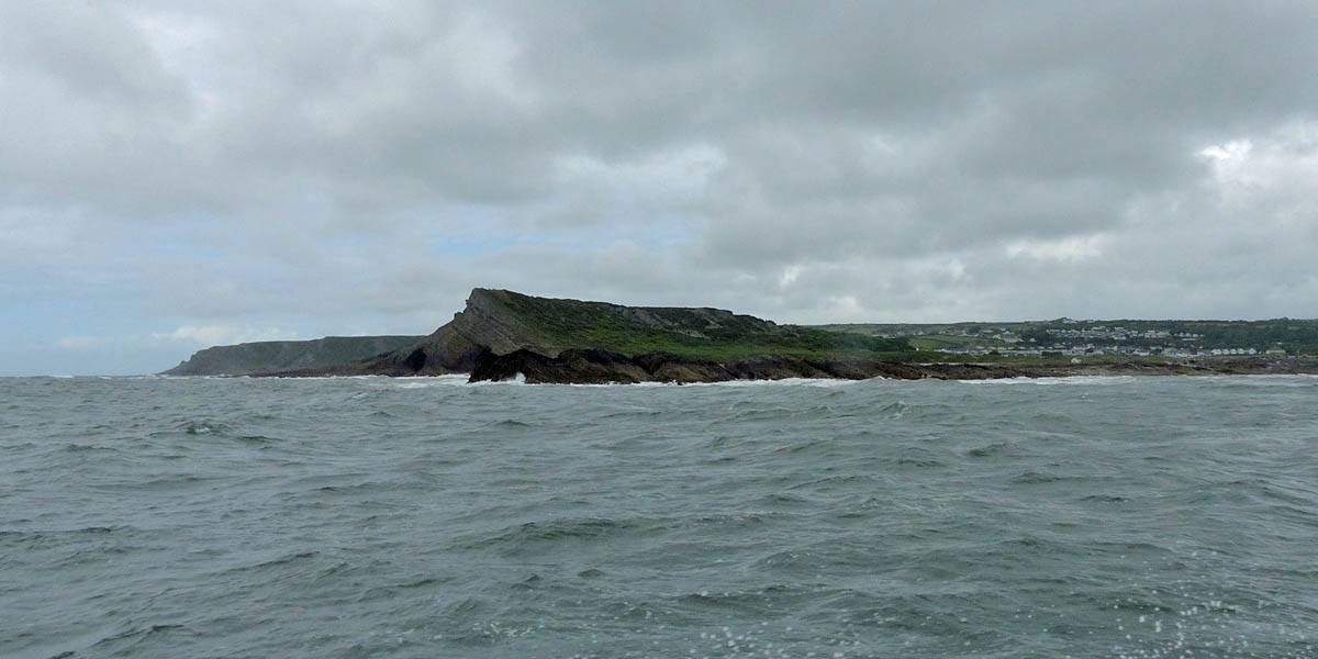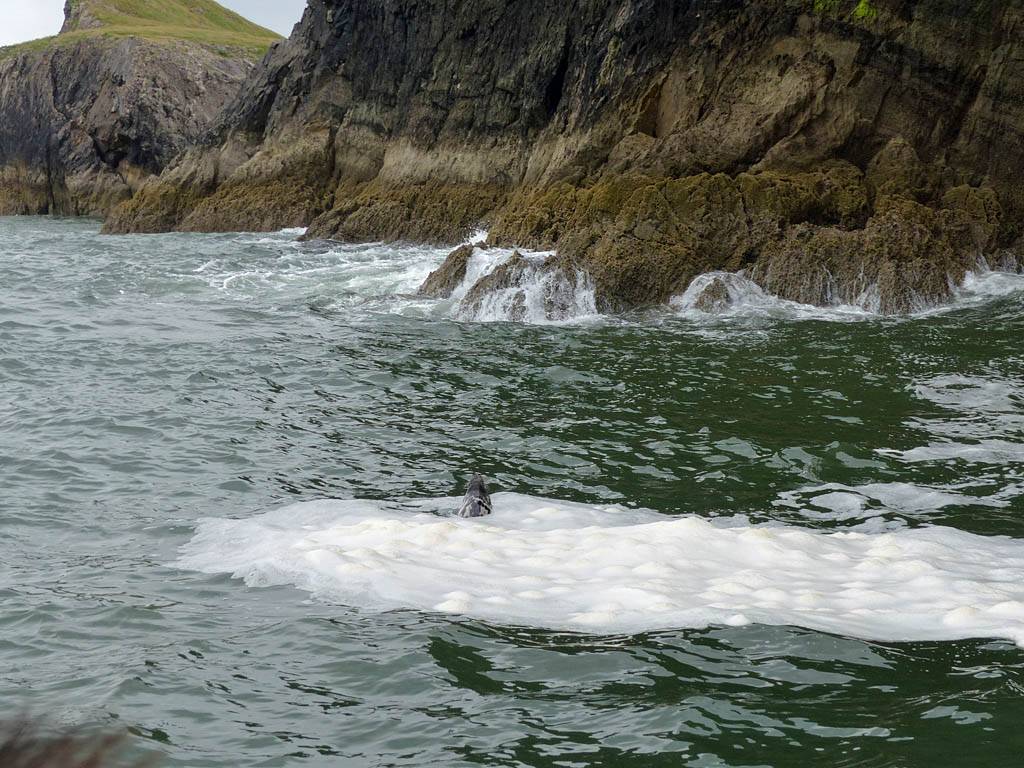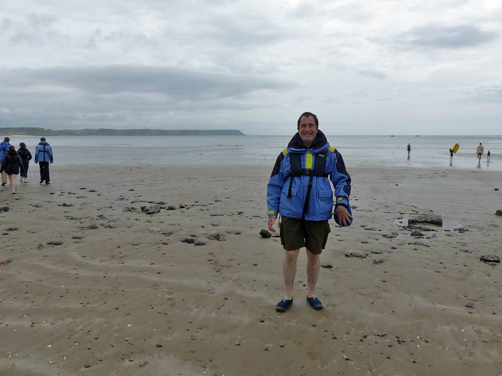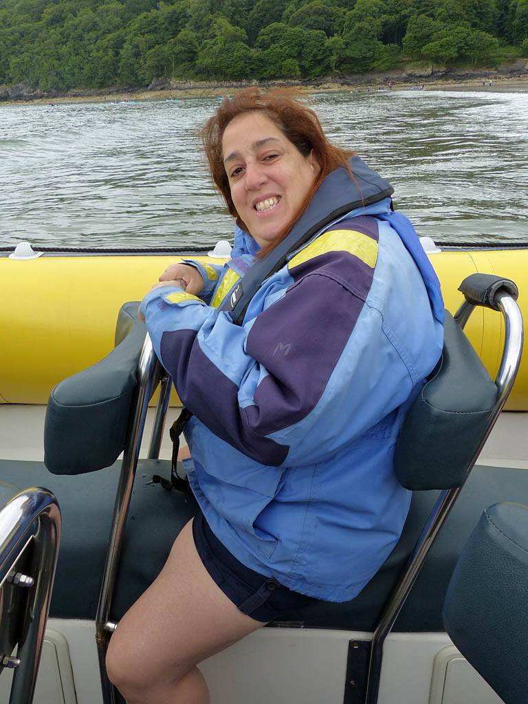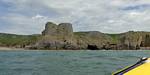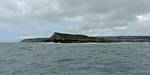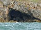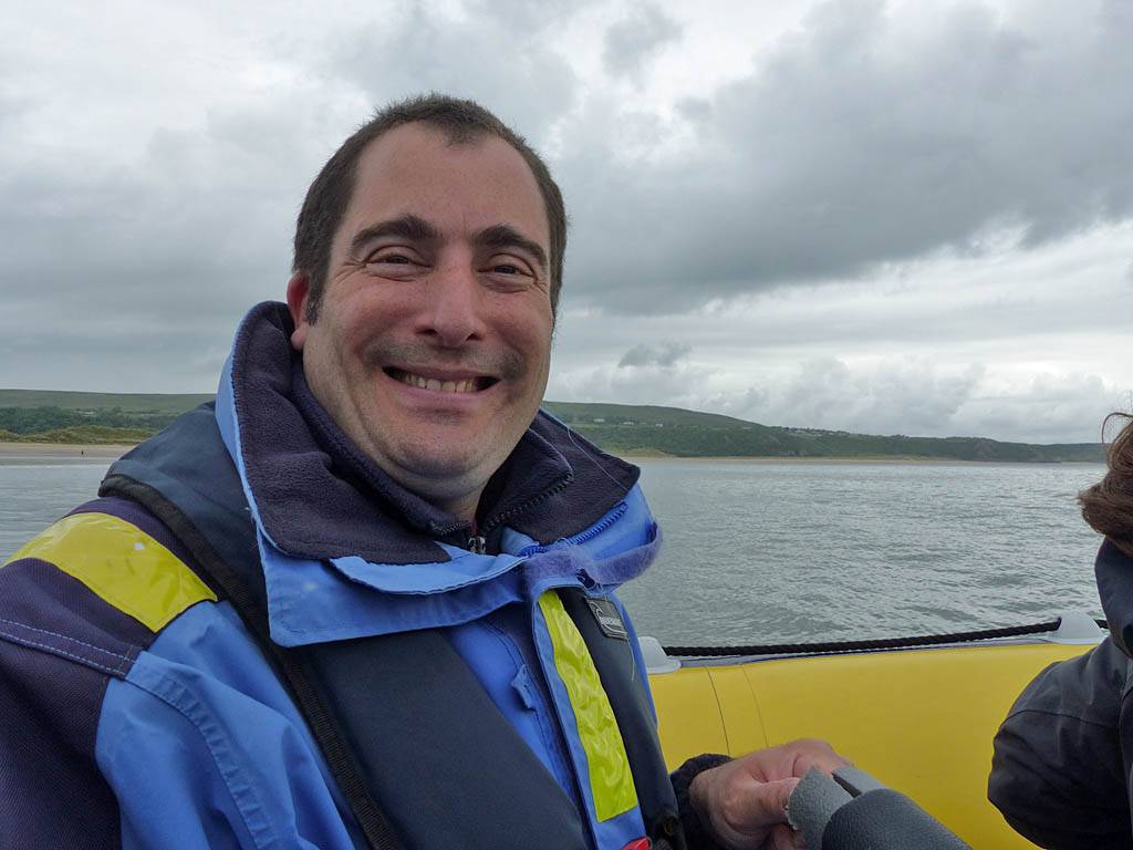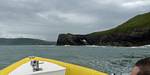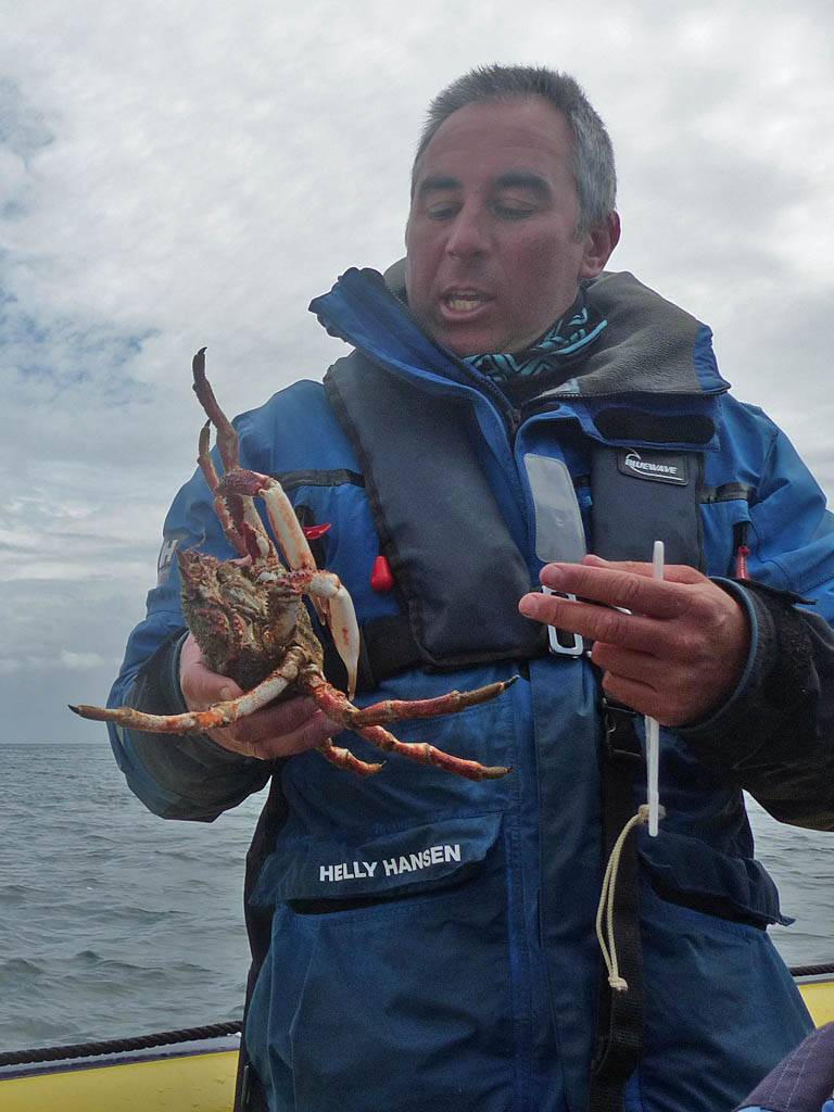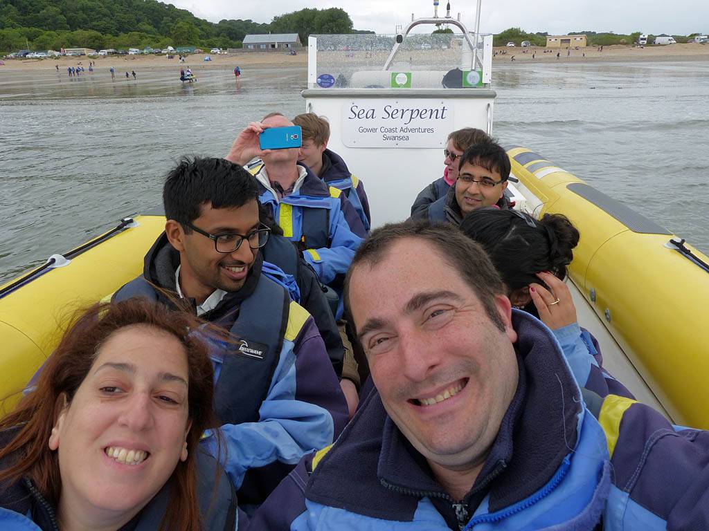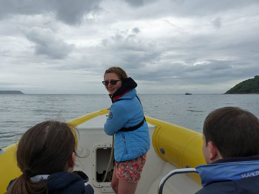 At 11AM with everyone gathered the briefing started. We were given extra fleeces and waterproofs to use as well as life jackets. Then we went to the water's edge to wait for the boat. Early sunshine had gone for now as showers passed nearby. But luckily they didn't reach us. We had fun paddling until the boat arrived just after 11:30AM. We soon boarded and were on our way. The bay was fairly calm but once out into open water it was rather choppy and rough. We battered our way through the waves a fair way from land and after a pause near Port-Eynon Bay we eventually reached and encircled Worm's Head, having gotten a soaking from the spray on the way. On the lee side it was much calmer and we could enjoy the bird colonies on the cliff faces and seals in the water. A blow hole also made for a spectacular show. By now Renée wasn't feeling so good. Soon we crossed over the top of the causeway as the water rose towards high tide and followed the coast back to start. Alas Renée succumbed to the conditions and let go of her breakfast. No problem as the skipper sloshed it all off the boat with sea water and noted that someone has to feed the fish! Back in Oxwich Bay we paused at a lobster pot where a large Spider Crab and a Hermit Crab were shown to us. Then much to Renée's relief we returned to start and disembarked at 1:25PM. It was a fun ride but conditions were a tad bumpy.