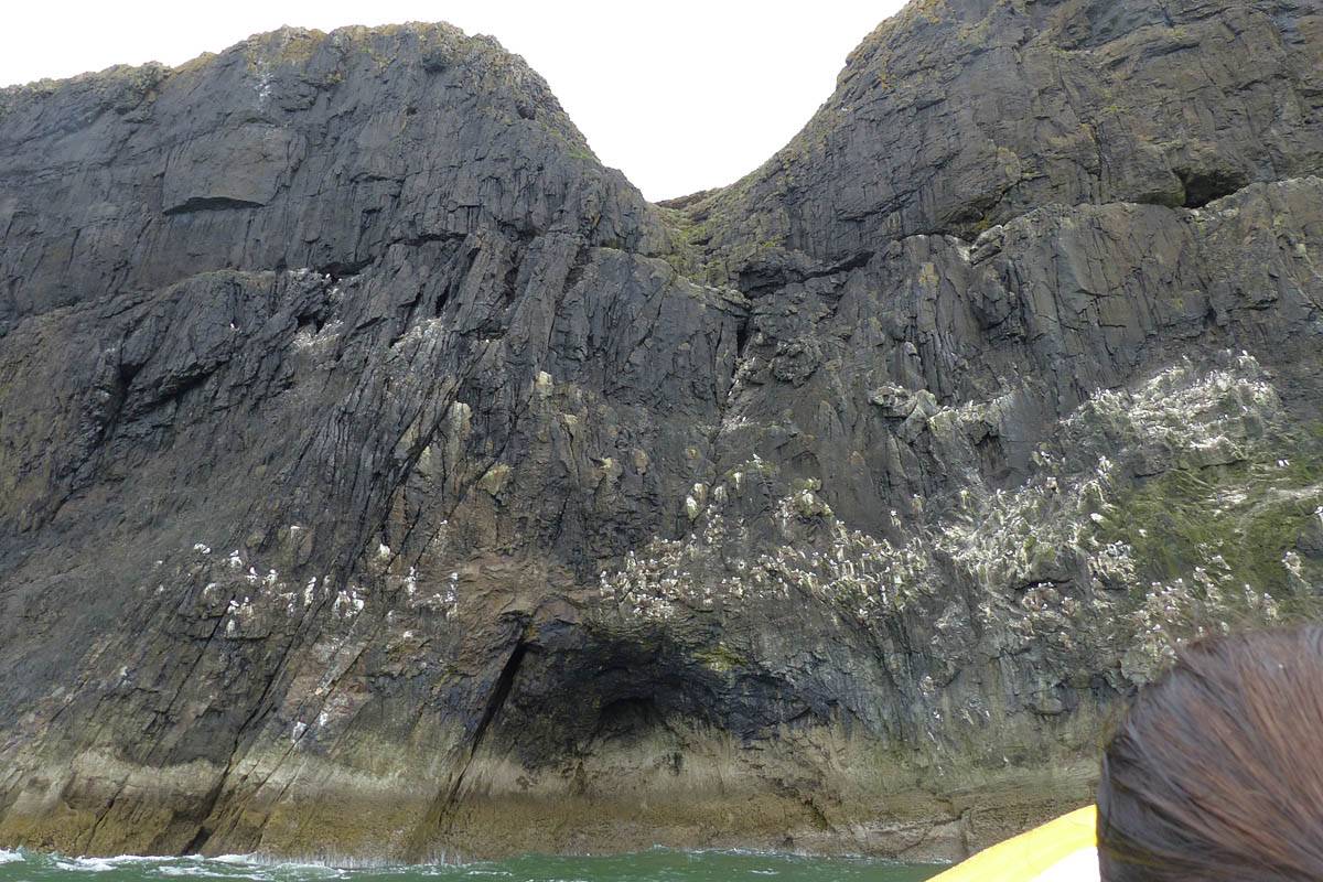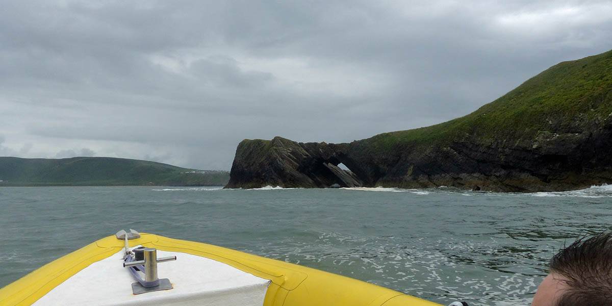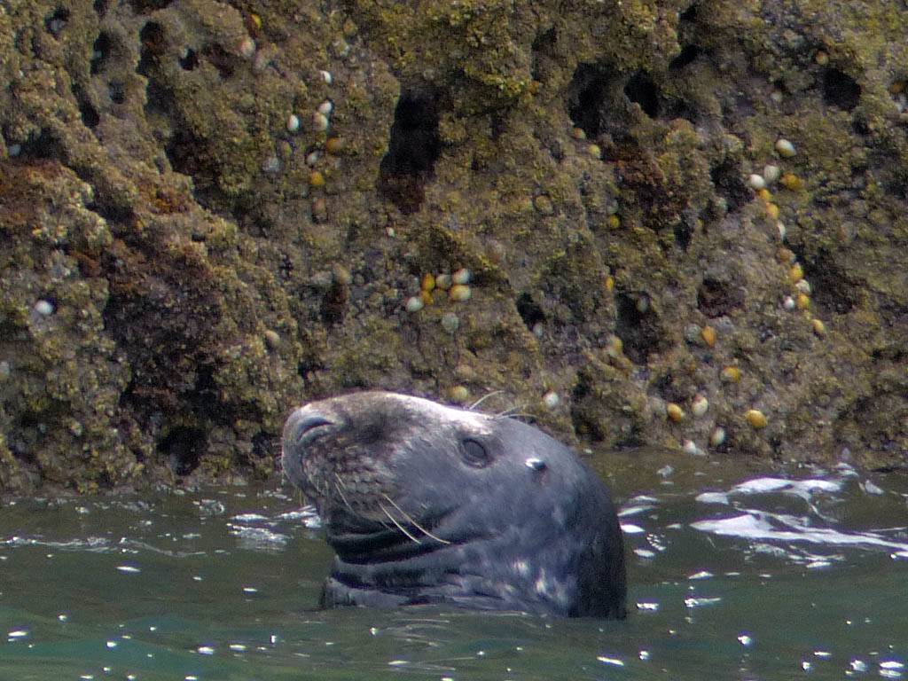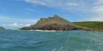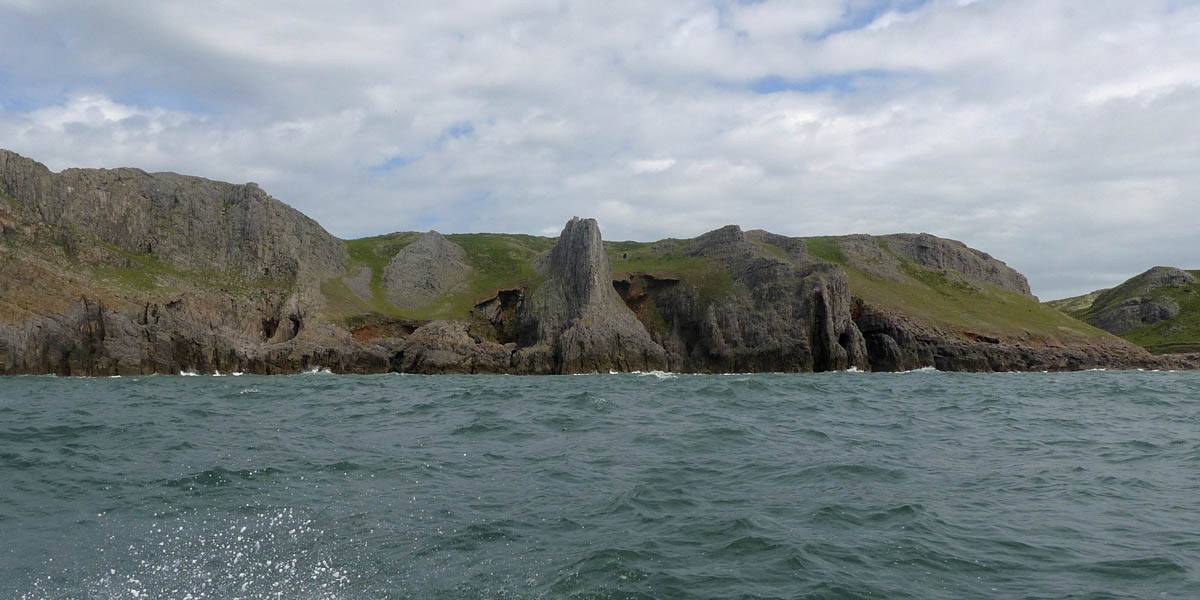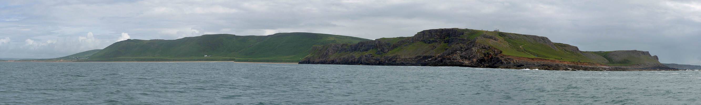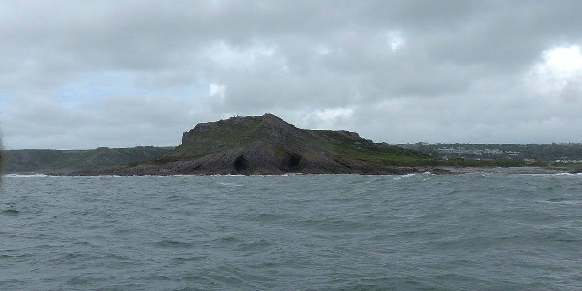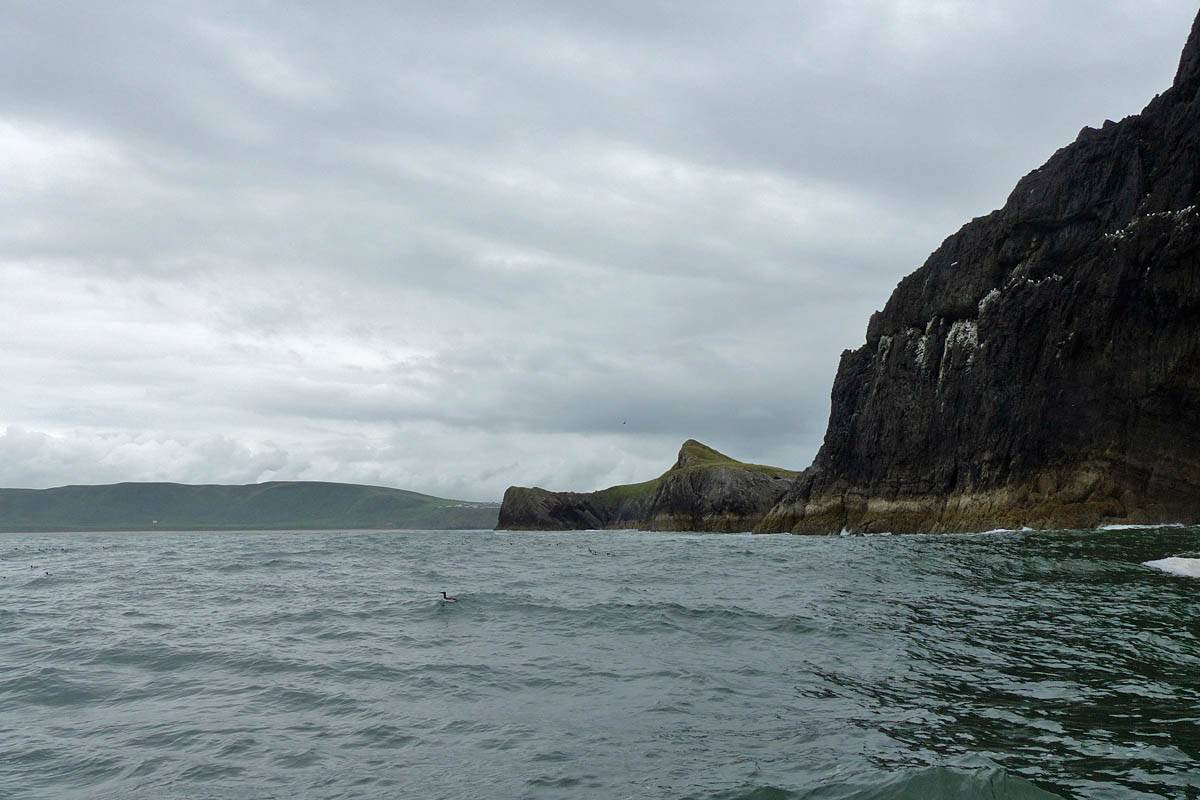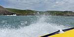 At 11AM with everyone gathered the briefing started. We were given extra fleeces and waterproofs to use as well as life jackets. Then we went to the water's edge to wait for the boat. Early sunshine had gone for now as showers passed nearby. But luckily they didn't reach us. We had fun paddling until the boat arrived just after 11:30AM. We soon boarded and were on our way. The bay was fairly calm but once out into open water it was rather choppy and rough. We battered our way through the waves a fair way from land and after a pause near Port-Eynon Bay we eventually reached and encircled Worm's Head, having gotten a soaking from the spray on the way. On the lee side it was much calmer and we could enjoy the bird colonies on the cliff faces and seals in the water. A blow hole also made for a spectacular show. By now Renée wasn't feeling so good. Soon we crossed over the top of the causeway as the water rose towards high tide and followed the coast back to start. Alas Renée succumbed to the conditions and let go of her breakfast. No problem as the skipper sloshed it all off the boat with sea water and noted that someone has to feed the fish! Back in Oxwich Bay we paused at a lobster pot where a large Spider Crab and a Hermit Crab were shown to us. Then much to Renée's relief we returned to start and disembarked at 1:25PM. It was a fun ride but conditions were a tad bumpy.