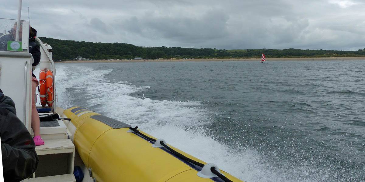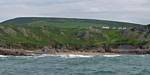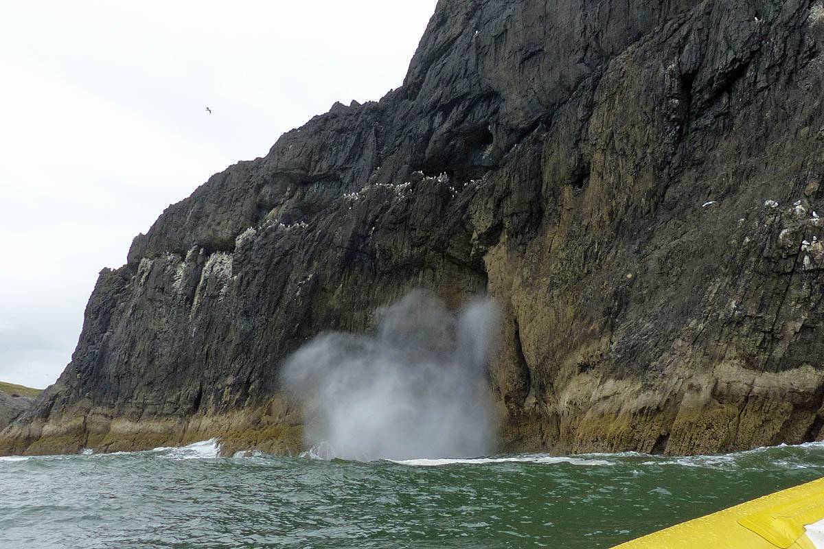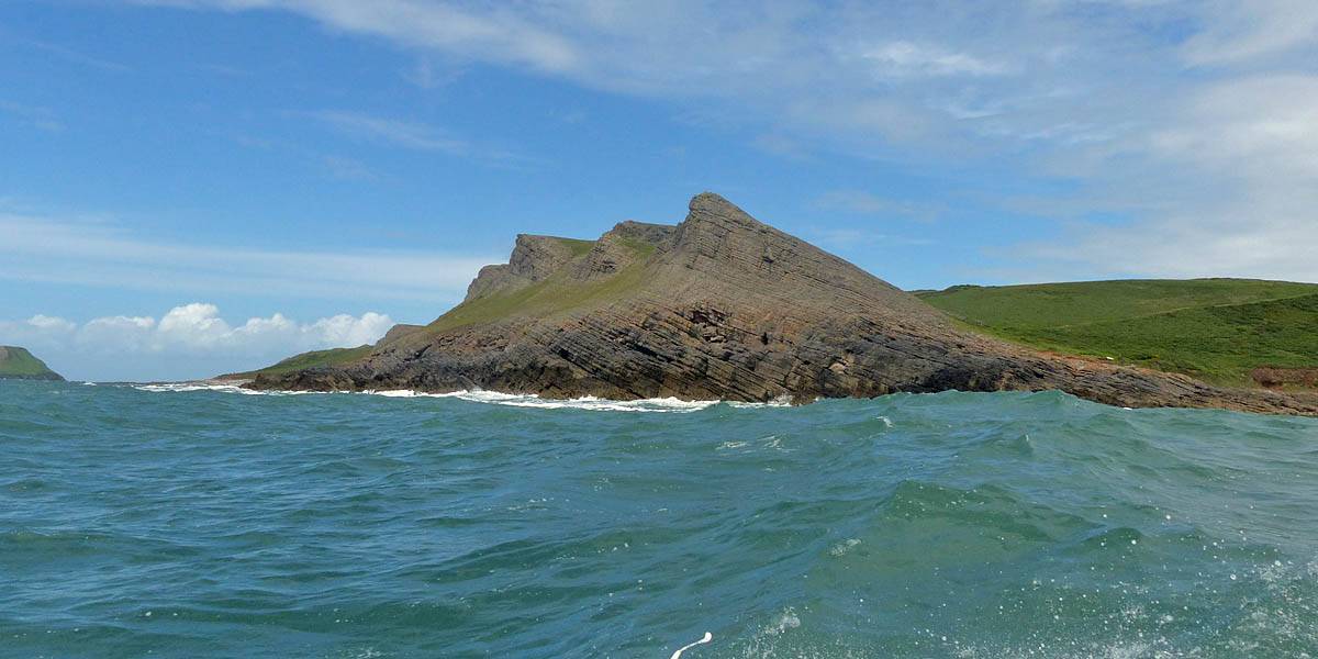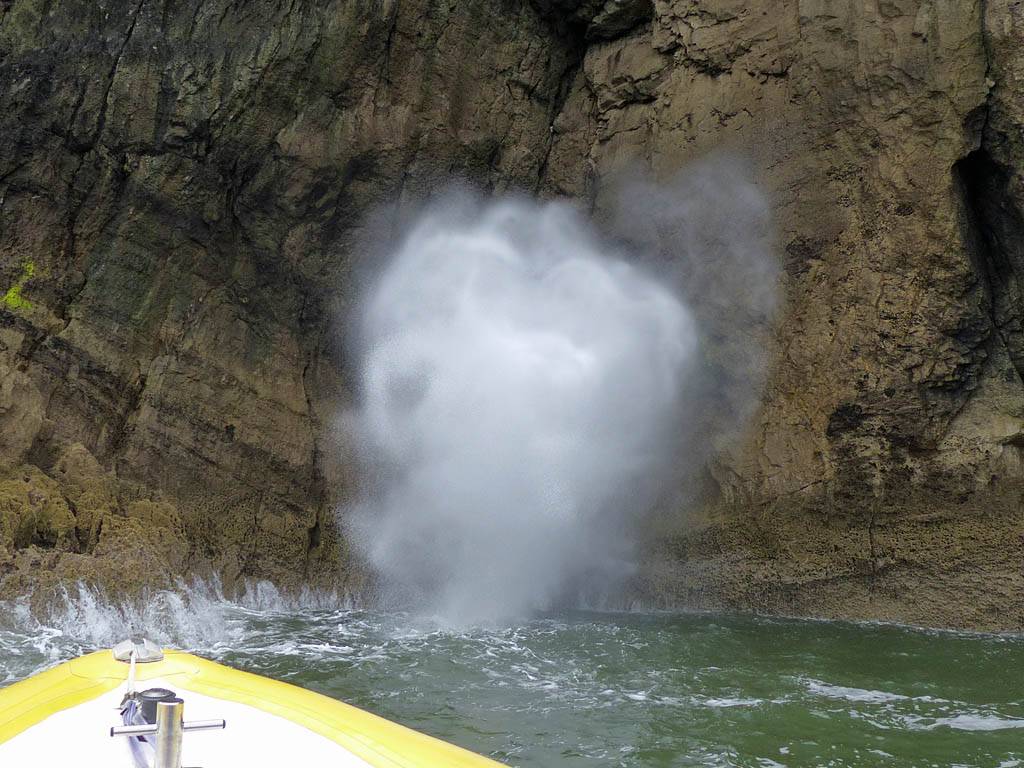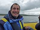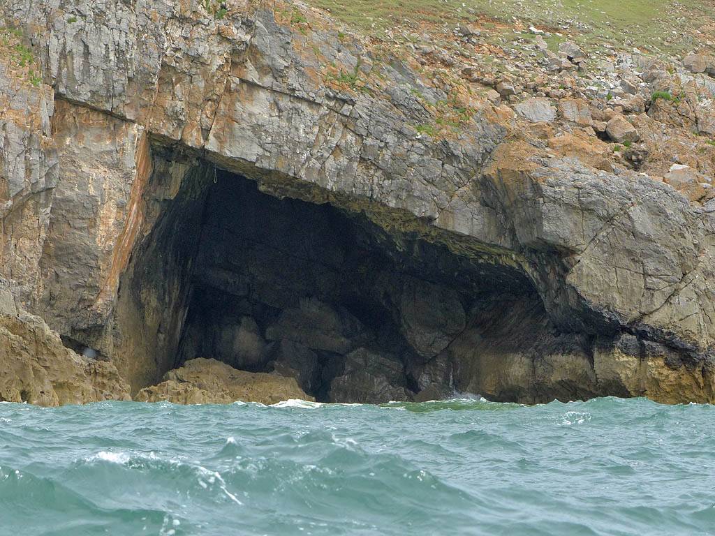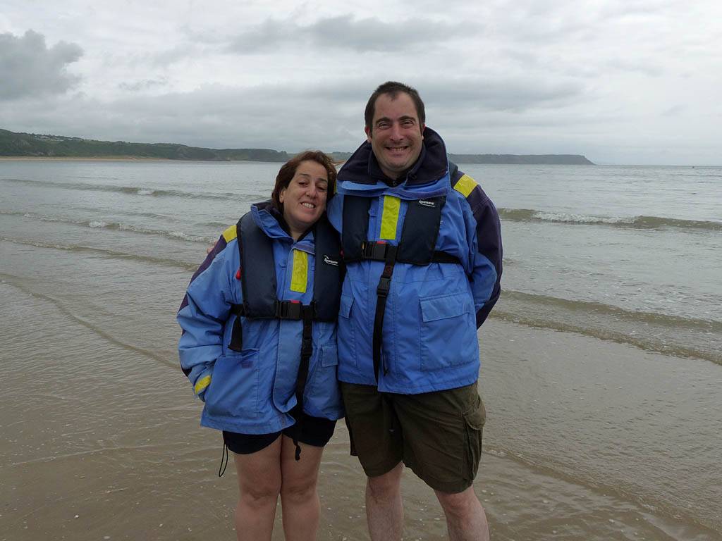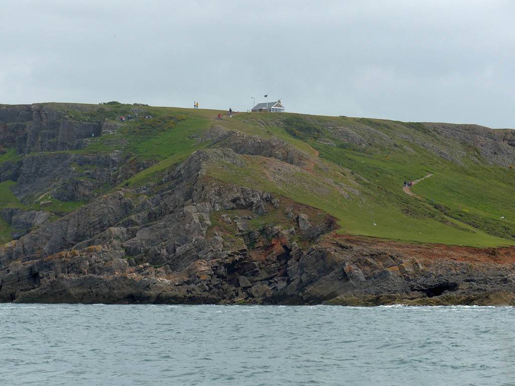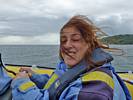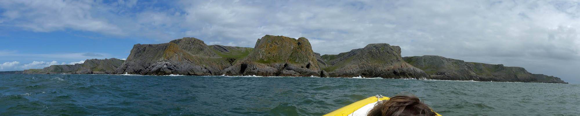 At 11AM with everyone gathered the briefing started. We were given extra fleeces and waterproofs to use as well as life jackets. Then we went to the water's edge to wait for the boat. Early sunshine had gone for now as showers passed nearby. But luckily they didn't reach us. We had fun paddling until the boat arrived just after 11:30AM. We soon boarded and were on our way. The bay was fairly calm but once out into open water it was rather choppy and rough. We battered our way through the waves a fair way from land and after a pause near Port-Eynon Bay we eventually reached and encircled Worm's Head, having gotten a soaking from the spray on the way. On the lee side it was much calmer and we could enjoy the bird colonies on the cliff faces and seals in the water. A blow hole also made for a spectacular show. By now Renée wasn't feeling so good. Soon we crossed over the top of the causeway as the water rose towards high tide and followed the coast back to start. Alas Renée succumbed to the conditions and let go of her breakfast. No problem as the skipper sloshed it all off the boat with sea water and noted that someone has to feed the fish! Back in Oxwich Bay we paused at a lobster pot where a large Spider Crab and a Hermit Crab were shown to us. Then much to Renée's relief we returned to start and disembarked at 1:25PM. It was a fun ride but conditions were a tad bumpy.