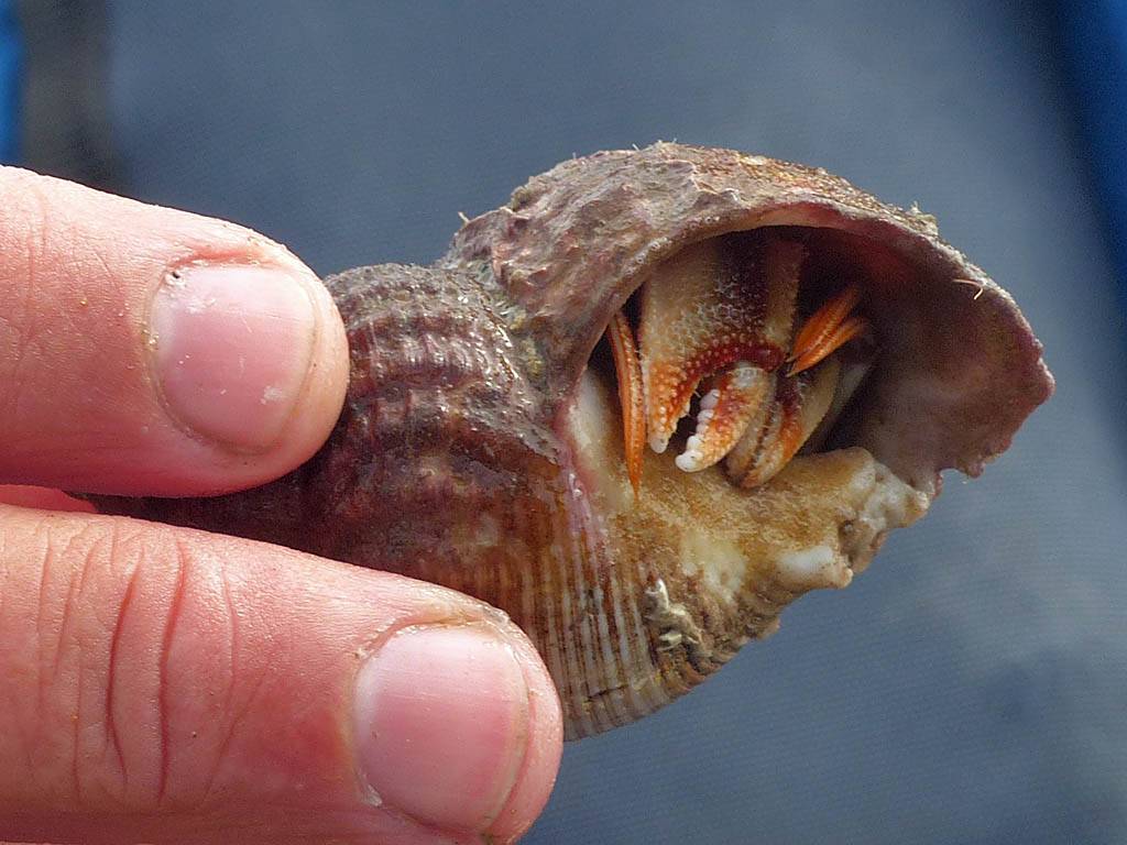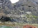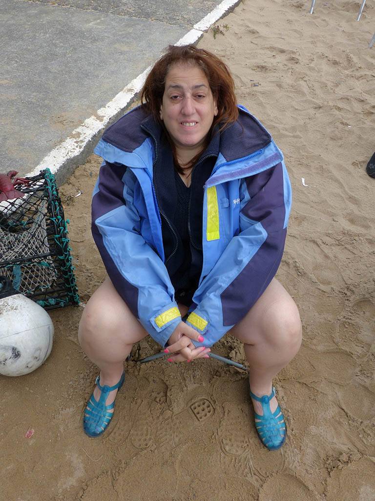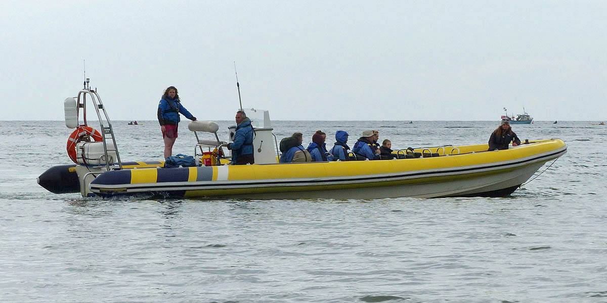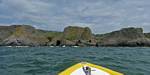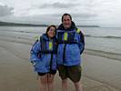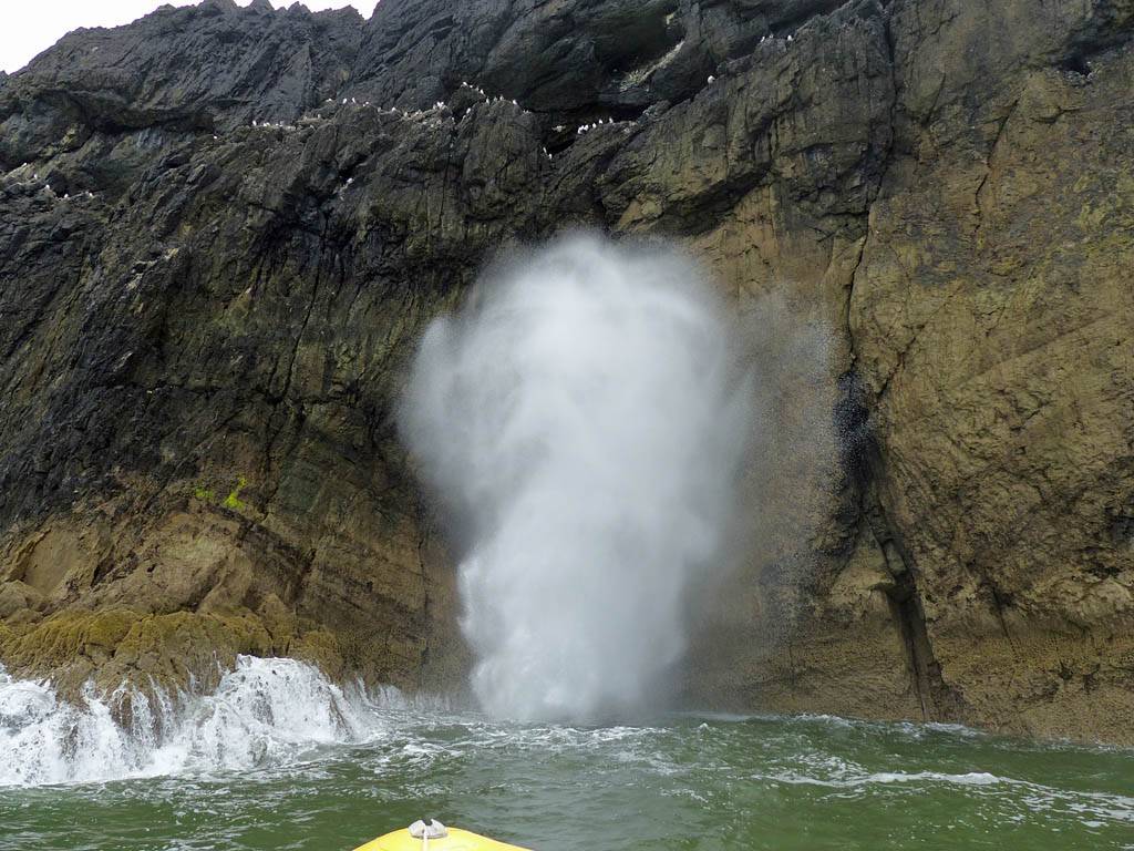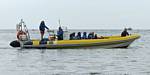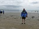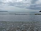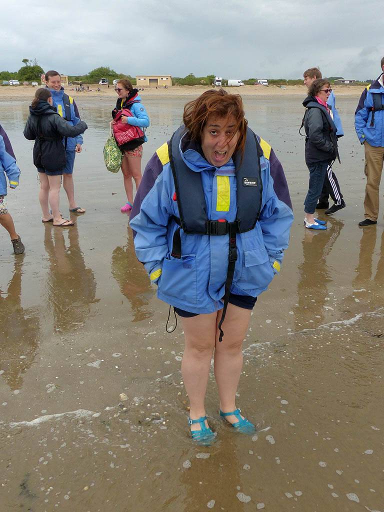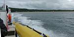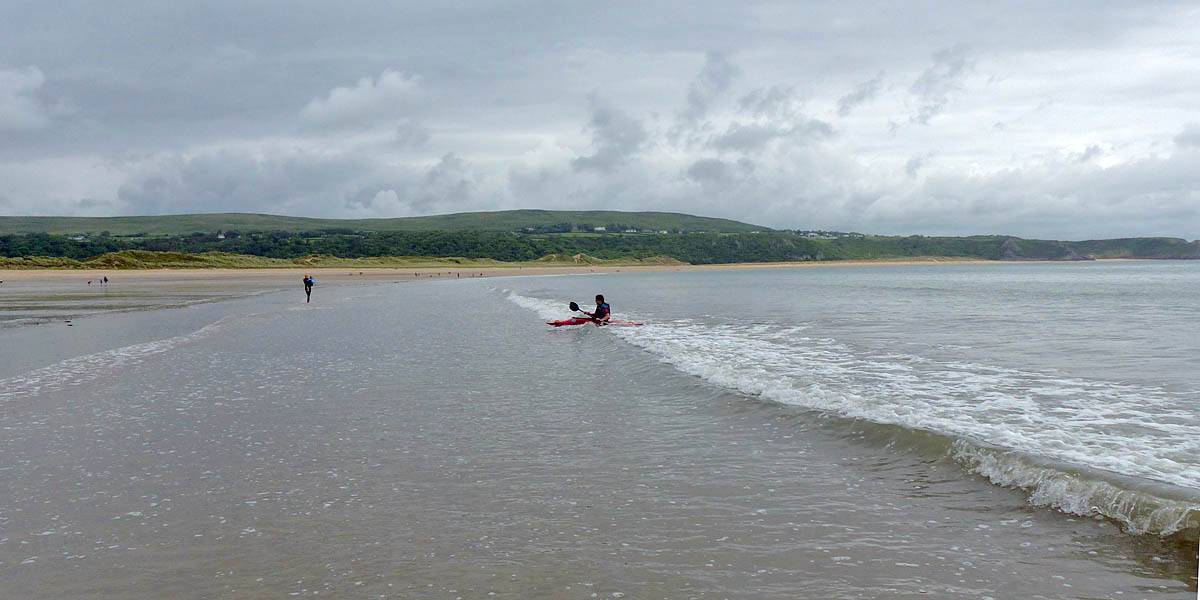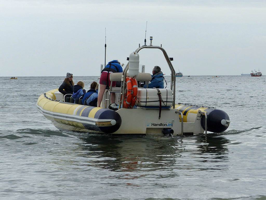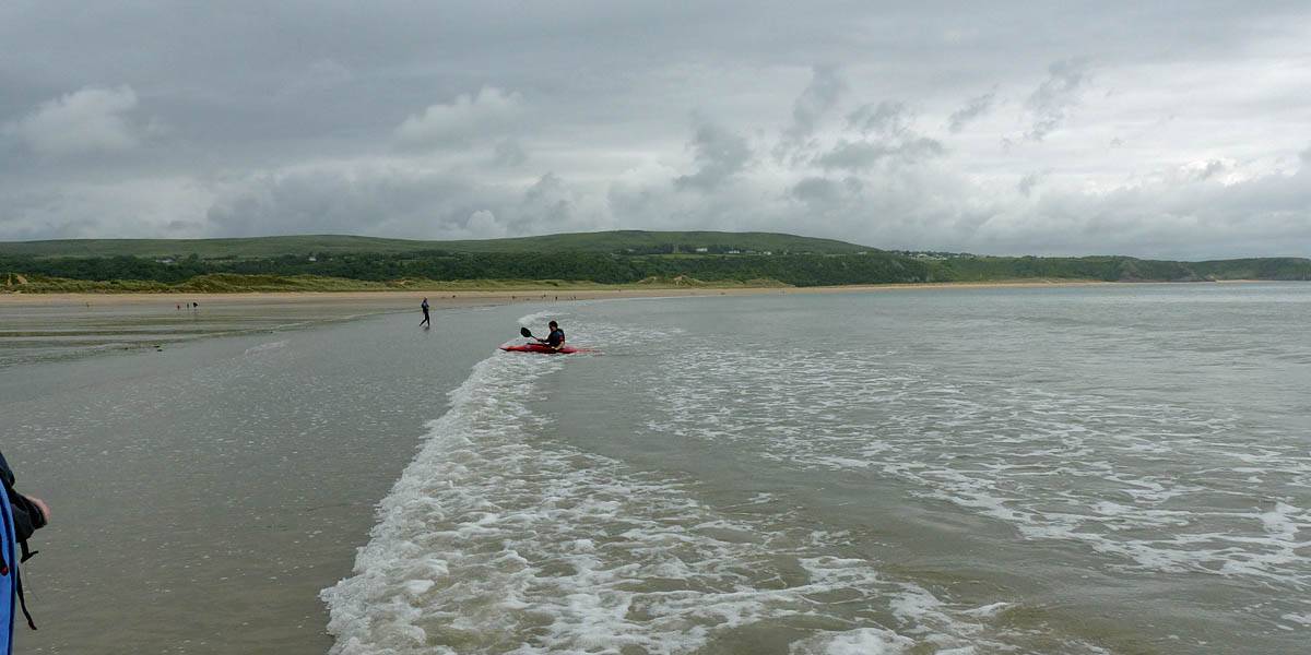 At 11AM with everyone gathered the briefing started. We were given extra fleeces and waterproofs to use as well as life jackets. Then we went to the water's edge to wait for the boat. Early sunshine had gone for now as showers passed nearby. But luckily they didn't reach us. We had fun paddling until the boat arrived just after 11:30AM. We soon boarded and were on our way. The bay was fairly calm but once out into open water it was rather choppy and rough. We battered our way through the waves a fair way from land and after a pause near Port-Eynon Bay we eventually reached and encircled Worm's Head, having gotten a soaking from the spray on the way. On the lee side it was much calmer and we could enjoy the bird colonies on the cliff faces and seals in the water. A blow hole also made for a spectacular show. By now Renée wasn't feeling so good. Soon we crossed over the top of the causeway as the water rose towards high tide and followed the coast back to start. Alas Renée succumbed to the conditions and let go of her breakfast. No problem as the skipper sloshed it all off the boat with sea water and noted that someone has to feed the fish! Back in Oxwich Bay we paused at a lobster pot where a large Spider Crab and a Hermit Crab were shown to us. Then much to Renée's relief we returned to start and disembarked at 1:25PM. It was a fun ride but conditions were a tad bumpy.
