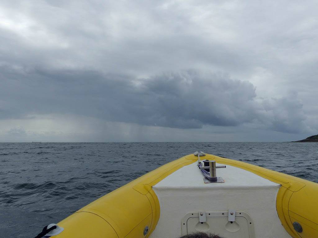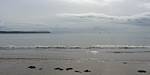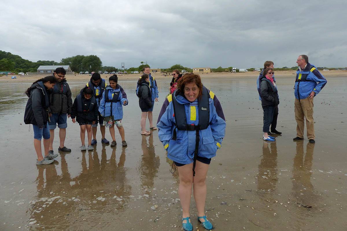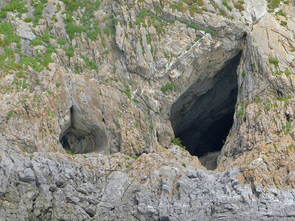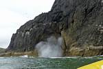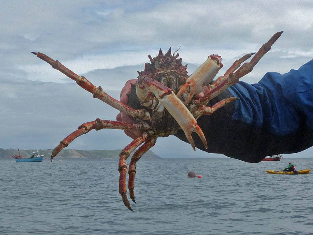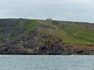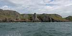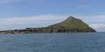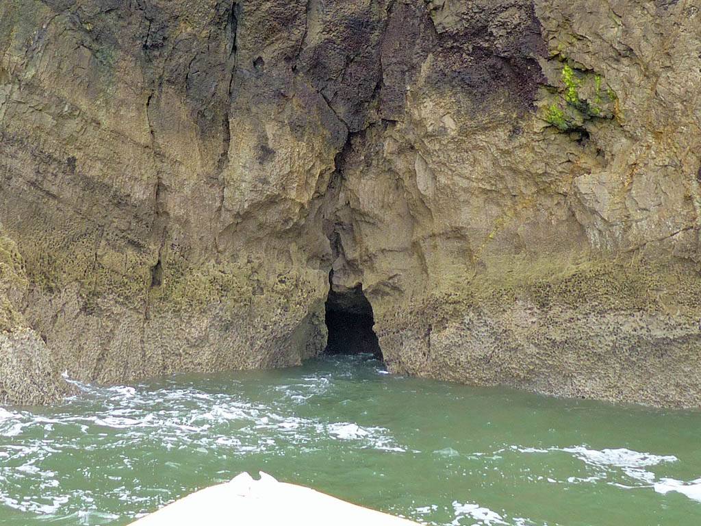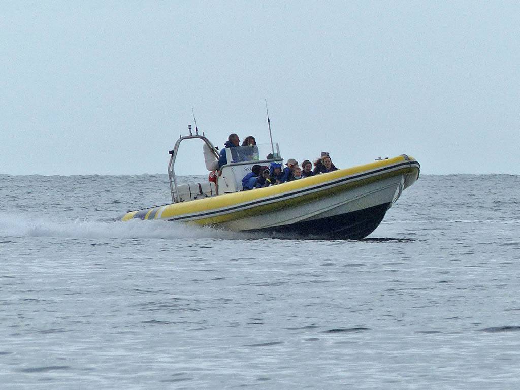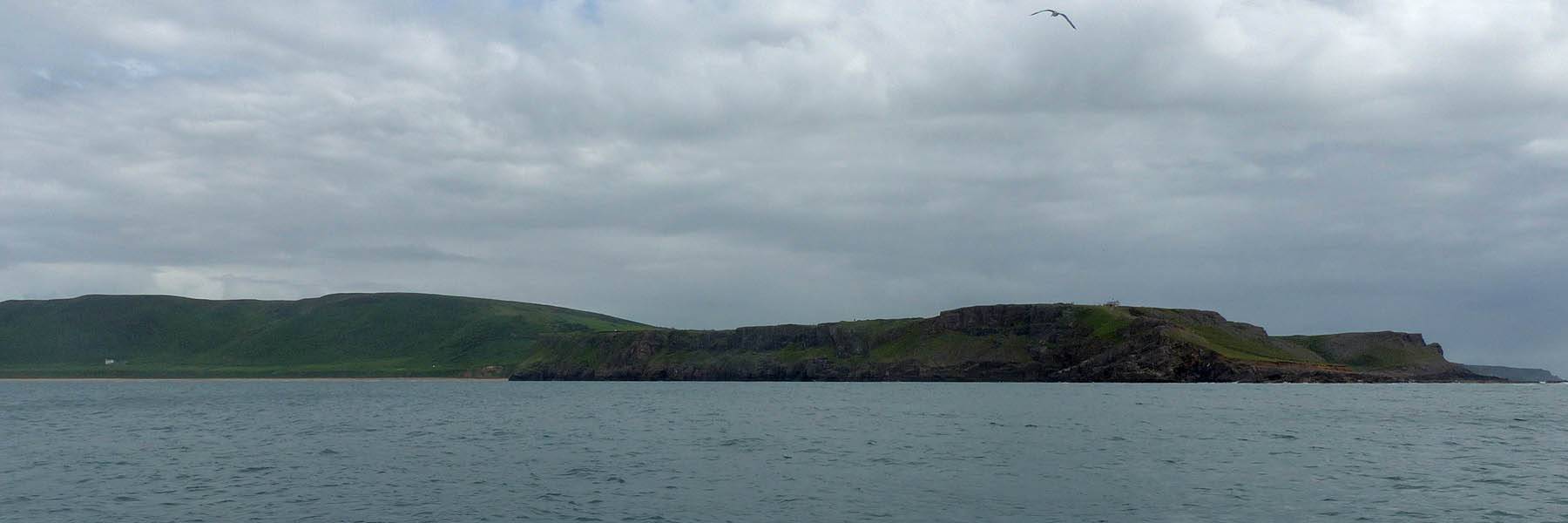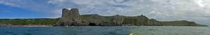 At 11AM with everyone gathered the briefing started. We were given extra fleeces and waterproofs to use as well as life jackets. Then we went to the water's edge to wait for the boat. Early sunshine had gone for now as showers passed nearby. But luckily they didn't reach us. We had fun paddling until the boat arrived just after 11:30AM. We soon boarded and were on our way. The bay was fairly calm but once out into open water it was rather choppy and rough. We battered our way through the waves a fair way from land and after a pause near Port-Eynon Bay we eventually reached and encircled Worm's Head, having gotten a soaking from the spray on the way. On the lee side it was much calmer and we could enjoy the bird colonies on the cliff faces and seals in the water. A blow hole also made for a spectacular show. By now Renée wasn't feeling so good. Soon we crossed over the top of the causeway as the water rose towards high tide and followed the coast back to start. Alas Renée succumbed to the conditions and let go of her breakfast. No problem as the skipper sloshed it all off the boat with sea water and noted that someone has to feed the fish! Back in Oxwich Bay we paused at a lobster pot where a large Spider Crab and a Hermit Crab were shown to us. Then much to Renée's relief we returned to start and disembarked at 1:25PM. It was a fun ride but conditions were a tad bumpy.