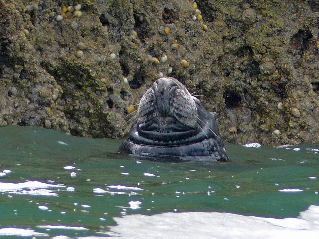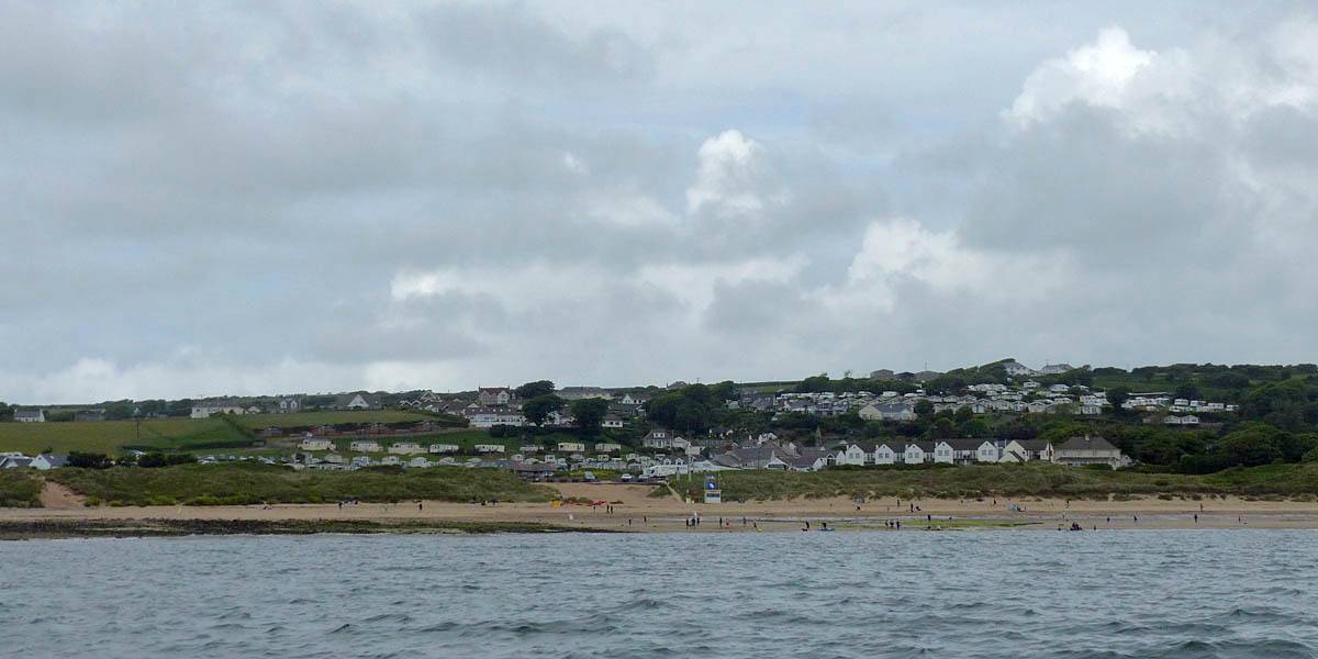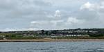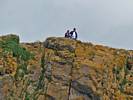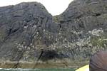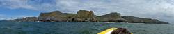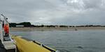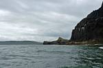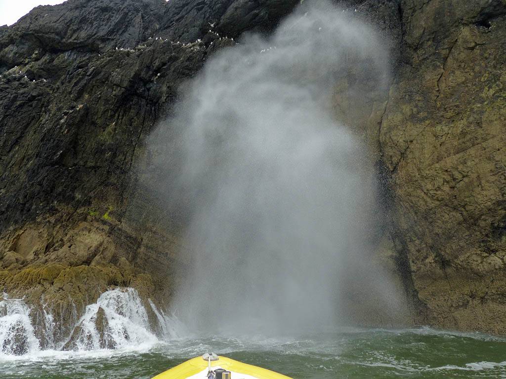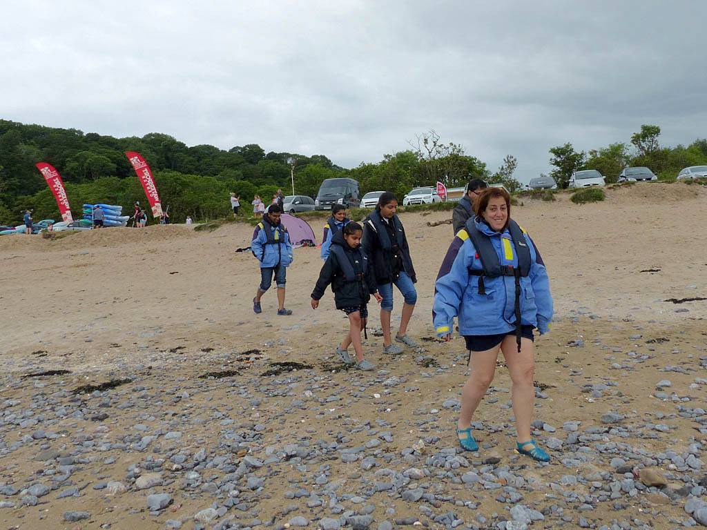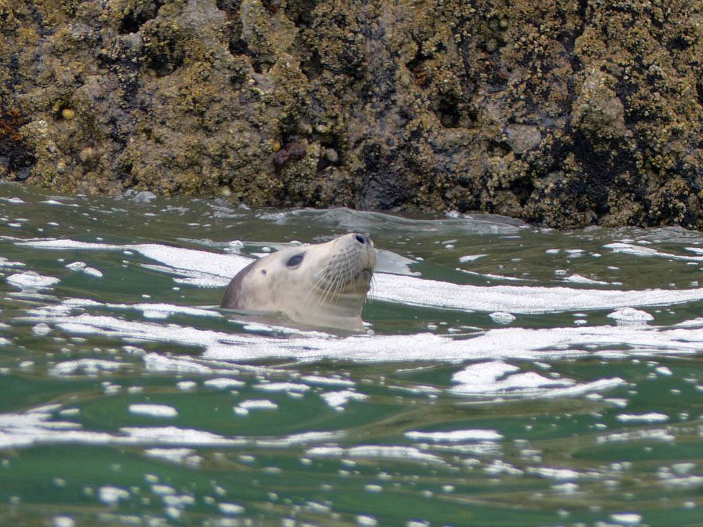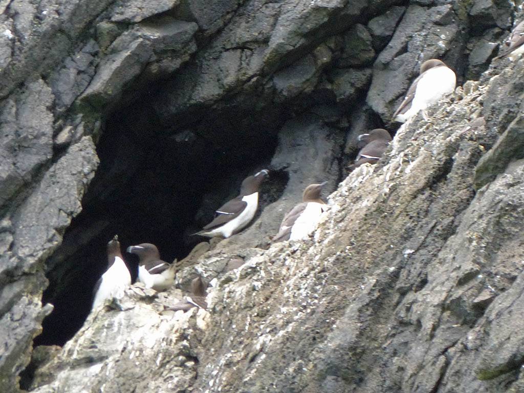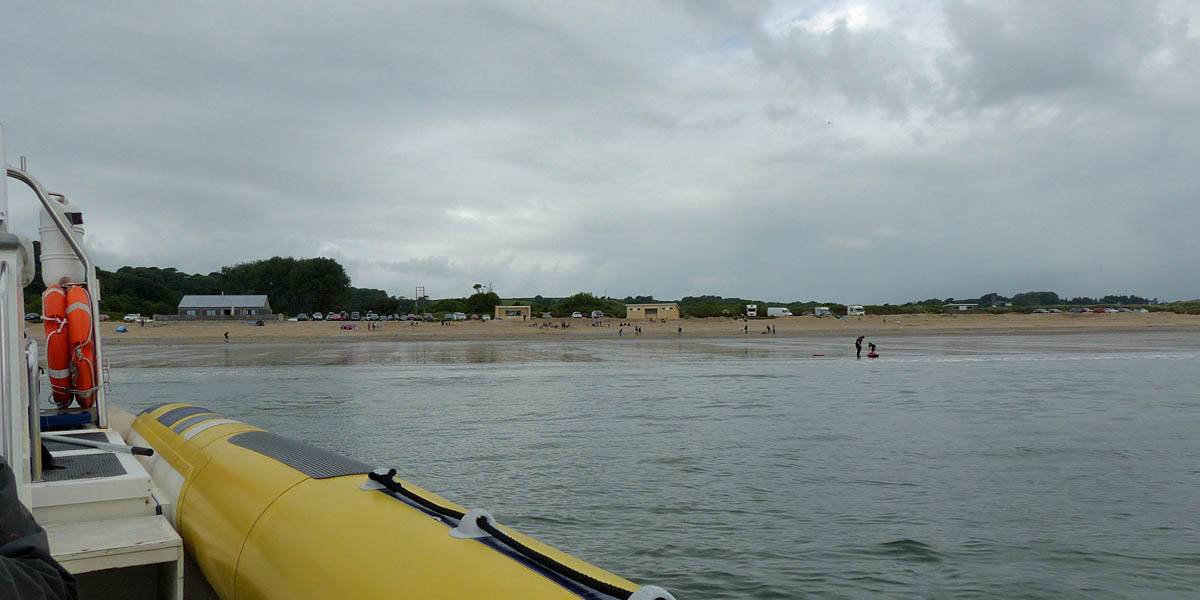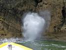 At 11AM with everyone gathered the briefing started. We were given extra fleeces and waterproofs to use as well as life jackets. Then we went to the water's edge to wait for the boat. Early sunshine had gone for now as showers passed nearby. But luckily they didn't reach us. We had fun paddling until the boat arrived just after 11:30AM. We soon boarded and were on our way. The bay was fairly calm but once out into open water it was rather choppy and rough. We battered our way through the waves a fair way from land and after a pause near Port-Eynon Bay we eventually reached and encircled Worm's Head, having gotten a soaking from the spray on the way. On the lee side it was much calmer and we could enjoy the bird colonies on the cliff faces and seals in the water. A blow hole also made for a spectacular show. By now Renée wasn't feeling so good. Soon we crossed over the top of the causeway as the water rose towards high tide and followed the coast back to start. Alas Renée succumbed to the conditions and let go of her breakfast. No problem as the skipper sloshed it all off the boat with sea water and noted that someone has to feed the fish! Back in Oxwich Bay we paused at a lobster pot where a large Spider Crab and a Hermit Crab were shown to us. Then much to Renée's relief we returned to start and disembarked at 1:25PM. It was a fun ride but conditions were a tad bumpy.