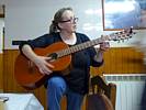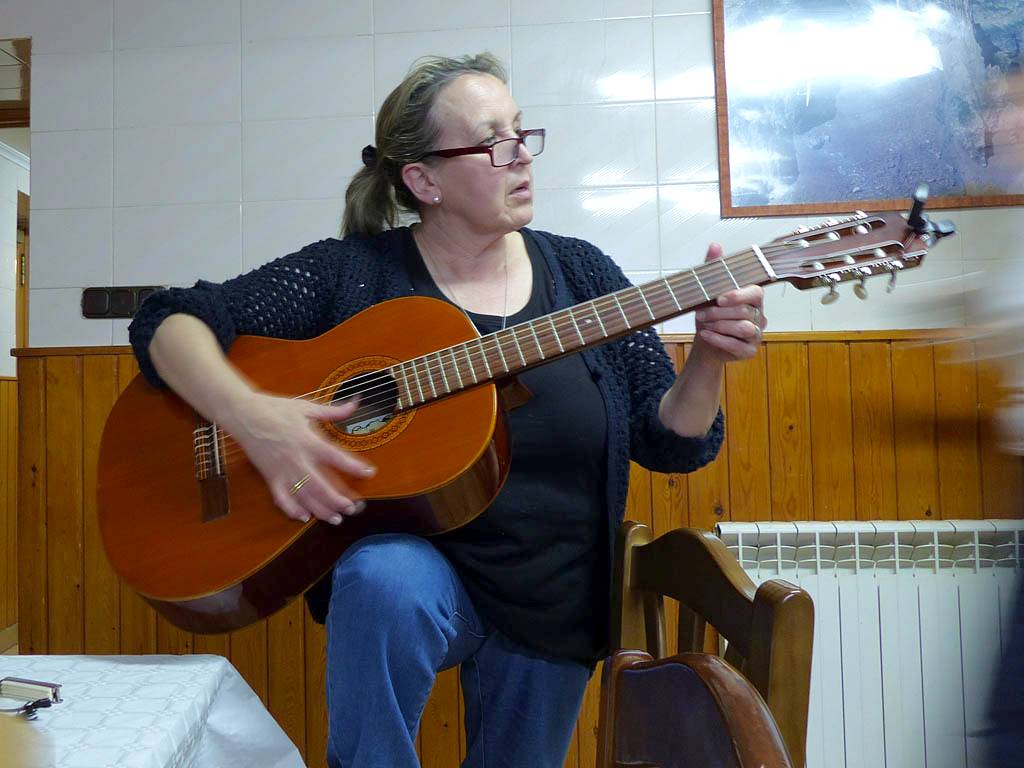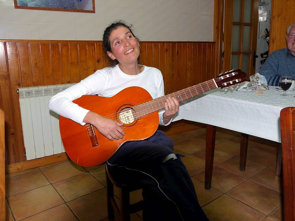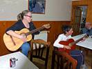 Arriving at Bar Ascaso. | Assembling inthe breakfast room and eating. | Toya playing the guitar. |