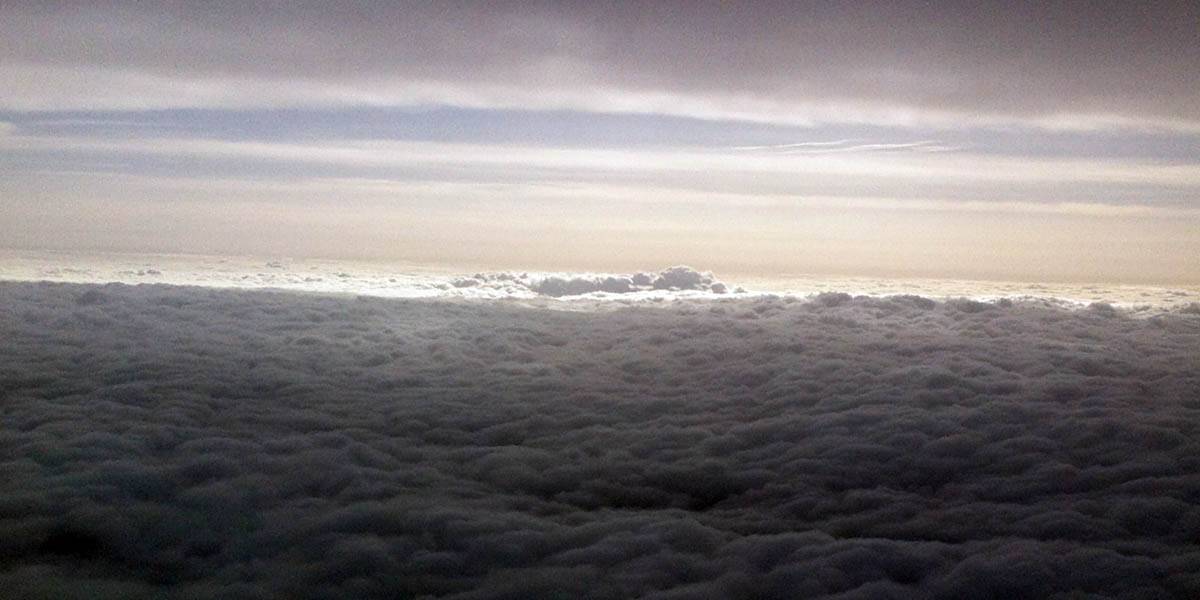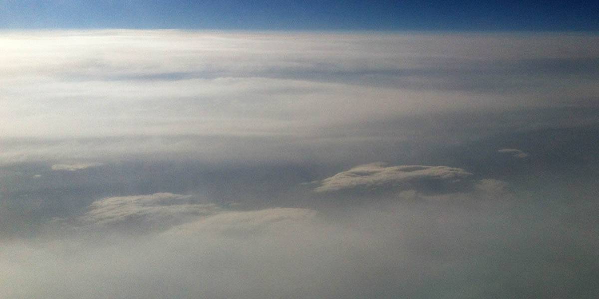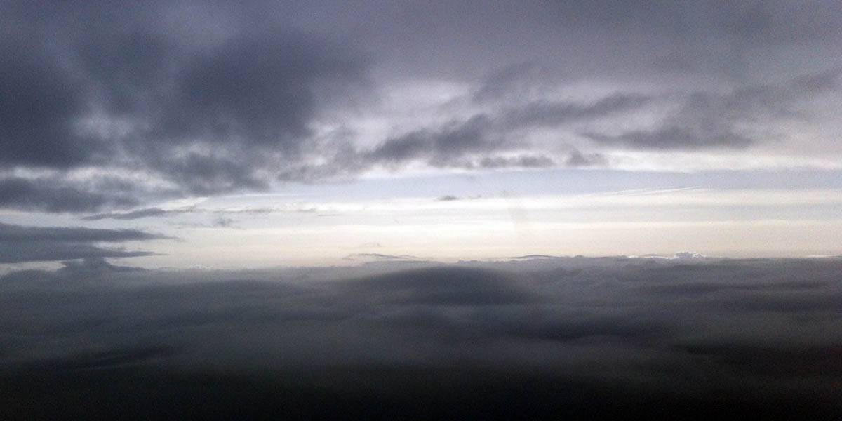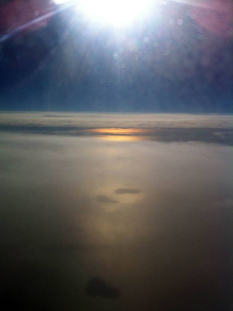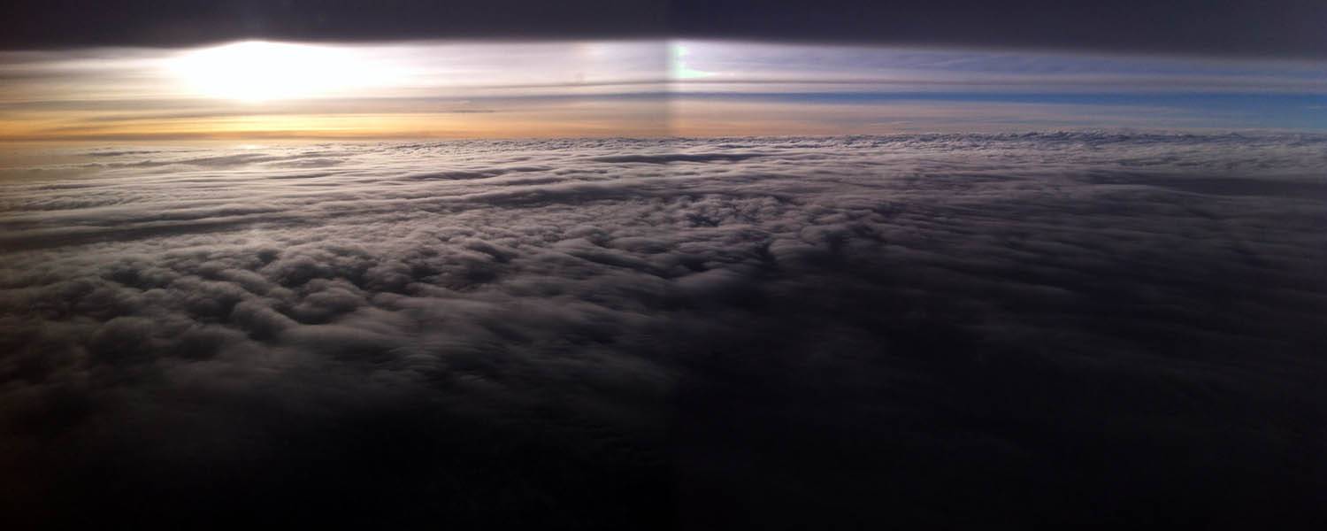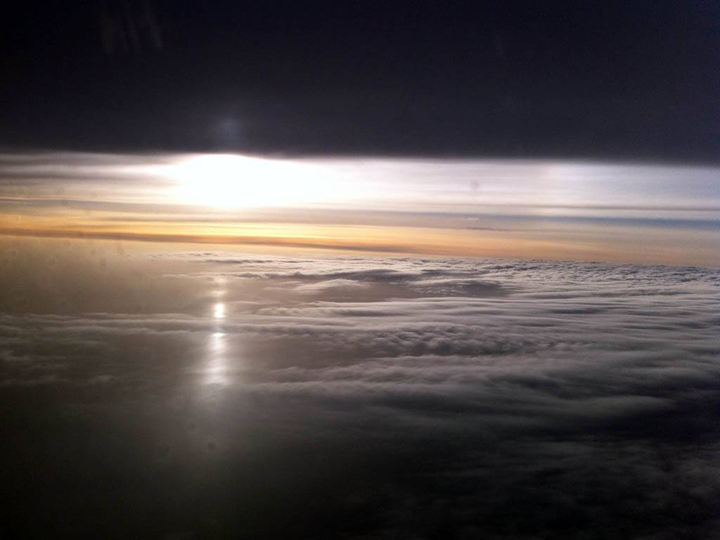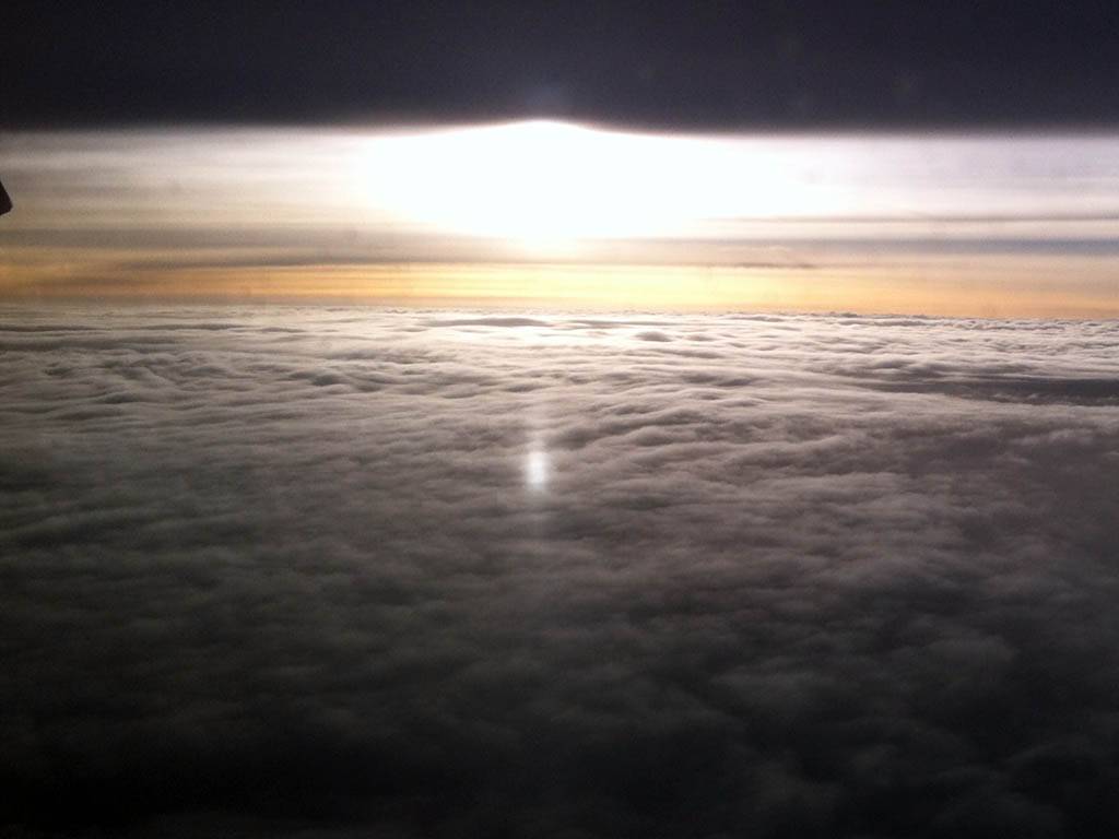 More views of the Isle of Wight and the Solent. | Nicer cloudscapes over England. | Nice sun pillar caused by reflection in ice crystals below us. | Cloudscape panorama. | Subsun caused by reflection in ice crystals suspended below us. |