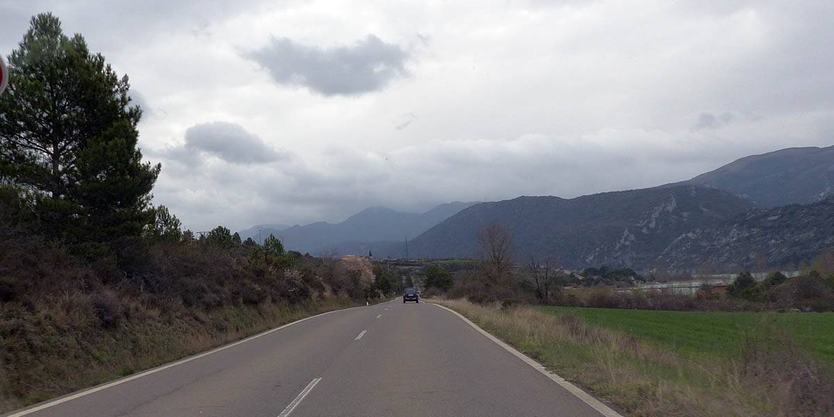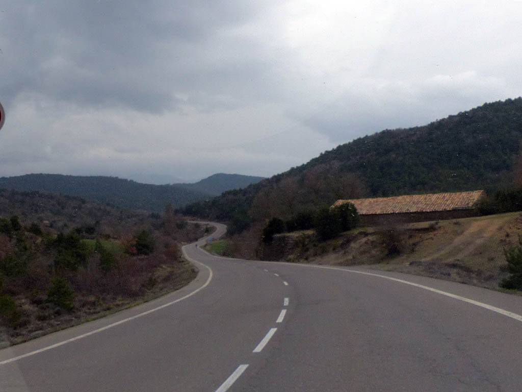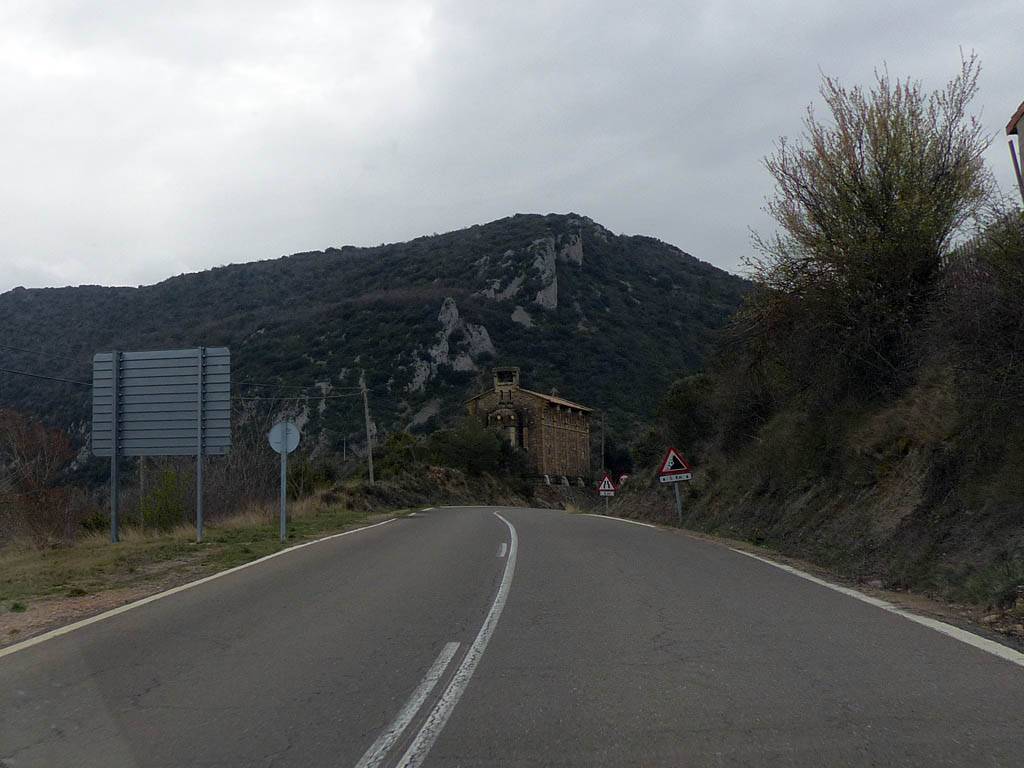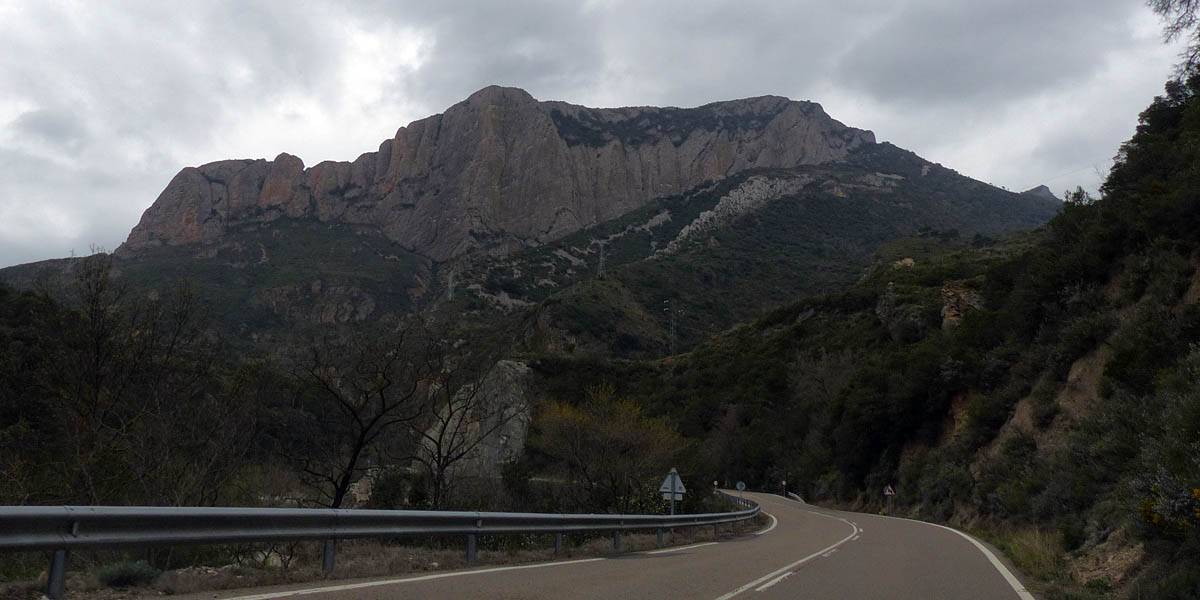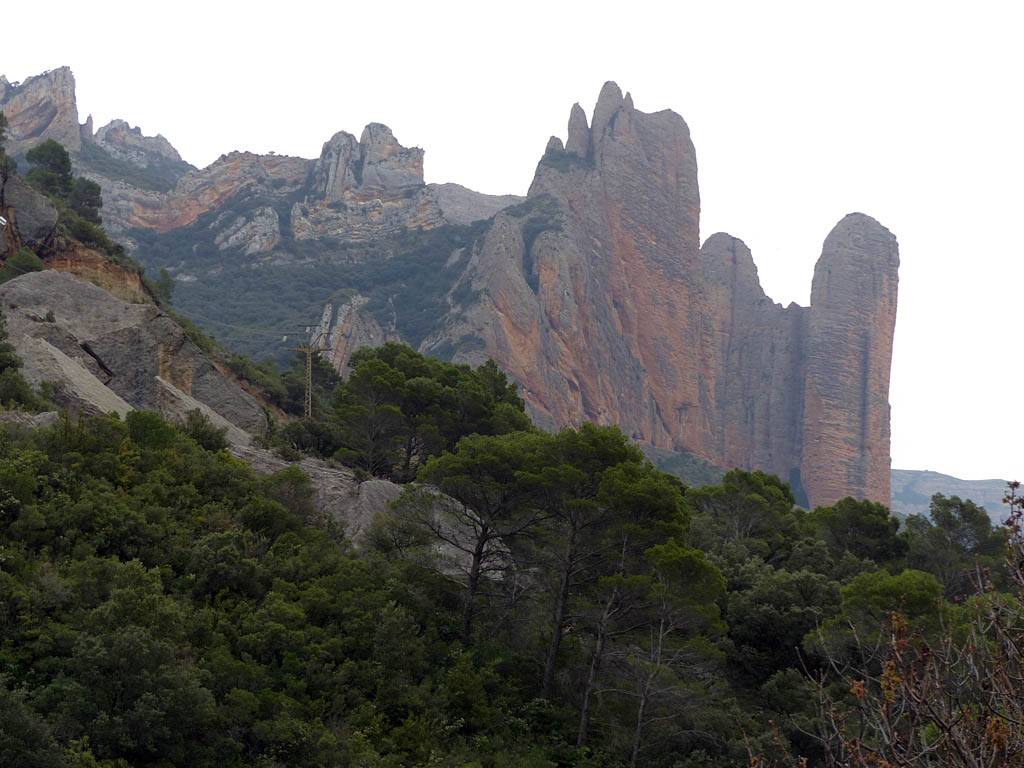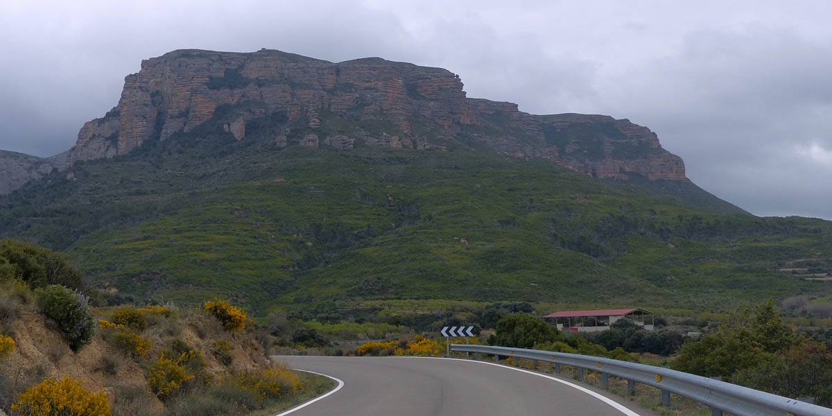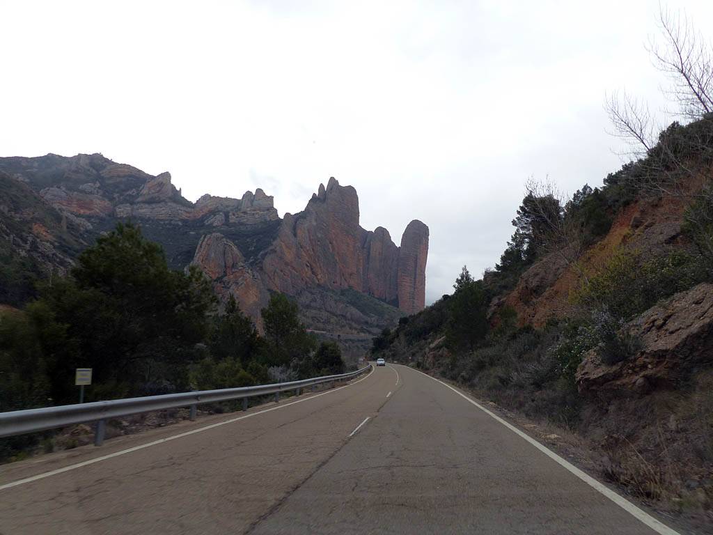 I woke up at 8AM feeling a more refreshed and had my last Bar Ascaso breakfast at 8:30AM. Then I packed up and vacated the room, and made my last egg sarnies. I was done by 10:30 and paid up at the bar. At 20 euros a night it was very reasonable. Then I relaxed for a while, updating my diary, ready to hit the scenic roads South towards Zaragoza. The plan was to start moving sometime before 12PM. In the end I left at 11:30AM. It was a fantastic drive with gorgeous scenery and lovely twisty sections and a great road surface. The Fiat felt good along here. Eventually as I drove above a lovely canyon the unmistakable sandstone pillars of Riglos came into view. After turning off the main road I got to Riglos at 12:30PM.