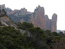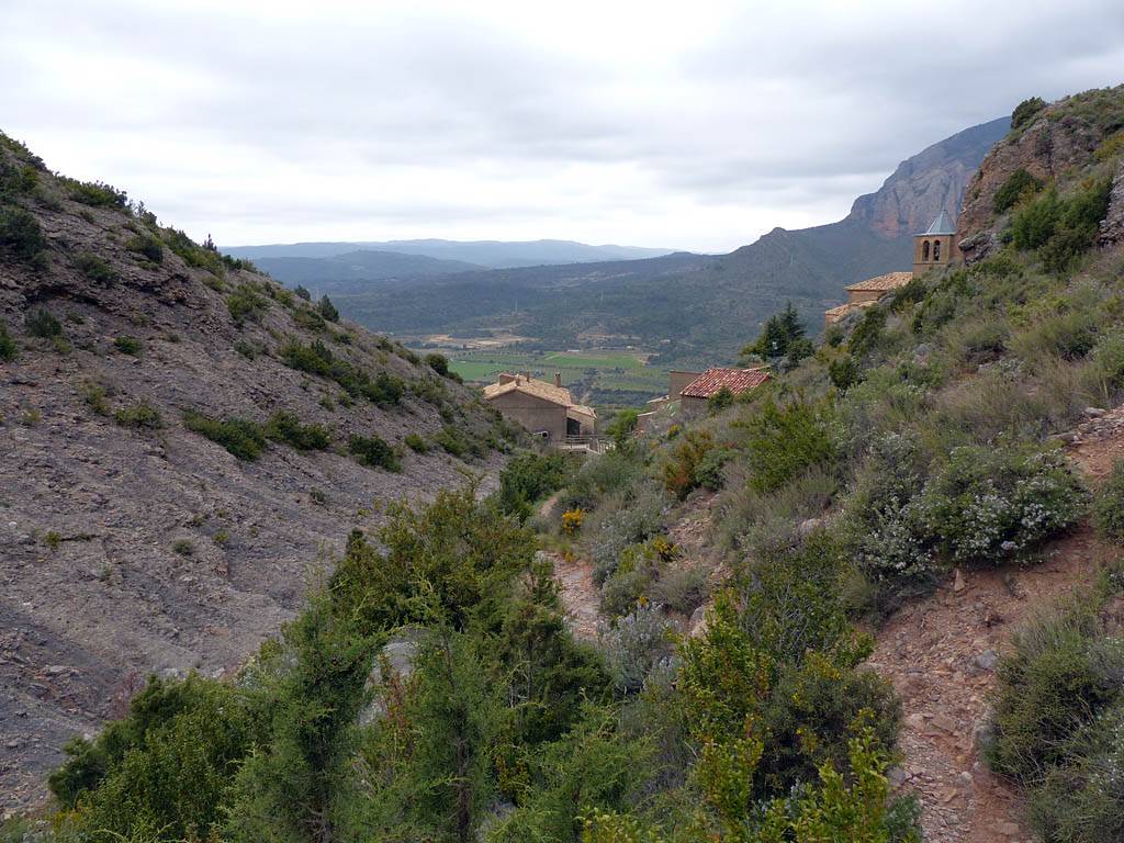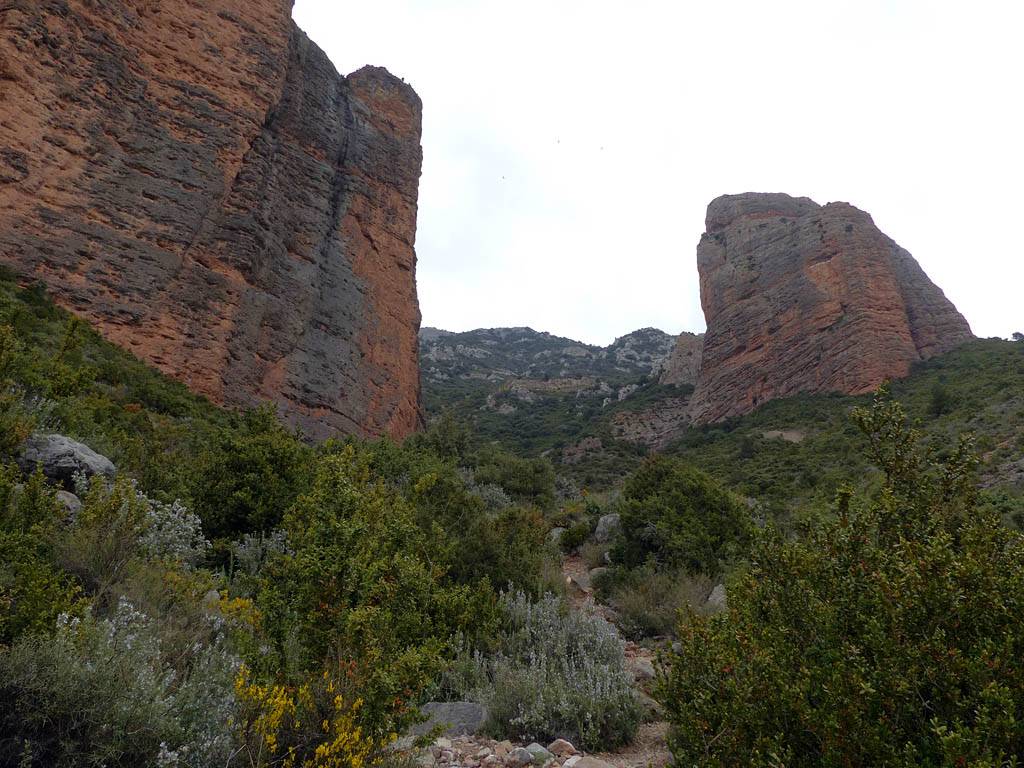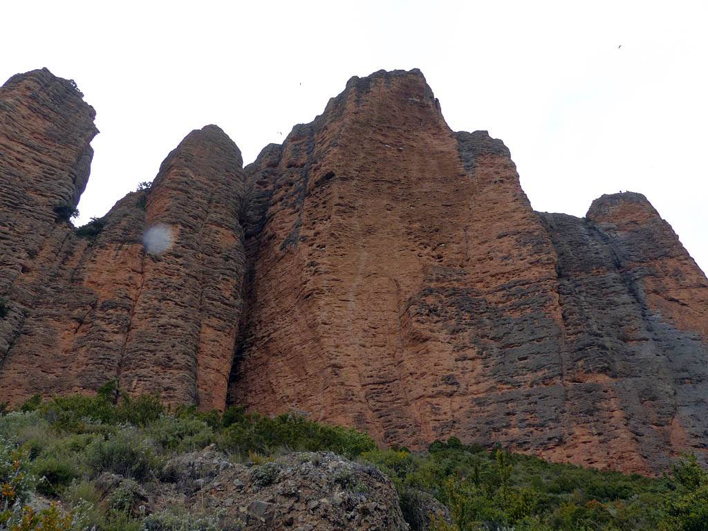 Macro shots of the local flowers on the hillside. | Looking back down at Riglos from the hill above to the East. | Looking up at the cliffs as light rain arrives. | Leaving Riglos back along the access road as the weather deteriorates. |