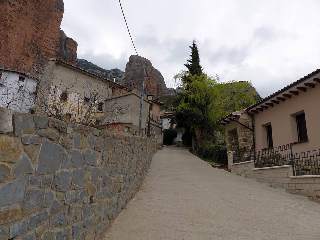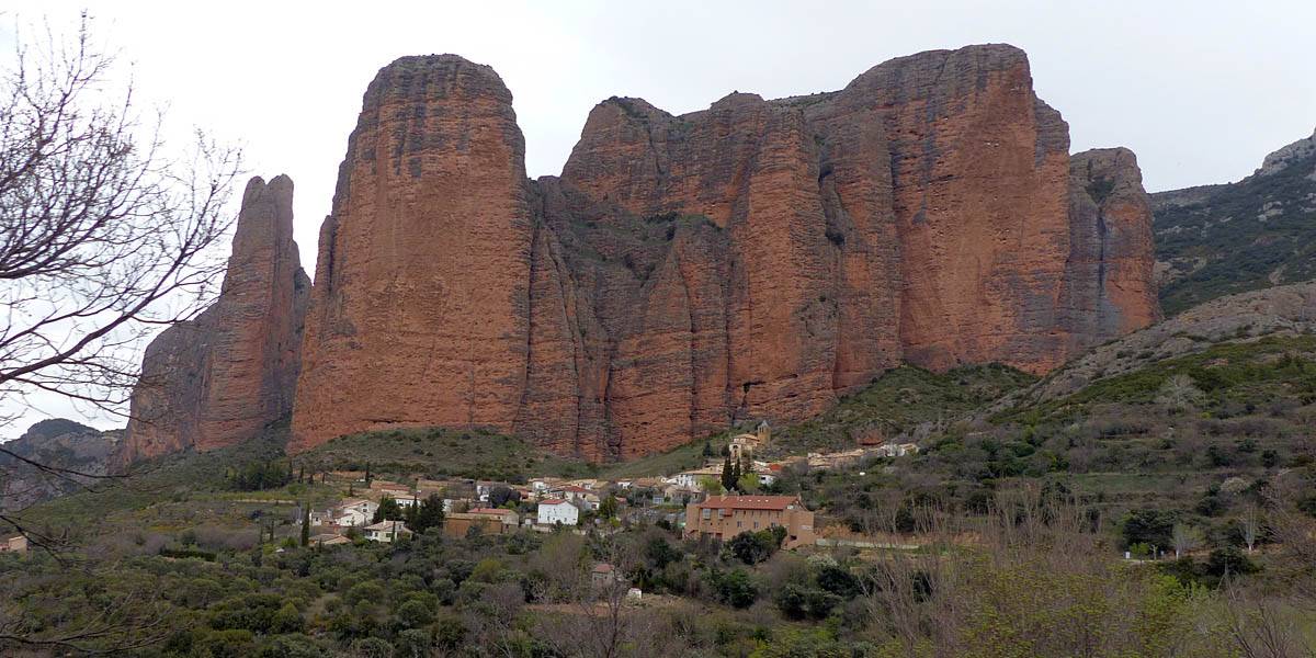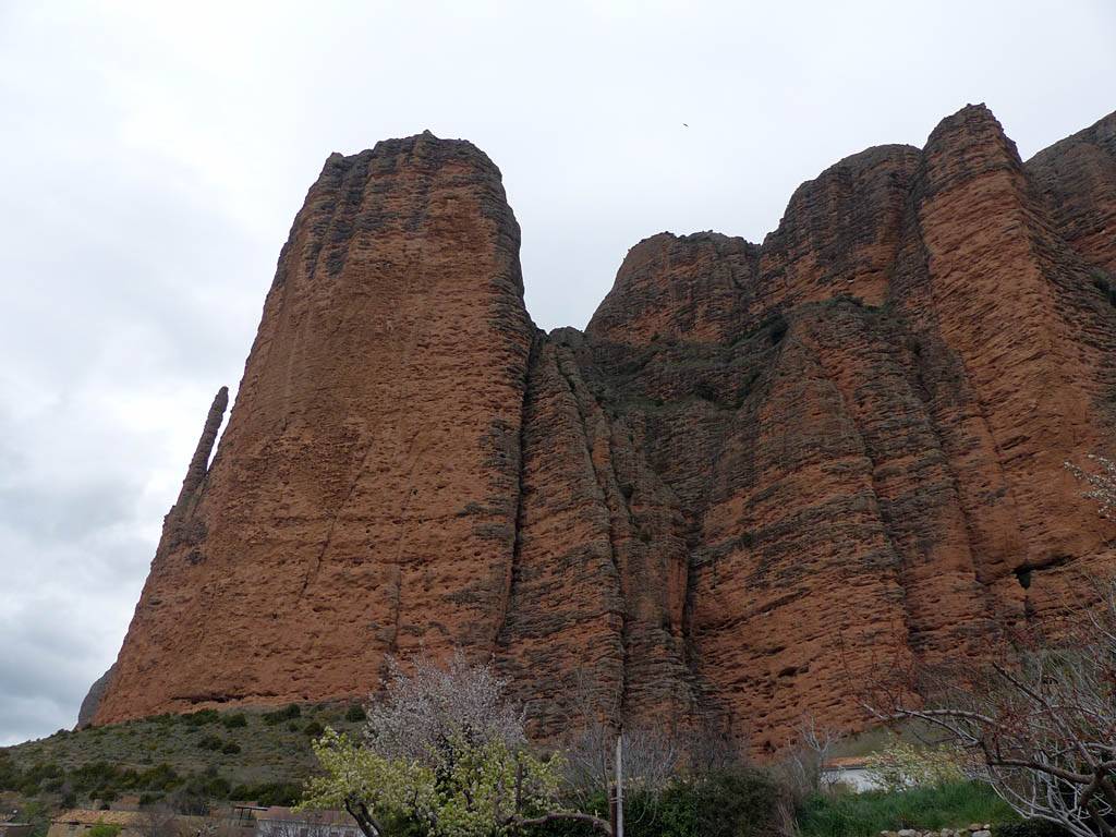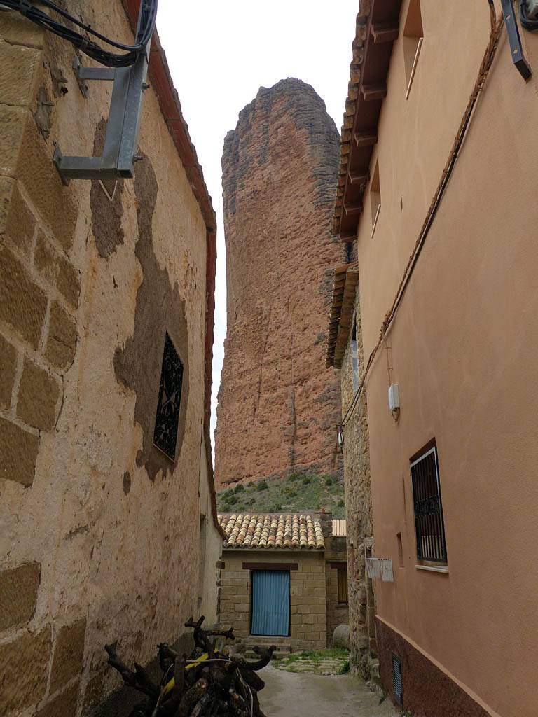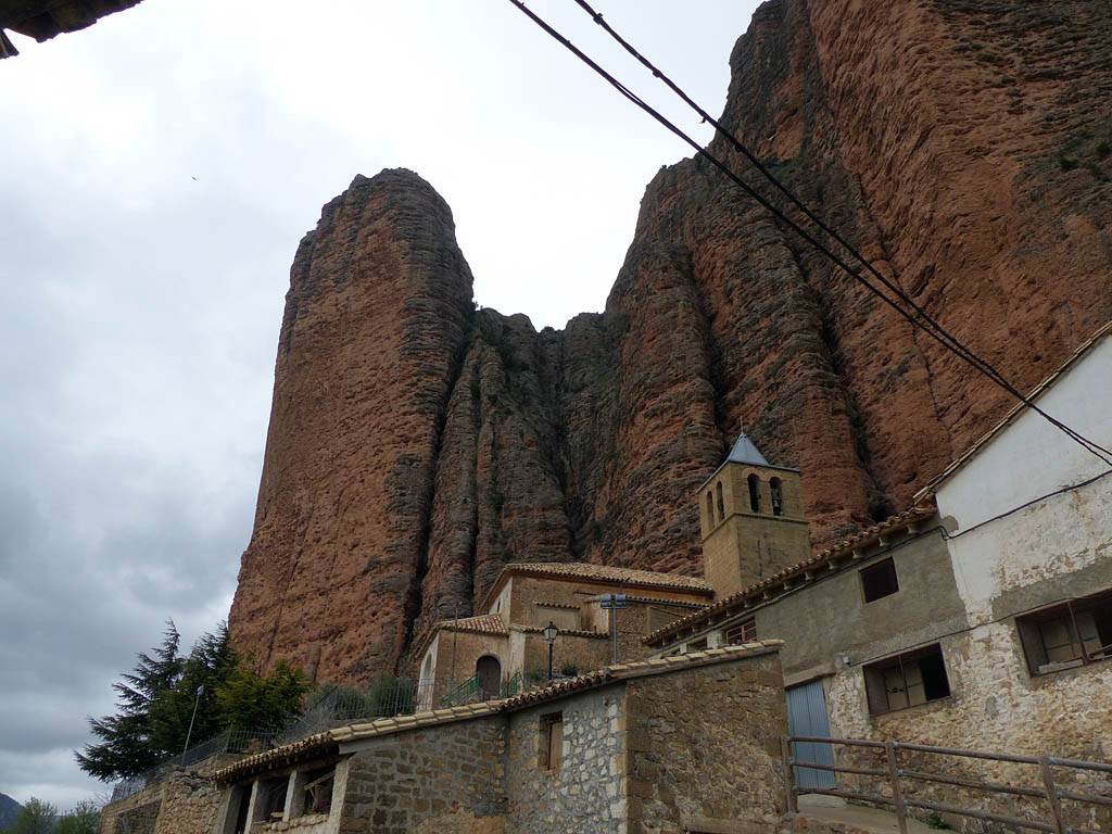 The huge sandstone cliffs of Riglos. | Exploring Riglos. | The cliffs tower above the village church. |