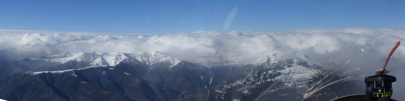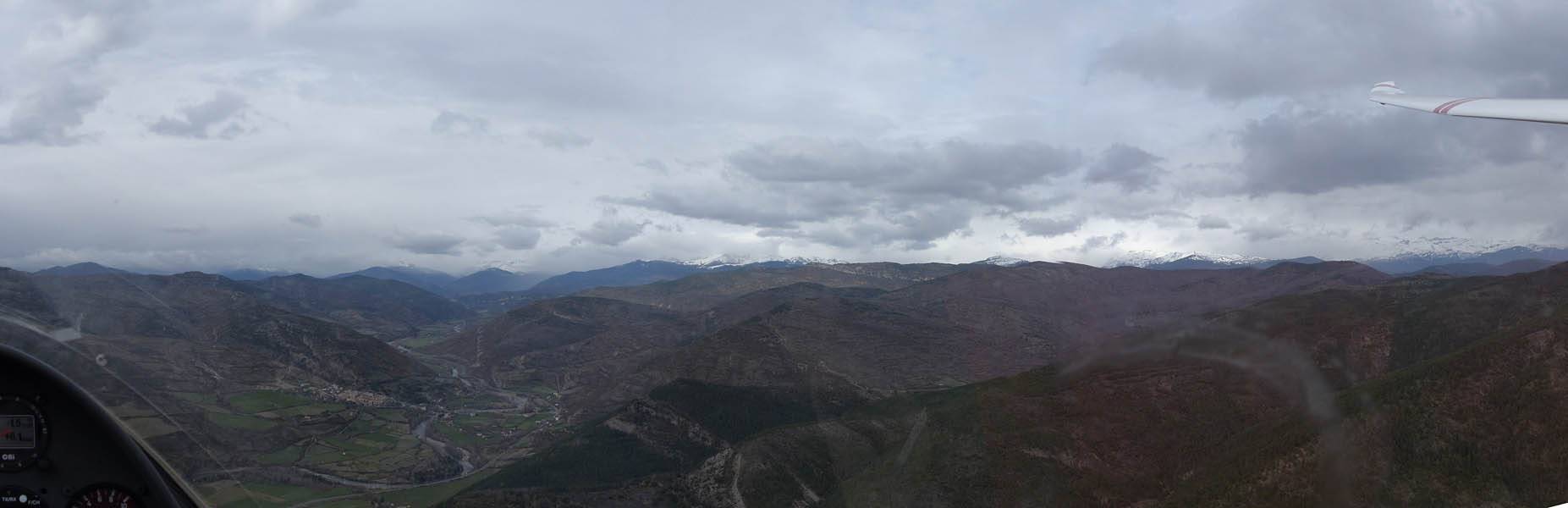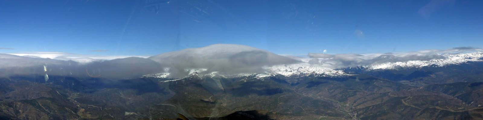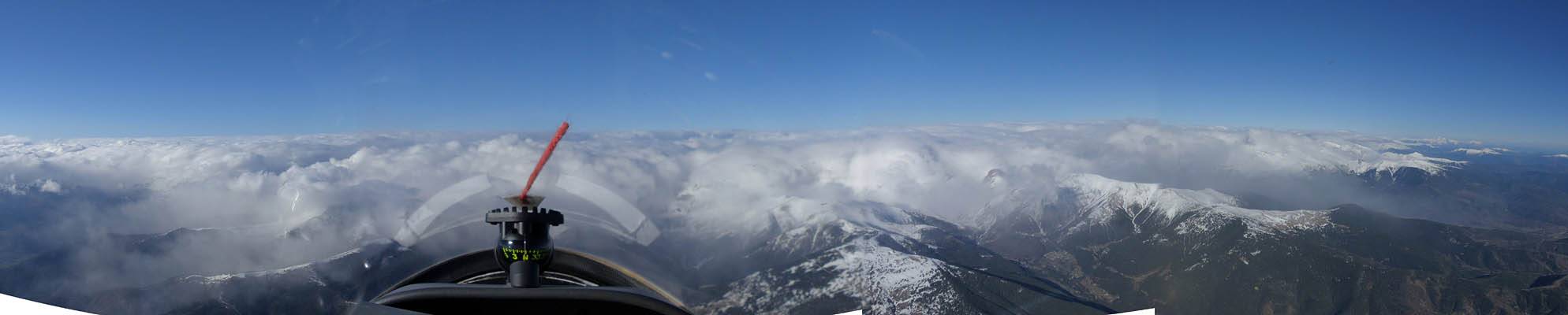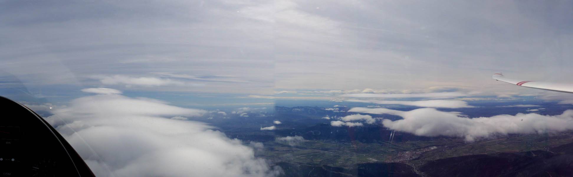 | A closer look at the local Pyrenees mountains. | 360 degree panorama as we climb away in wave above Javierregay. | Another view West and Southwest from above the lower clouds. |