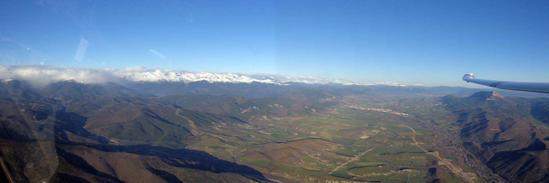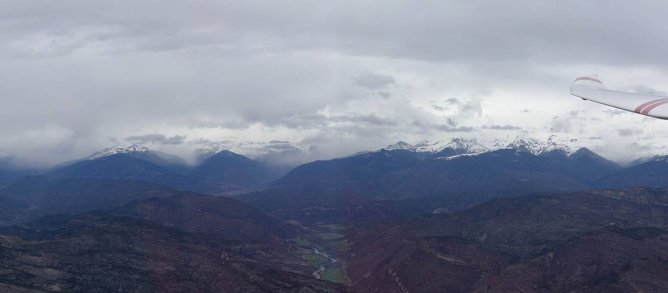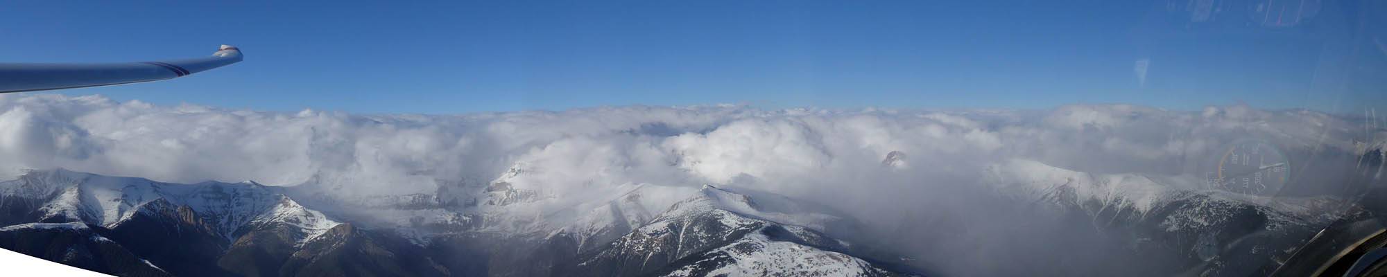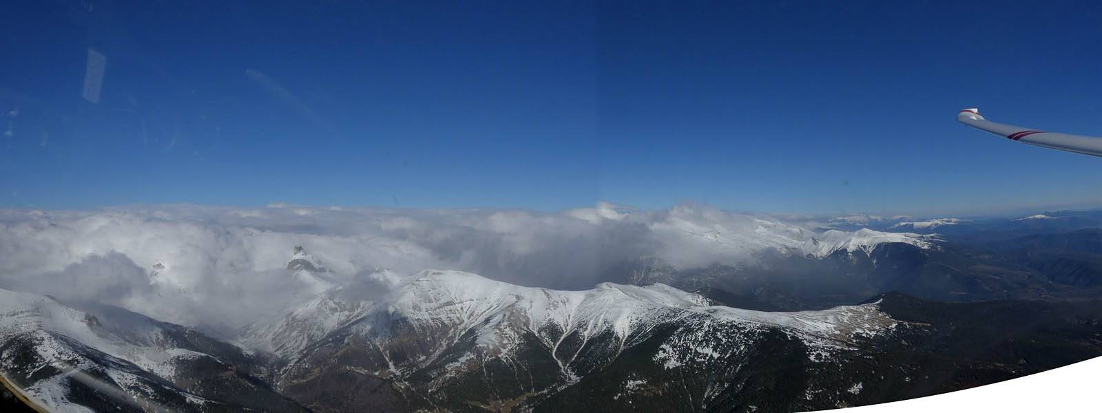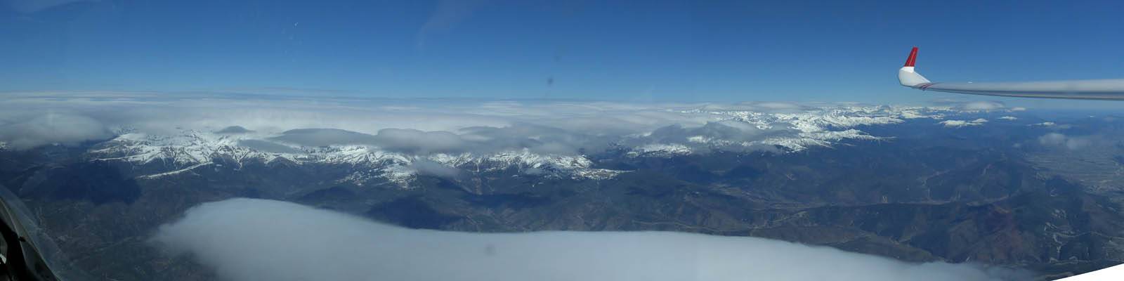 | A closer look at the local Pyrenees mountains. | 360 degree panorama as we climb away in wave above Javierregay. | Another view West and Southwest from above the lower clouds. |
