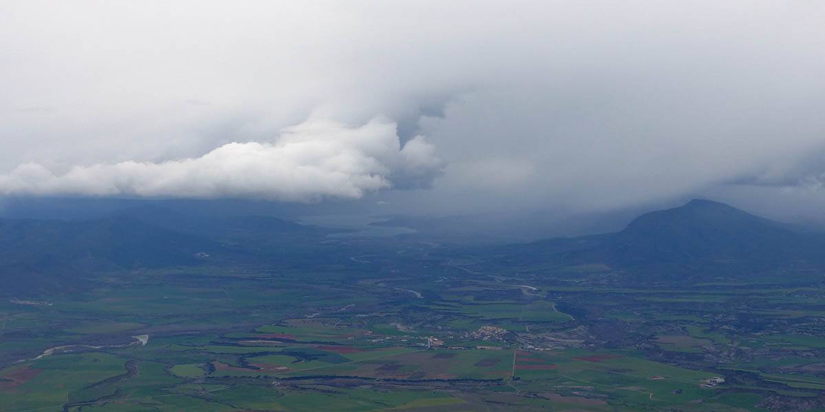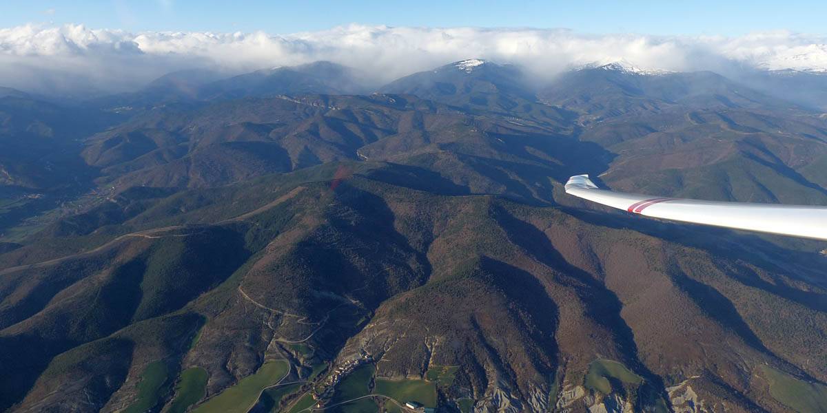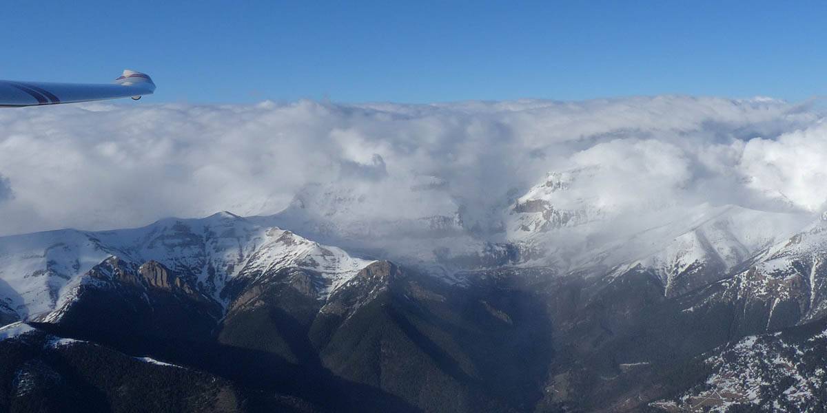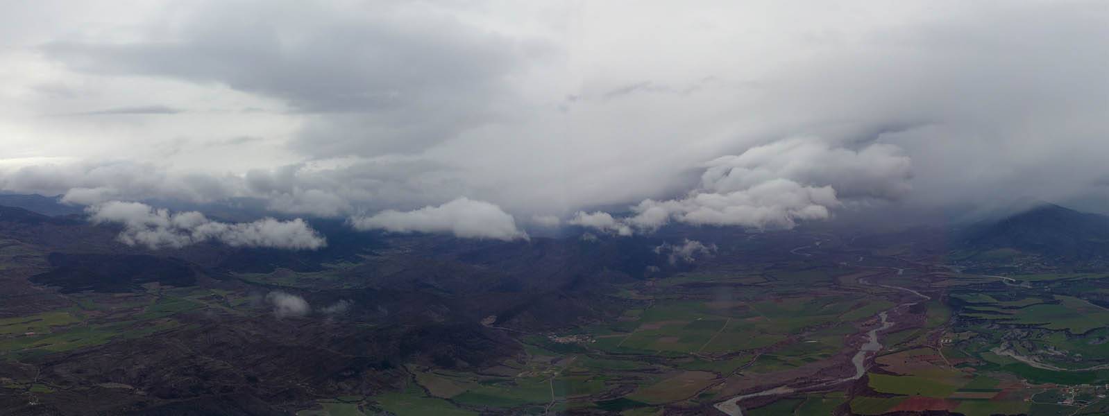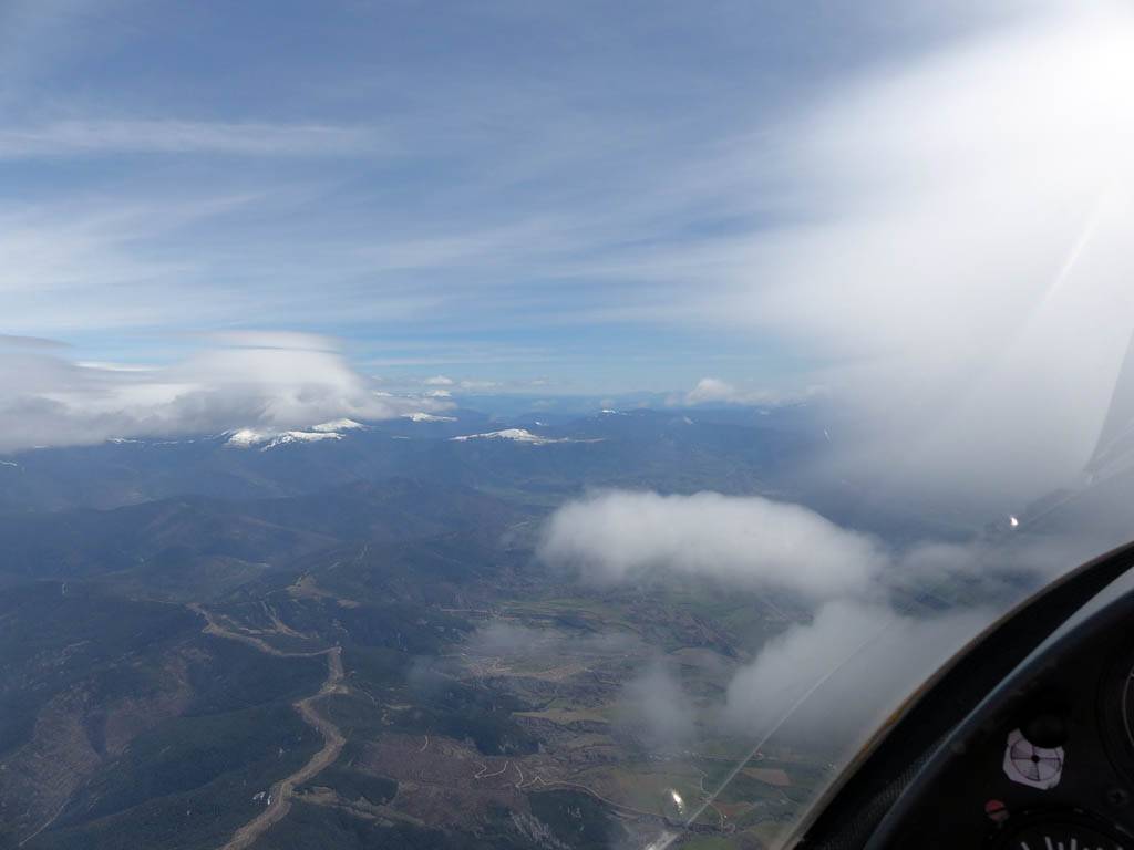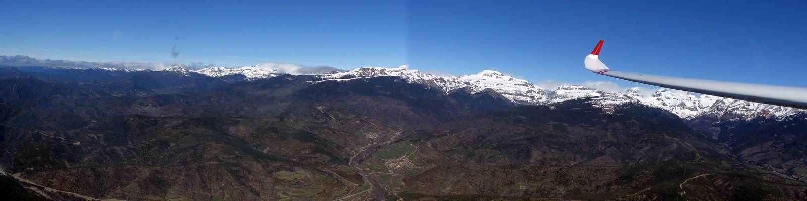 | A closer look at the local Pyrenees mountains. | 360 degree panorama as we climb away in wave above Javierregay. | Another view West and Southwest from above the lower clouds. |