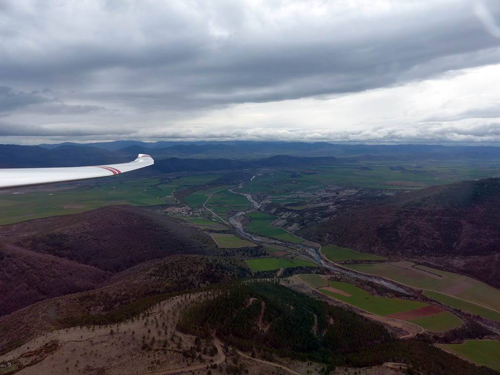 At 3:30PM John and I launched in the Duo Discus to stage 1. Here we soared in ridge lift on stage 1 before picking up thermals despite the overcast conditions. We followed the vultures around who were a great help in marking the lift at times. The climax of the flight was getting into weak wave over Javierregay to 6700 feet. nice! Eventually we descended to land after 2 hours exactly.