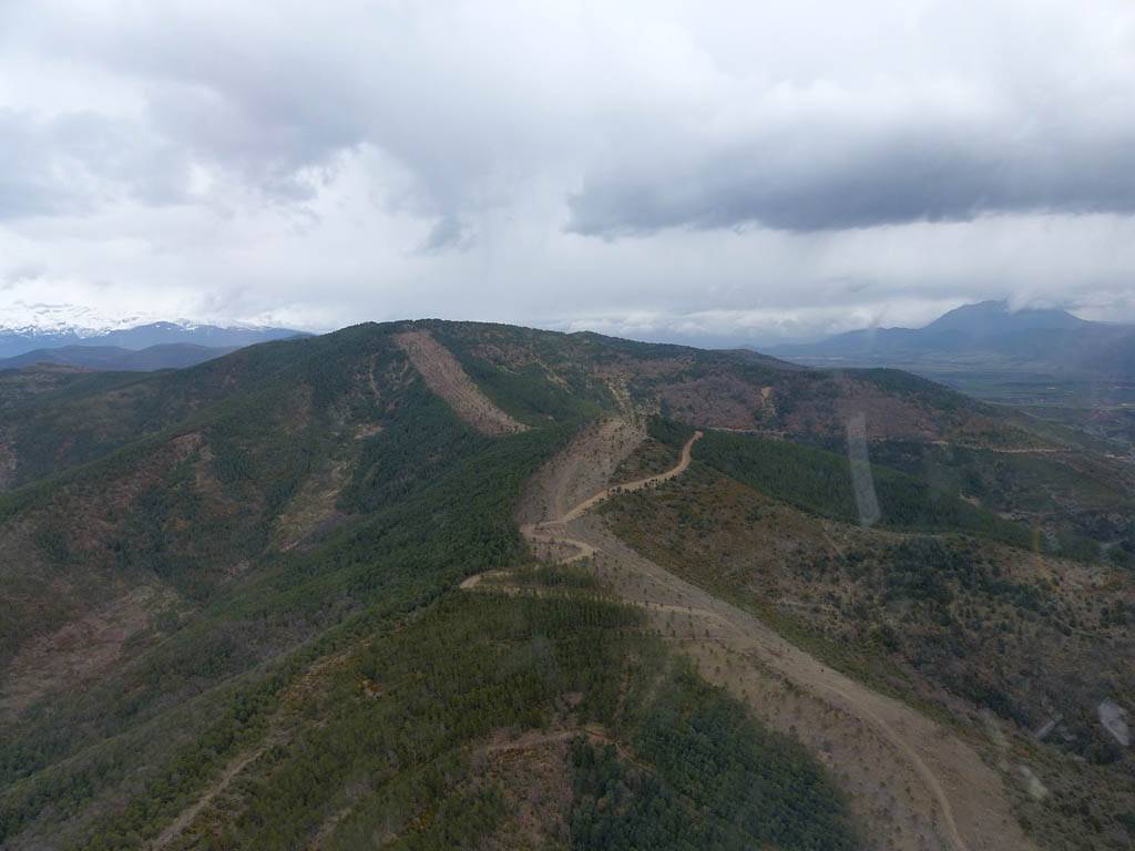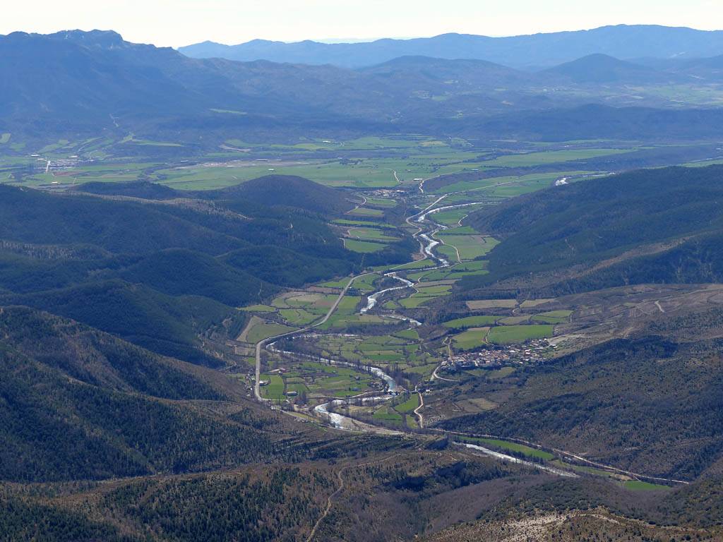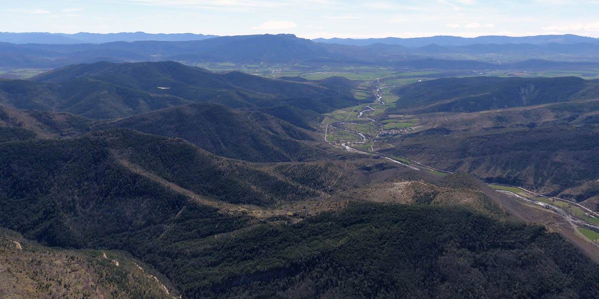 | Looking up the Hecho Valley from its mouth near Stage 1. | Looking back towards the airfield from Stage 1. | Cloud capped Cuculo to the South with Santa Cilia below it. | Looking East along a fire break to the Stage 1 summit. | Another view up the Hecho valley as we soar near Stage 1. |