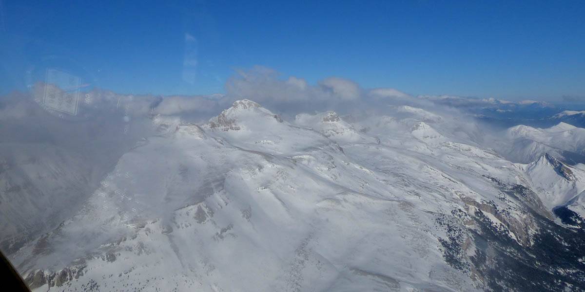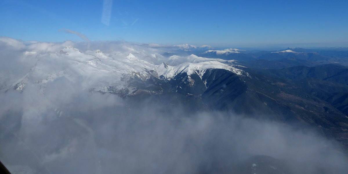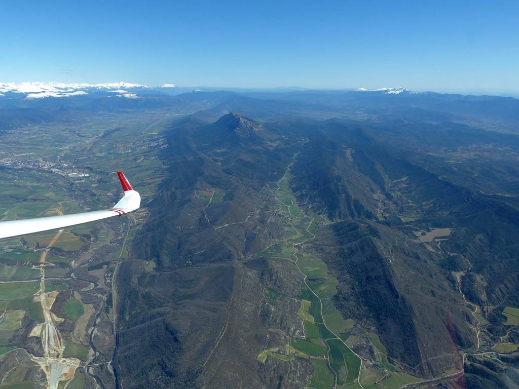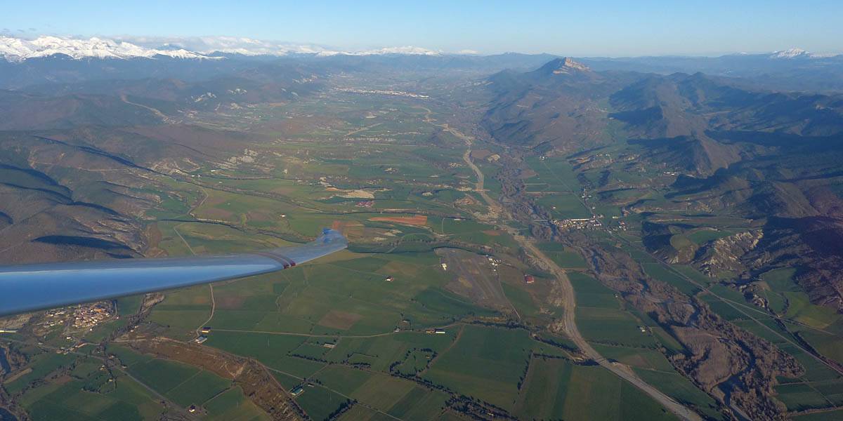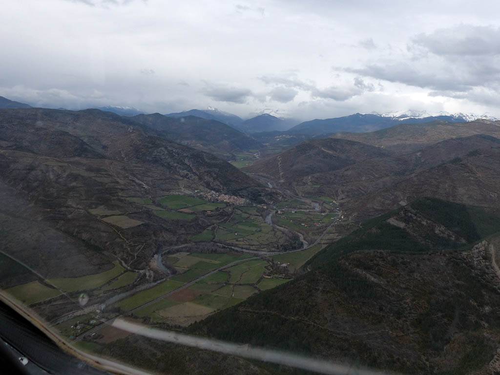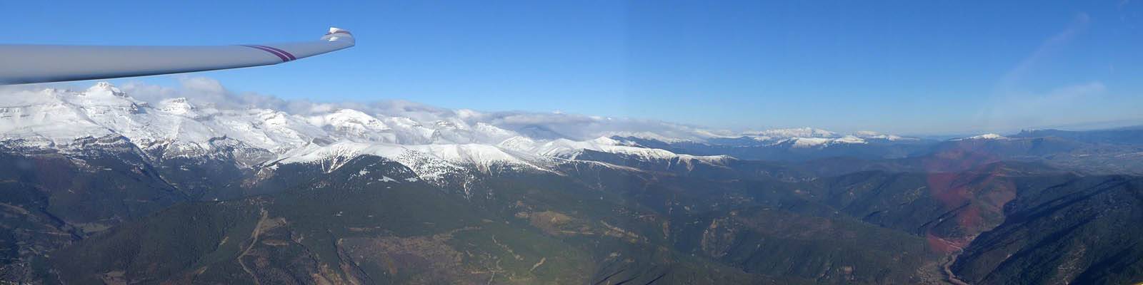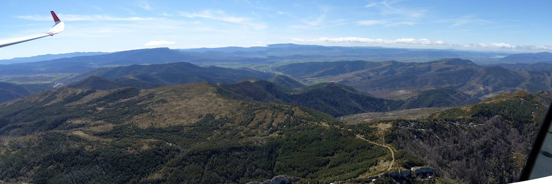 | Dave and I at FL195. Why do I always get my canular wonky? | Looking South towards the Jaca valley from up high. | Looking West along the foothills as we start to descend. | More spectacular views Northeast to the mountains. | ||