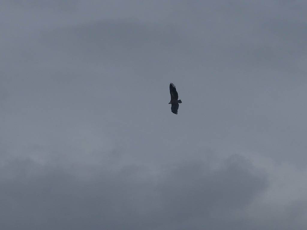 | Shower clouds to the Southeast between here and Jaca town. | Vulture. These burds are fantastic lift markers. | Looking West to a showery Yesa Reservoir. | Stage 3 and the high peaks looking rather moody in the overcast conditions. | John and I having fun in Spain. |