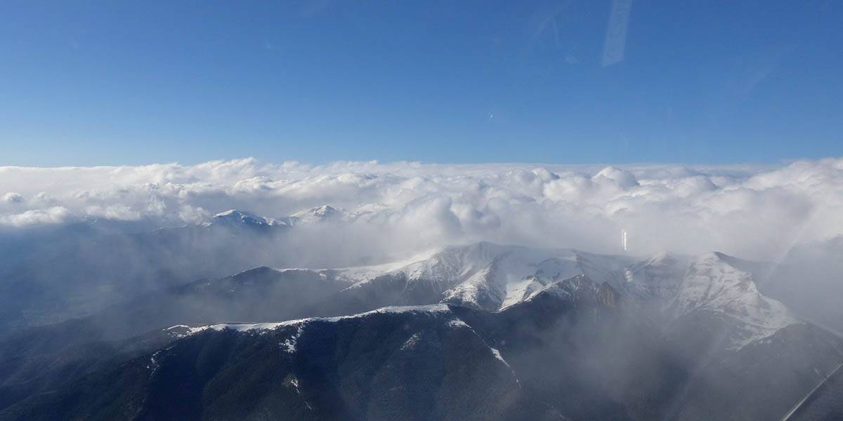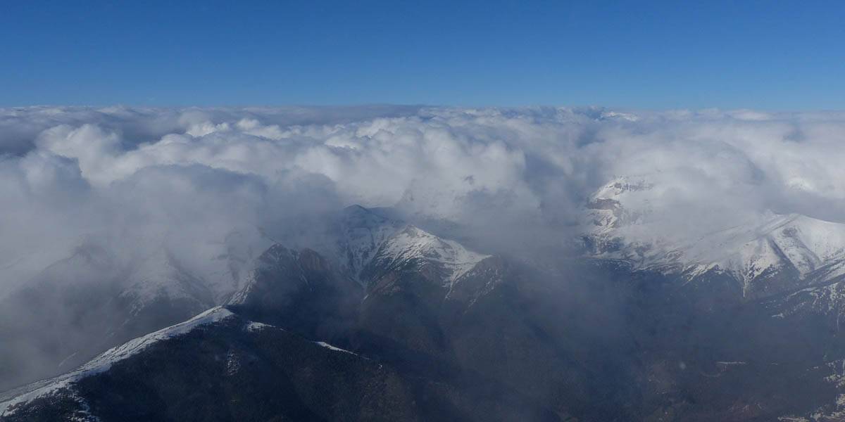| Flying Eastwards from the Stage 3 area towards Canfranc. | Peering over rotor clouds towards the Canfranc valley. | More awesome mountain views. | ||