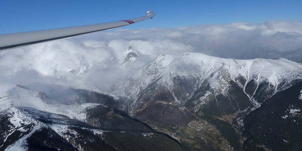 This was my favourite flight of the trip. I was first up with Dave in the Duo Discus. We launched soon after 11:30AM and released near Stage 1 where there was gentle wave lift. We played around there for a while climbing from 6000 to 10,000 feet. Then we jumped upwind to other wave bars, playing around near clouds before eventually finding good wave lift. From about 14,000 feet we moved upwind to the North again to somewhere near Stage 3 where better defined lenticular clouds were. Here the wave was fairly steady at 4-5kts in the best areas all the way to FL195. It was -18C up here. We were way above most of the cloud tops, and looking into France it was 8/8 cloud cover there as well as over the peaks. After a photo op we descended fairly quickly. We paused at 15,000 feet and 11,000 feet to let the gel coat warm up. At 10,000 feet we explored another wave bar for info for the next pilot. Then after running West along it at speed and exiting left through a gap to the Jaca valley near Santa Cilia we descended and landed after exactly 2 hours aloft.