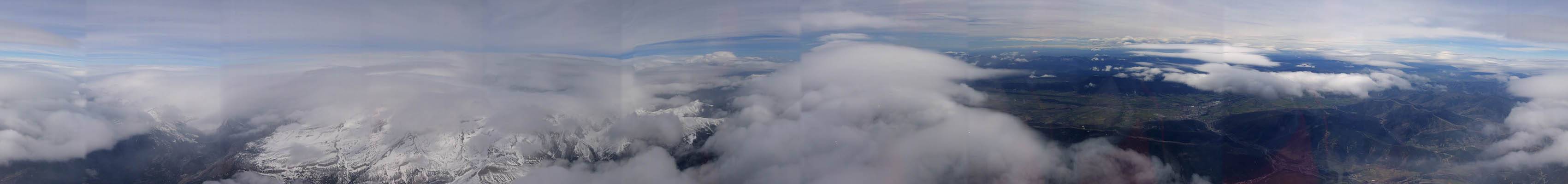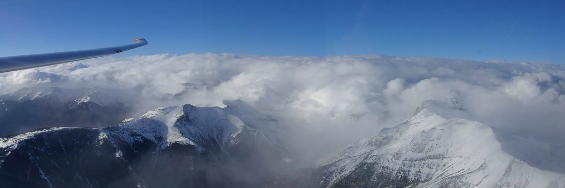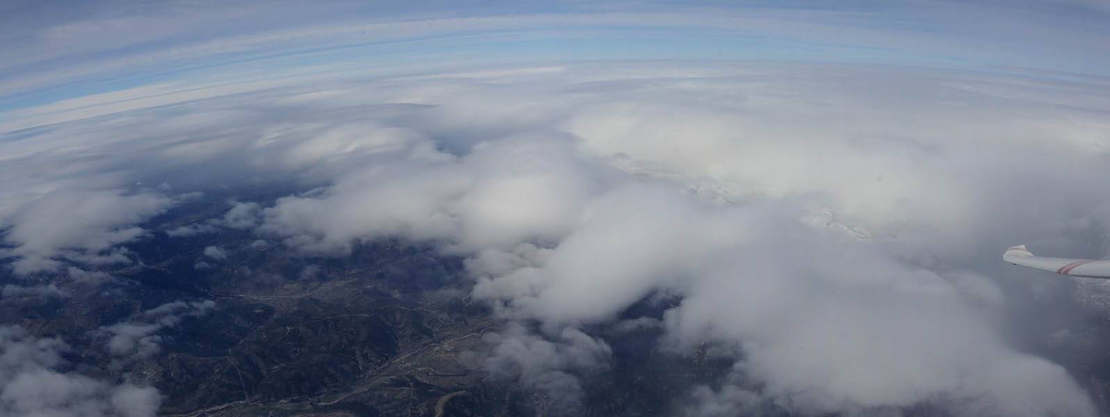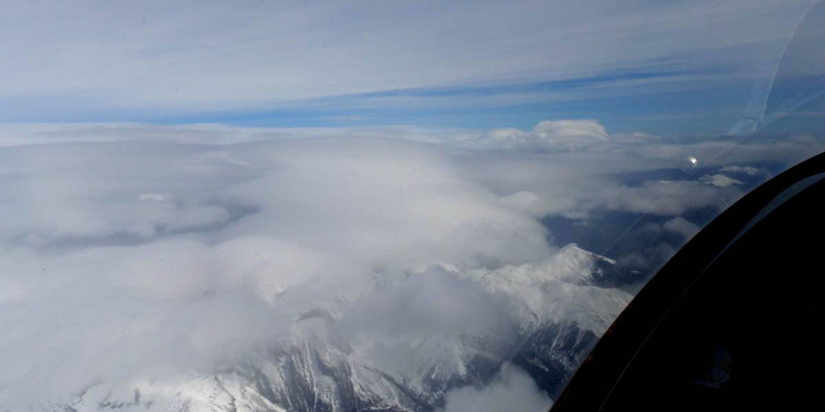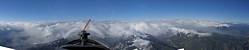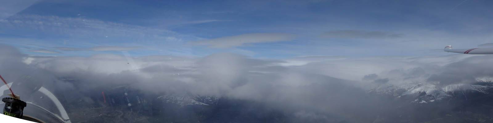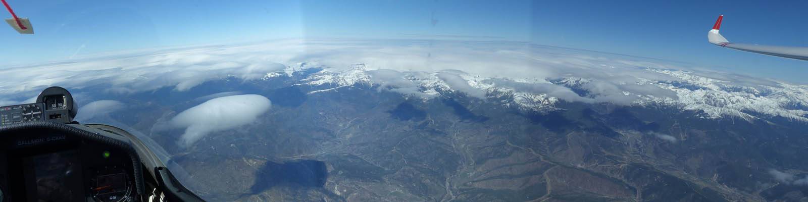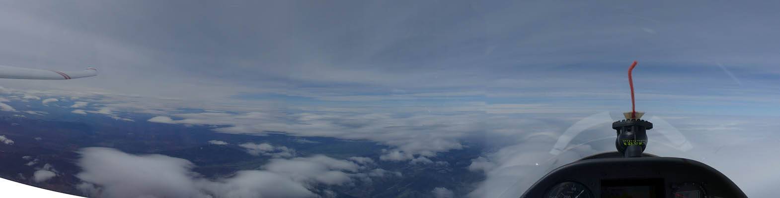 | 360 degree panorama as we climb towards FL195. | We did it! FL195. Still climbing at 4kts. | Up here we are well above the wave bars. | Thick cloud persists North of the peaks. |