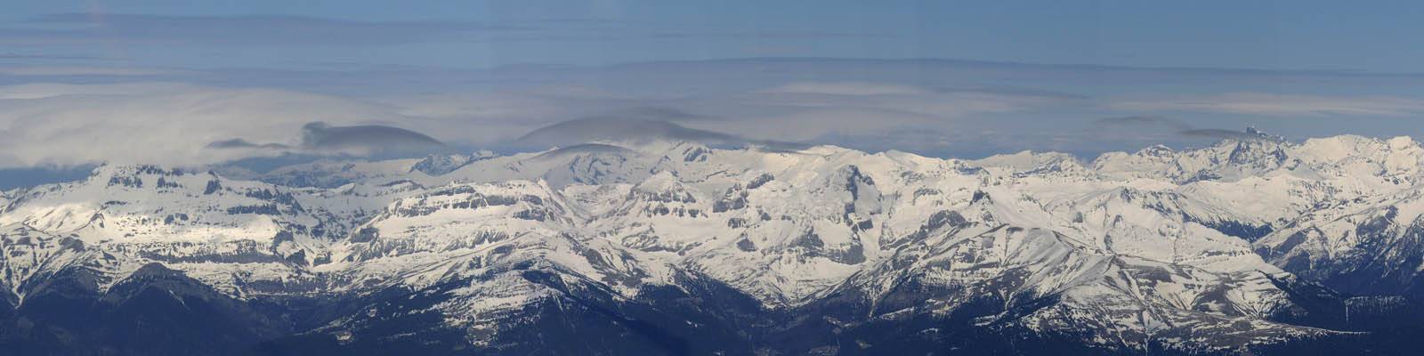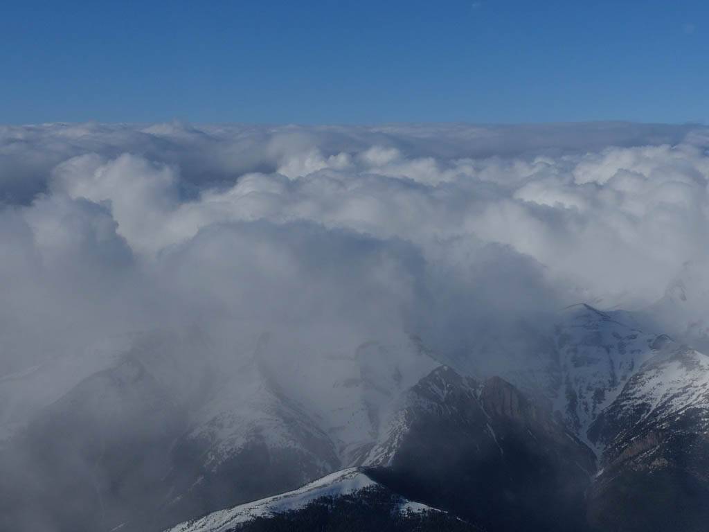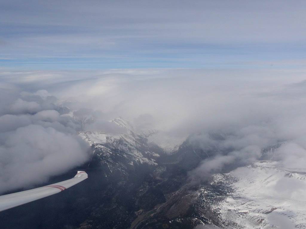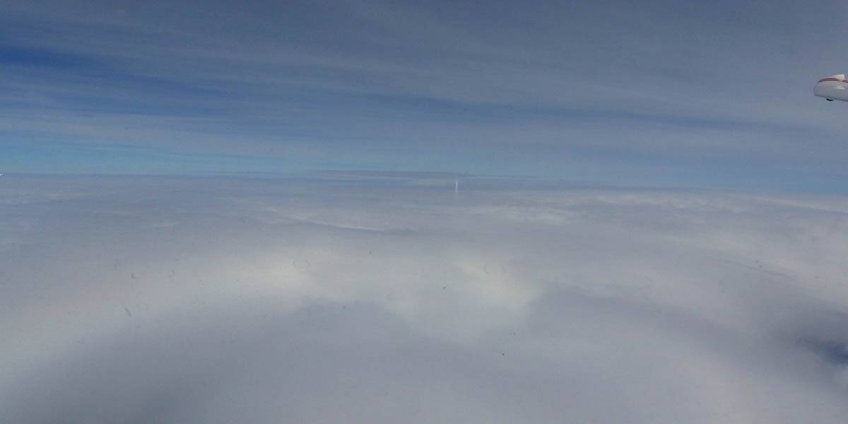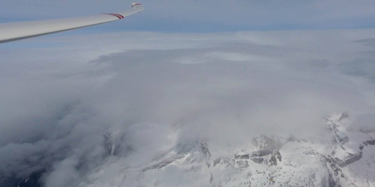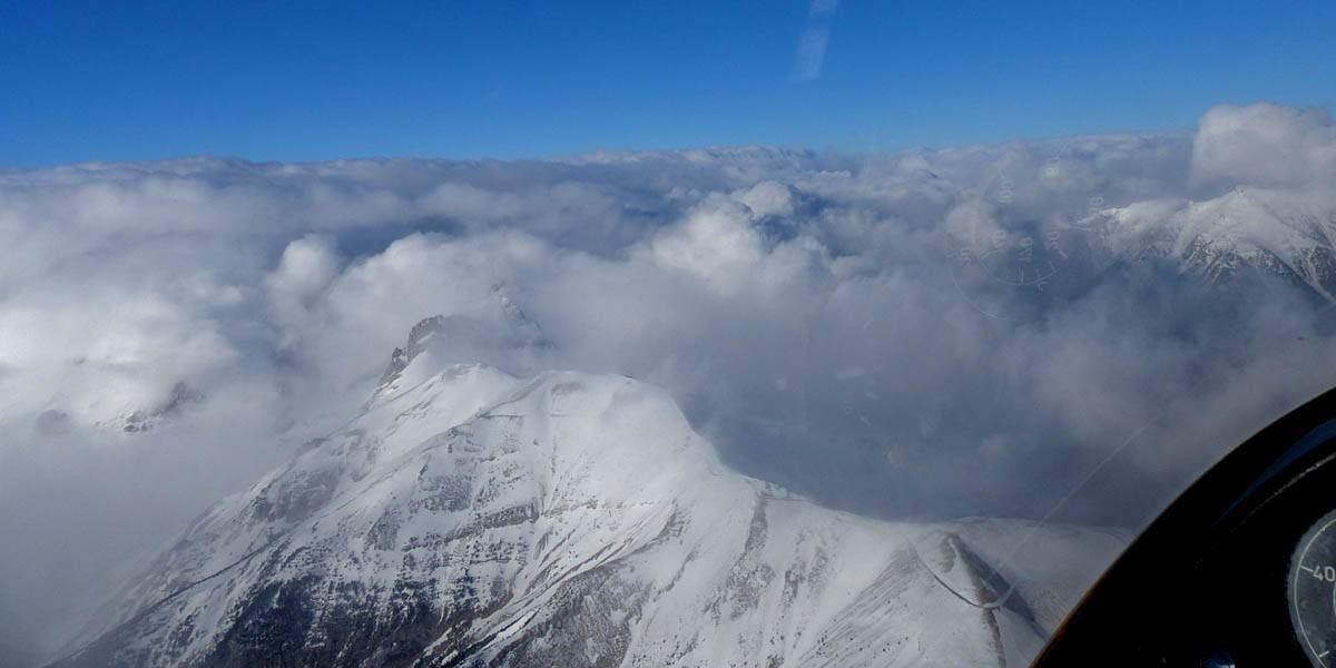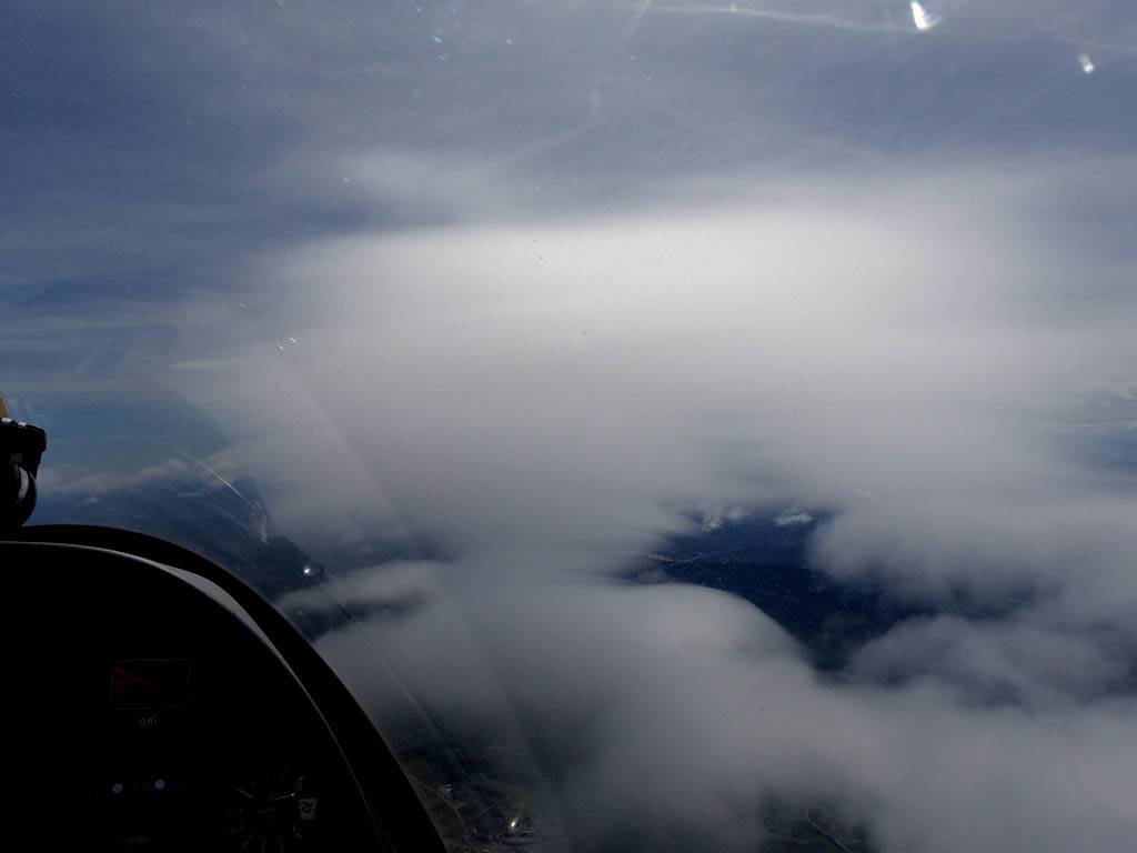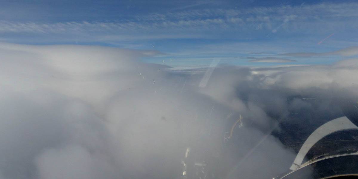 | 360 degree panorama as we climb towards FL195. | We did it! FL195. Still climbing at 4kts. | Up here we are well above the wave bars. | Thick cloud persists North of the peaks. |