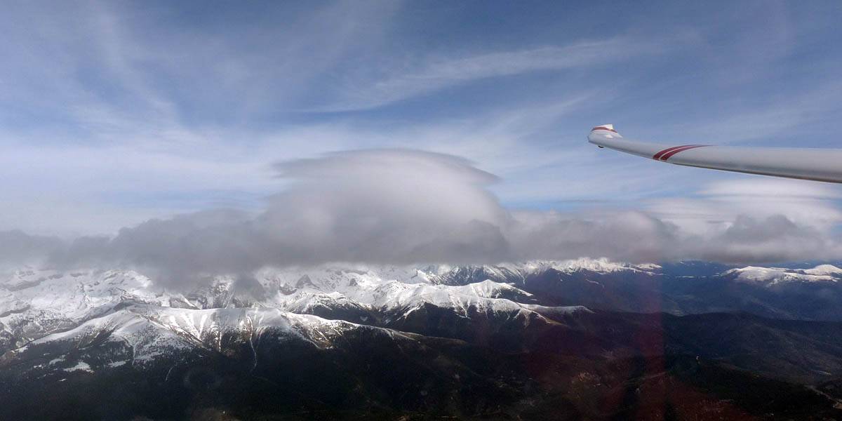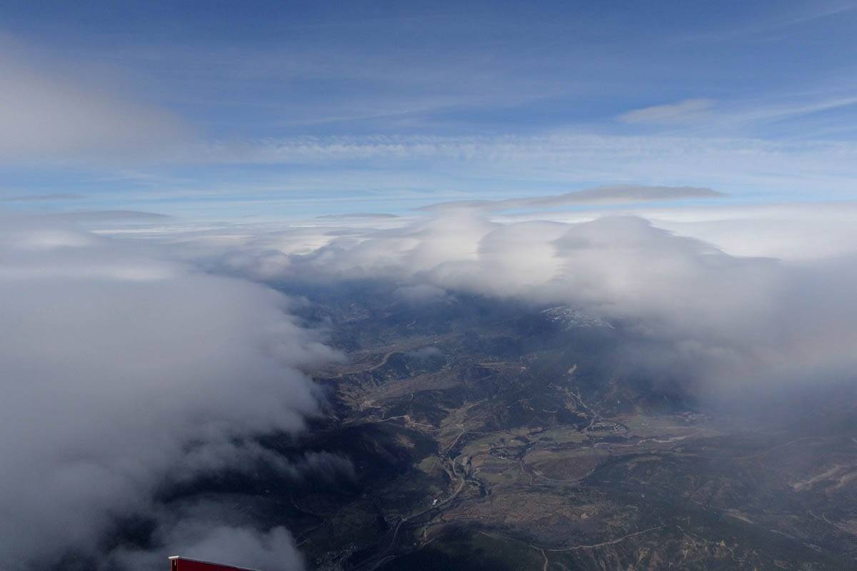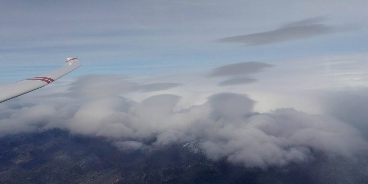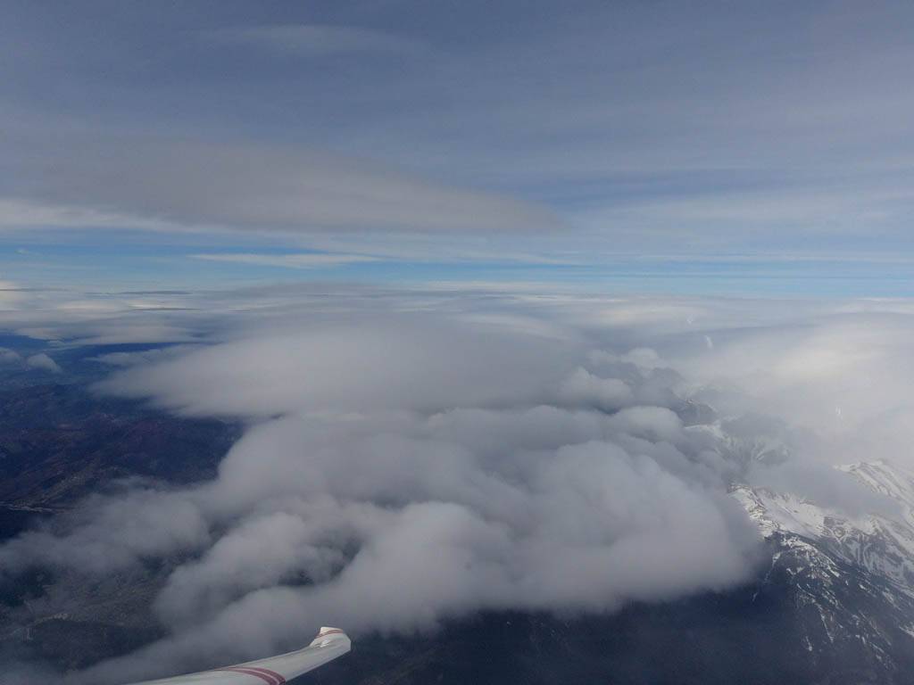 | Wave bars starting to form as the air gets moister. | Looking down at the airfield, Santa Cilia and Cuculo from 15,000 feet. | Exploring the forming lenticulars. | Behind us a lenticular marks the wave that we had been soaring in. | Descending past lenticulars as we head down for the next pilot. |